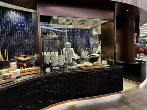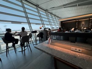 We had the option of either visiting the Asiana Business Lounge or the Singapore Airlines’ SilverKris Lounge, as Asiana Airlines is part of the Star Alliance network. When we visited the Asiana Lounge during our flight from Incheon to Singapore in March of this year (read about my lounge experience here), we found the lounge to be very disappointing. Therefore, we opted to use the Singapore Airlines SilverKris Lounge, located near Gate 29, instead. The main part of the SilverKris Lounge exudes a bright and airy feel, thanks to the use of white in the furniture and walls, as well as its placement next to the windows that look out onto the apron. The earthy colour used on the walls and the warm lighting exude a cosy vibe, while the marble used on the tables, buffet counter, and bar counters gives a luxurious vibe. The dining tables are mainly arranged against the walls in the lounge, while the lounging seats are arranged in the centre. The workstations, in the form of long tables with individual power outlets, were dotted around the lounge. The first thing that caught my attention was the bar island in the middle of the lounge, where cocktails and drinks were being made on the spot. The buffet counter, offering more options than the Asiana Lounge next door, features five hot food options and is located by the walls opposite the bar.
