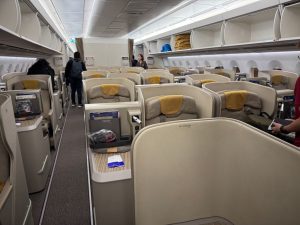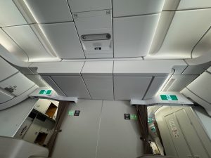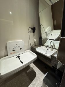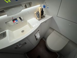 Two lavatories serving the 30 Business Class passengers are located at the front part of the aircraft. The lavatories felt a little cramped, but I still found sufficient space to use the bathroom. The plastic materials used in the lavatory do not lend it a premium feel. I wouldn’t have thought this lavatory served Business Class passengers if not for the additional amenities such as dental kits, combs, and mouthwash on top of the L’Occitane hand lotion and facial mist.