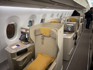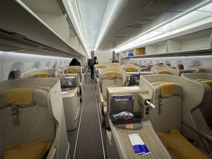 Asiana Airlines A330-300 Business Class cabin is decked in beige and yellow colours