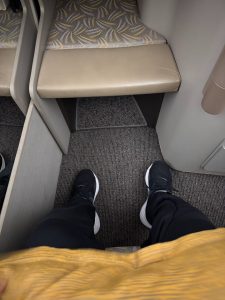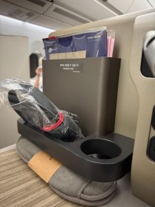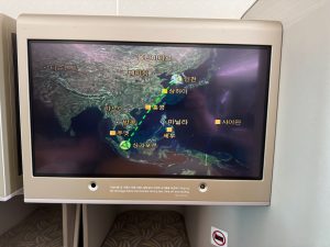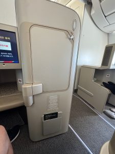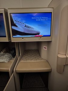 Storage is perhaps the biggest issue on Asiana Airlines Business Class flights, as I experienced during my previous flight on the A350-900 and this flight on their A330-300. However, I thought there was slightly more storage space in Asiana Airlines’ A330-300 Business Class. The only storage in these seats is limited to the small cubby hold underneath the inside of the armrest in the centre console. This small cubby hole is sufficient for me to place my passport, mobile phone and charging cables. Additionally, a two-tiered cubby hole is located in front of the seat, offering us more storage options. Passengers with tablets can stow them in the seat pocket during take-off and landing, which is sizeable enough to hold even a laptop. I did not find any space at the footwell to stow our carry-on due to the angled flatbed design of these Business Class seats. All carry-on items would have to be placed in the overhead bin.
