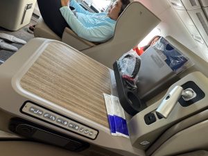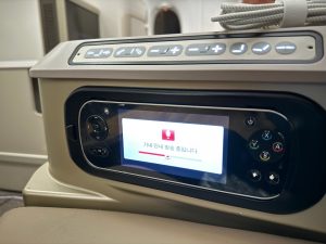 Asiana Airlines A330-300 Business Class seats have a pitch of 58″ and measure 21″ wide. As this is an older Business Class product, the seat can only be converted into an angled flatbed with a maximum recline of 170°. These Business Class seats come in three modes: upright, lounge, and flatbed. However, the seat control features four preset modes. There seem to be two lounge modes. In upright mode, the seat felt comfortable due to its thick padding. In flatbed mode, although not a true 180° flatbed, I did not experience any sliding effect due to the friction created by the fabric used in these seats. Lounge mode is my favourite mode, as it allows me to truly relax in the seat. The only difference between the two lounge modes is the angle of recline. There are numerous ways to configure lounge mode on Asiana Airlines’ A330-300 Business Class seats, rendering these two preset lounge modes somewhat redundant. We were able to adjust the seat to the desired angle and the extent of the calfrest extension using the numerous buttons on the seat control. There are even buttons to control the amount of lumbar support we want, which is unfortunately not available in the newer Business Class products.