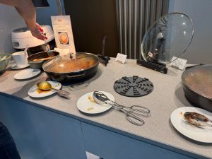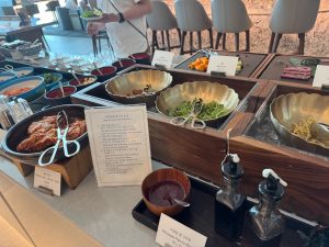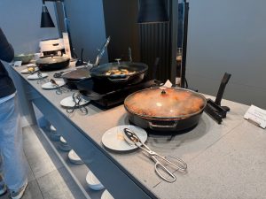 Singapore Airlines set up a small buffet line in the lounging area with mainly finger food and beverage stations