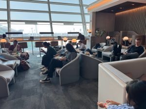 The lounging area in the SilverKris Lounge is mainly furnished with loungers and armchairs