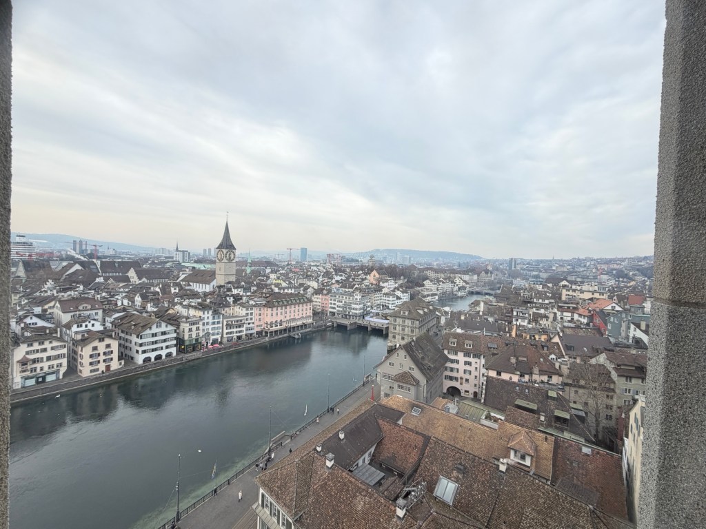 The biggest draw of us coming to Grossmünster was to climb up one of the two towers (entrance costs CHF5 and can be bought at the base of the tower). The 187 steps, 50m tower climb started with a steep and narrow spiral stone staircase that took us halfway up the tower, with the rest of the climb on wooden (and wider) staircases. I was initially deliberating whether the views from the top of the 50m tower were worth it, as the outdoor patio was closed to the public. However, my concerns dissipated when we reached the viewing platform on the tower. Here we were treated with amazing 360° views of the city. At the front, we could clearly see how the Limmat River divides the city into two and how it connects Lake Zurich to the city centre. At the back of the tower, we could see the right bank Altstadt and the surrounding hills. The views here were worth the CHF5 and the 187 steps climb. I personally liked the view of the riverside. After descending the tower, we chatted with the Malaysian female staff member at the ticketing counter, who generously shared with us the history of the church and places she thought were worth visiting around Zurich. Initially, we were torn between visiting Rhine Falls and Uetliberg, where one offers views of a majestic waterfall and the other offers views of the city and Lake Zurich. She convinced us that the Rhine Falls was a better visit. Before leaving the church, she recommended us to lunch at Zeughauskeller, a restaurant nearby famous for its affordable and good local food (she even brought us out of the church and pointed out the directions for us to go). We were originally planning to visit the Hirshen Platz and Predigerkirche, but as we were engrossed with our chat with the staff in Grossmünster, we found that we already missed our lunch and abandoned our last two stops on the list. Instead, we headed to the restaurant that the church staff recommended.
