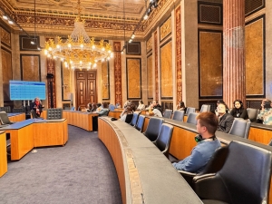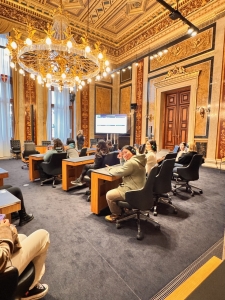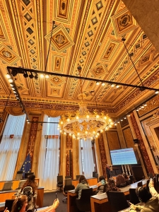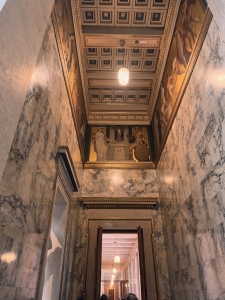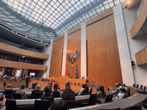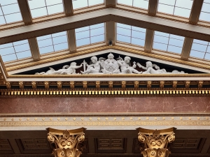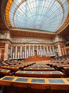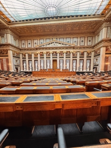 The Parliament Austria tour started with an introduction to the history of the Austrian Parliament on the first floor, where the Federal Assembly Hall is. We were told of how the political system in Austria transformed from monarchy to democracy and the Parliament’s representation of the different Austrian states. We did not pay too much attention to the narration as we were captivated by the Federal Assembly Hall behind the enclosed door. After the narration, we were brought to the hall we looked into a while ago. The Federal Assembly Hall hosts joint sessions of the two houses and presidential inaugurations. The semi-circular hall has a row of Roman columns and statues housed under a Greek-inspired roof as the backdrop of the main table. There are frescos painted on a gold background under the triangular roof-like structure. A large glass adorned the hall’s ceiling, allowing natural lights in. At the back of the hall was a row of alternating male and female statues seemingly holding up the second level of the hall. After being introduced to the Assembly Hall, we were brought to another room down the corridor, the Federal Council Chamber, which is used as the Federal Council meeting room. After we took our seats in the room (where Austrian politicians sit during meetings), our guide explained the purpose of this room and the composition of the parties within the Austrian Parliament. This chamber has a marble interior with two large Romanesque chandeliers hanging from the ceiling. The coat of arms of the nine Austrian states was painted across the ceiling.