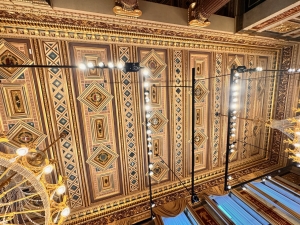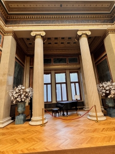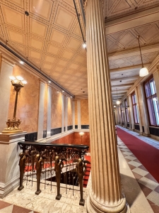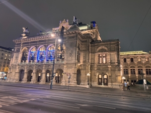 The next area we were shown was Marble Hall, a large space with relatively simple decor. Our guide told us this hall was rebuilt after WWII as it was one of the casualties of the war. The Royal Box was our next stop on this tour. The Royal Box was reserved exclusively for the royalty, which offered a spectacular view of the stage. We were invited to sit in the Royal Box while our guide narrated the purpose of the Royal Box and the reconstruction of the auditorium. After the Royal Box, we were guided to the Gustav Mahler Hall, a room for intermissions, concerts and special events. This room houses 13 tapestries produced over six years, depicting scenes from Mozart’s The Magic Flute. A short walk from Gustav Mahler Hall, we came to the Schwindfoyer, a small annexe beside the first floor of the Grand Staircase. Our guide told us this room was one of the surviving original parts of the Vienna State Opera. This room was elegantly decorated with paintings and carvings, most covered in gold, that left no empty spaces on the ceilings and parts of the wall. Hanging above each door that leads to the balcony are busts of famous composers. We found the busts of Mozart and Beethoven over some of these doors. Equally impressive is the balcony, which looked out into Ringstraße and served as the facade of the State Opera.