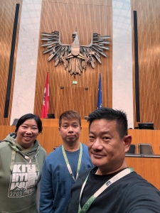 Our next destination on the Parliament Austria tour was the Colonnaded Hall through an antechamber, the Upper Vestibule. The Colonnaded Hall is a large hall with 24 marble pillars, topped with a glass roof, and is used as a venue for receptions. Through the Colonnaded Hall, we arrived at the Atrium, which connects to the main entrance to the Colonnaded Hall. There are two staircases on each side of the Atrium that link to the lower floors of the building. The left staircase (from the main door) is installed with statues of Zeus and four other Greek gods, while the right staircase has the statue of Posiden and four other Greek gods. From the opulent marbled tiles to these statues, the Atrium looked like an art museum. Through the Atrium and one corridor later, we arrived at the tour’s final stop – the National Council Chamber. This three-level chamber holds meetings of the National Council, and members of the public can sit in for these meetings. A large metallic Coat of Arms of Austria is hanging by the wall in front of the chamber. At the end of the tour, our guide encouraged us to take pictures at the speaker’s table in the centre of the room. Before the tour officially ended, our guide invited us to explore the parliament building. As we were a little hungry, we headed to the cafe on the top floor of the building to look for lunch. However, the cafe here only serves pastries and not proper meals, so we headed out of the building to look for lunch. The tour was interesting and unique, and definitely worth a visit.
