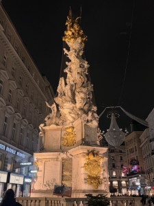 After leaving Hofburg Palace, we spotted a green dome church that sat at the end of a quiet side street along Graben while walking towards St Stephan’s Cathedral. We walked past this church two days ago. Since we had some time today, we decided to make a short detour to the church. The church’s facade is adorned with statues above its entrance and on its wall. The interior of the church surprises us. Despite its rather simple exterior, the inside of the church is decked with numerous delicately painted frescos coupled with detailed carvings on its ceilings. Every inch of the ceiling is either covered with paintings or carvings. The golden main altar stood out from the dark sand-coloured marble interiors; its lighting gave it a holy glow. As the church was not too big, we did not stay here for too long.