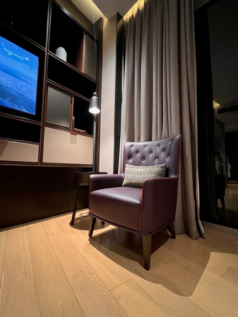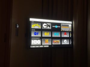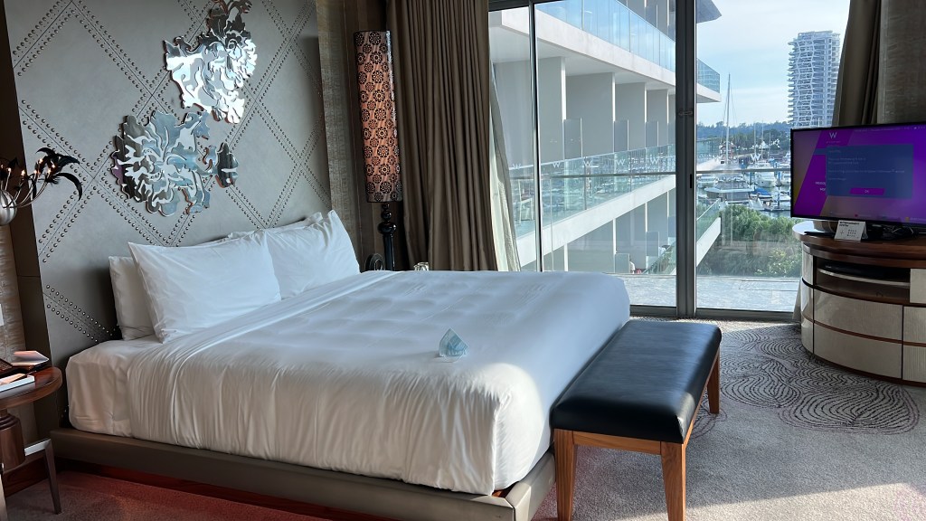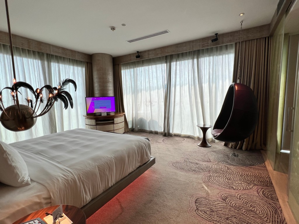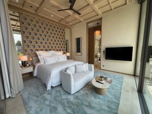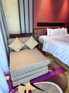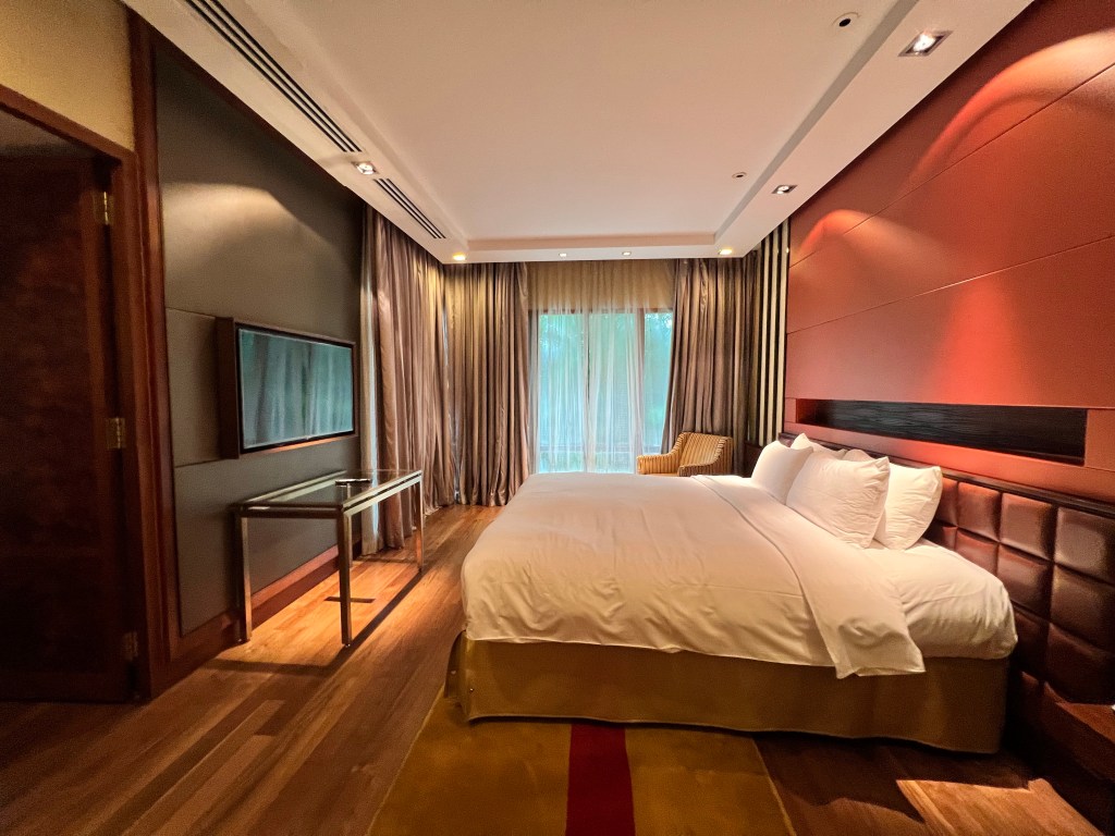 The sleeping area is also furnished with a two-seater sofa with an accompanying coffee table, placed in front of the king bed facing the pool area. I thought the placement of an additional sofa here improved the bedroom’s livability; we could sit in the bedroom pavilion and relax if the weather was bad outside. Another 55″ flatscreen TV with the same local and cable channels as the one in the living room is mounted on the wall at the side. This TV is mounted on a swivel that we used to swing to face the bed, allowing us to watch TV while lying on the comfortable bed.
