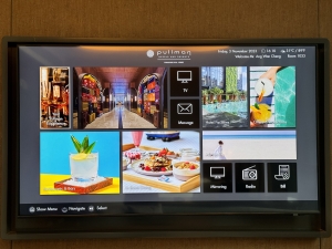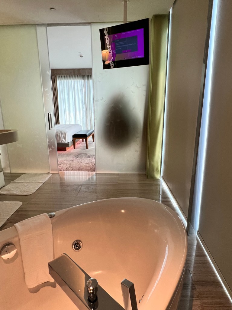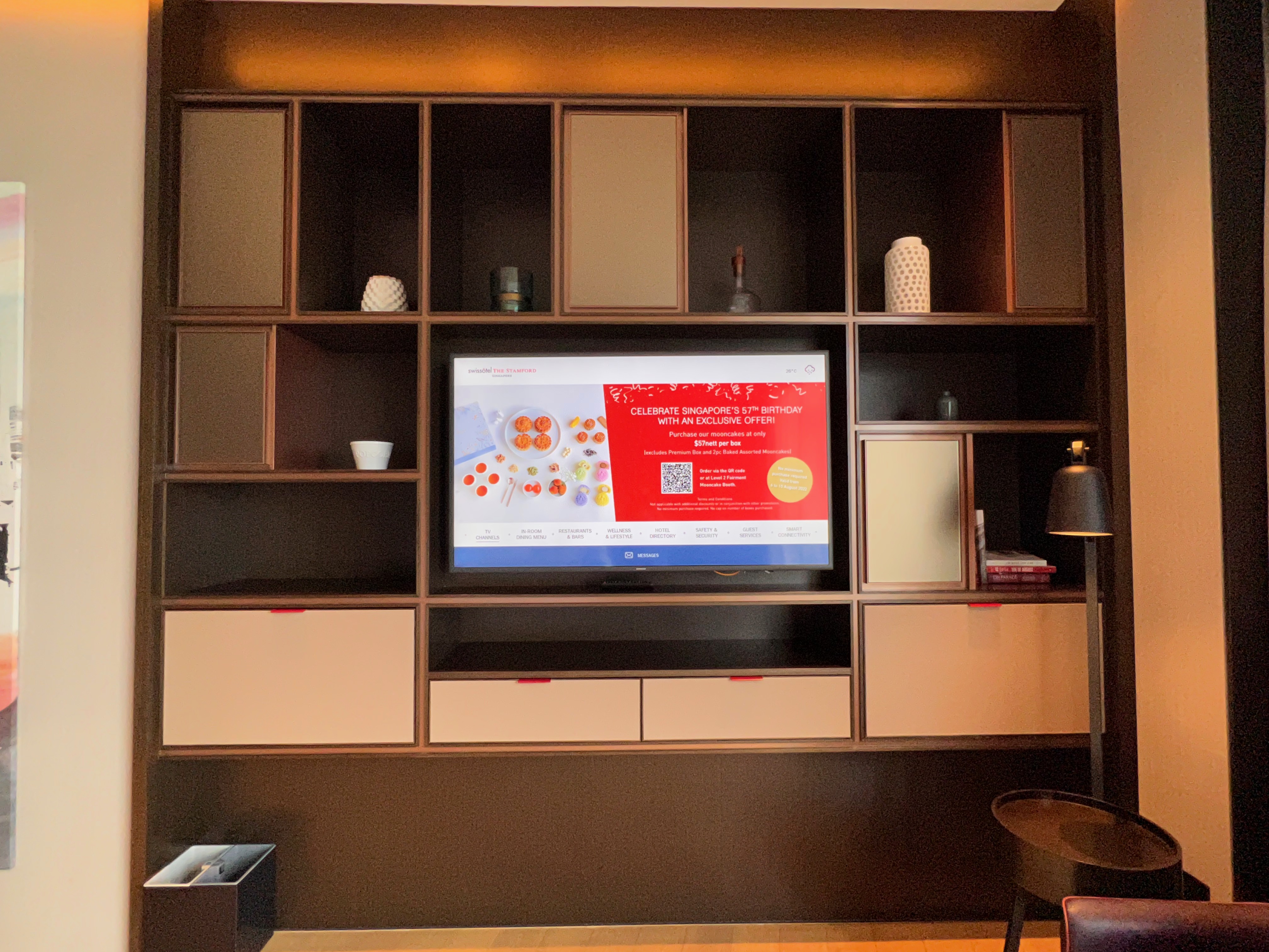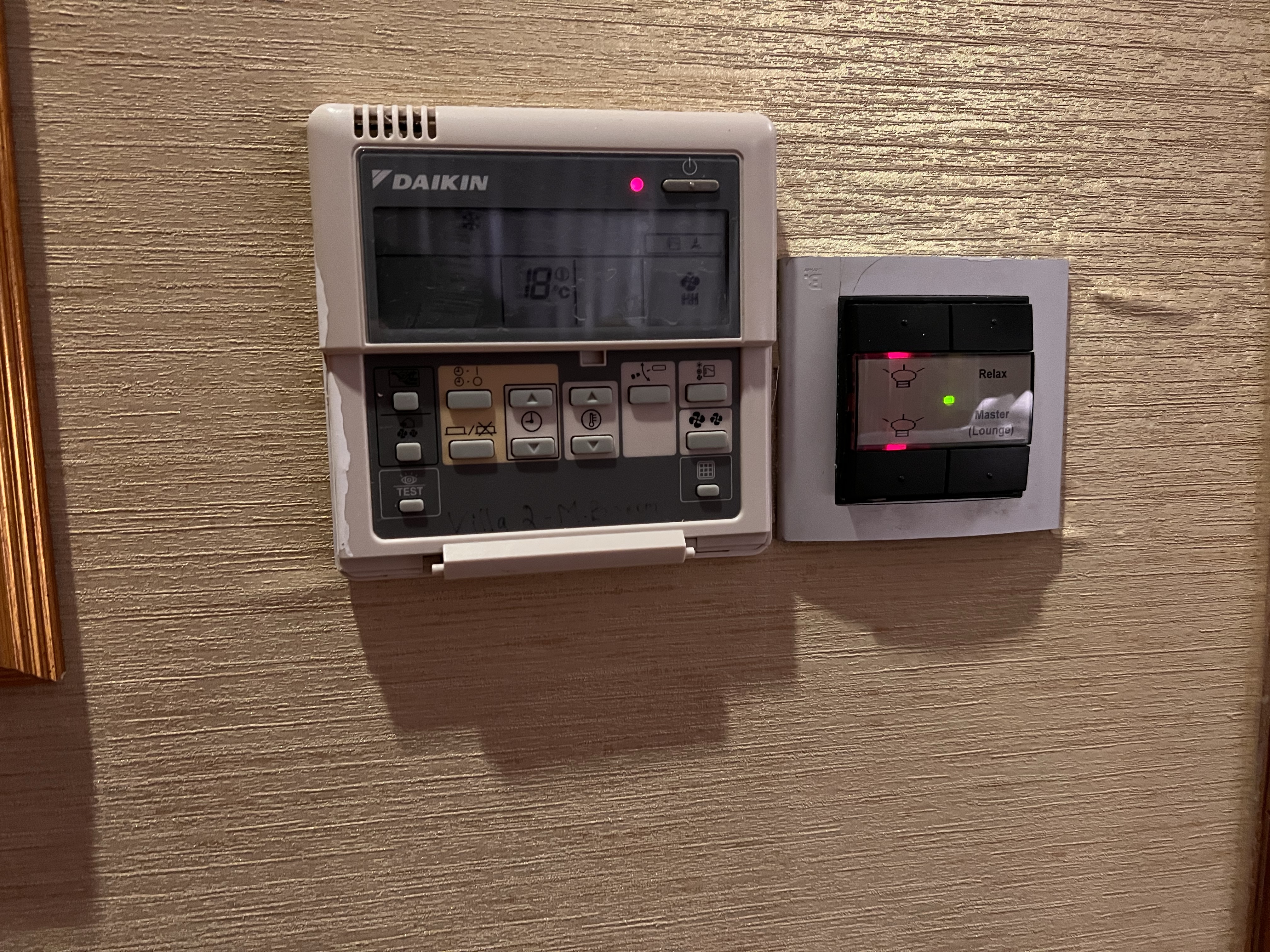 The sleeping area is also furnished with a two-seater sofa with an accompanying coffee table, placed in front of the king bed facing the pool area. I thought the placement of an additional sofa here improved the bedroom’s livability; we could sit in the bedroom pavilion and relax if the weather was bad outside. Another 55″ flatscreen TV with the same local and cable channels as the one in the living room is mounted on the wall at the side. This TV is mounted on a swivel that we used to swing to face the bed, allowing us to watch TV while lying on the comfortable bed.