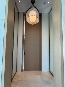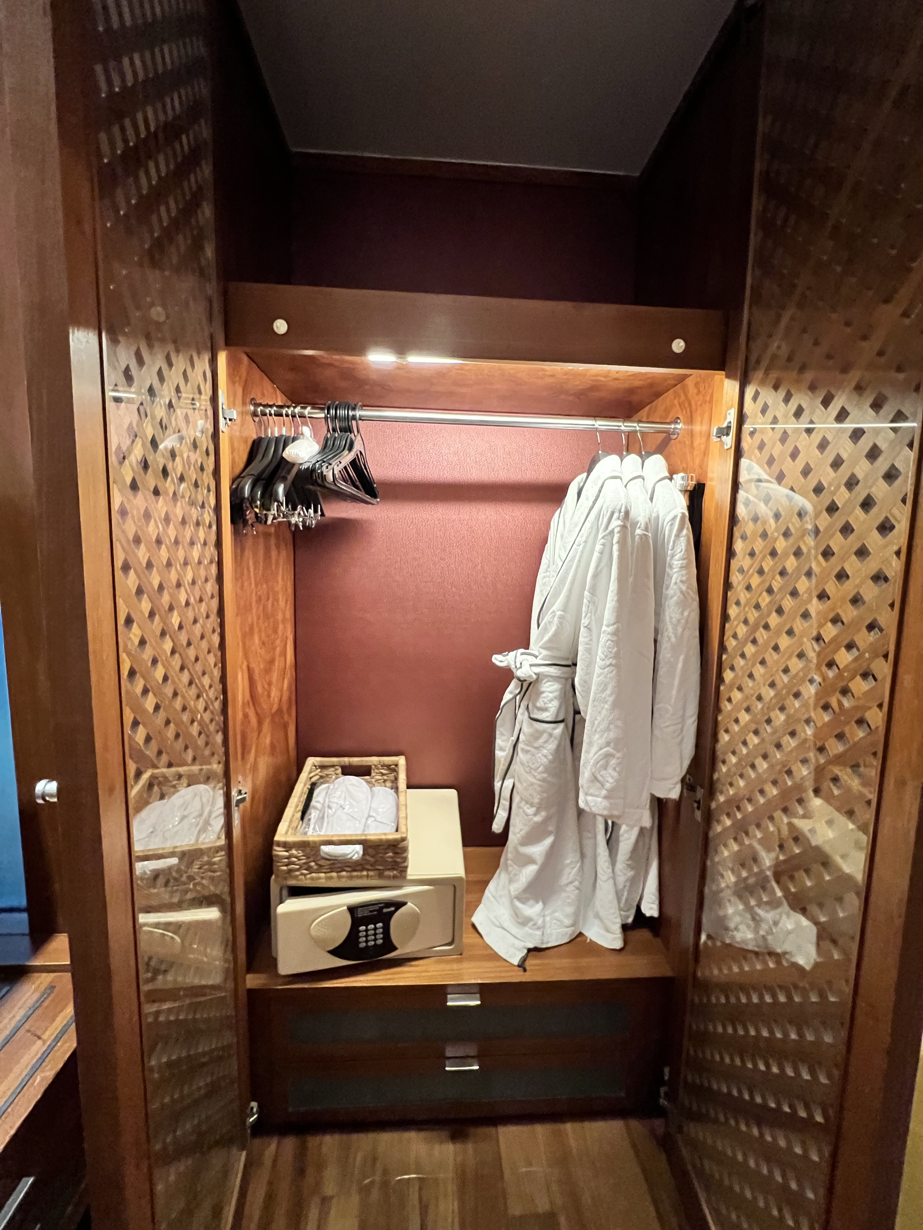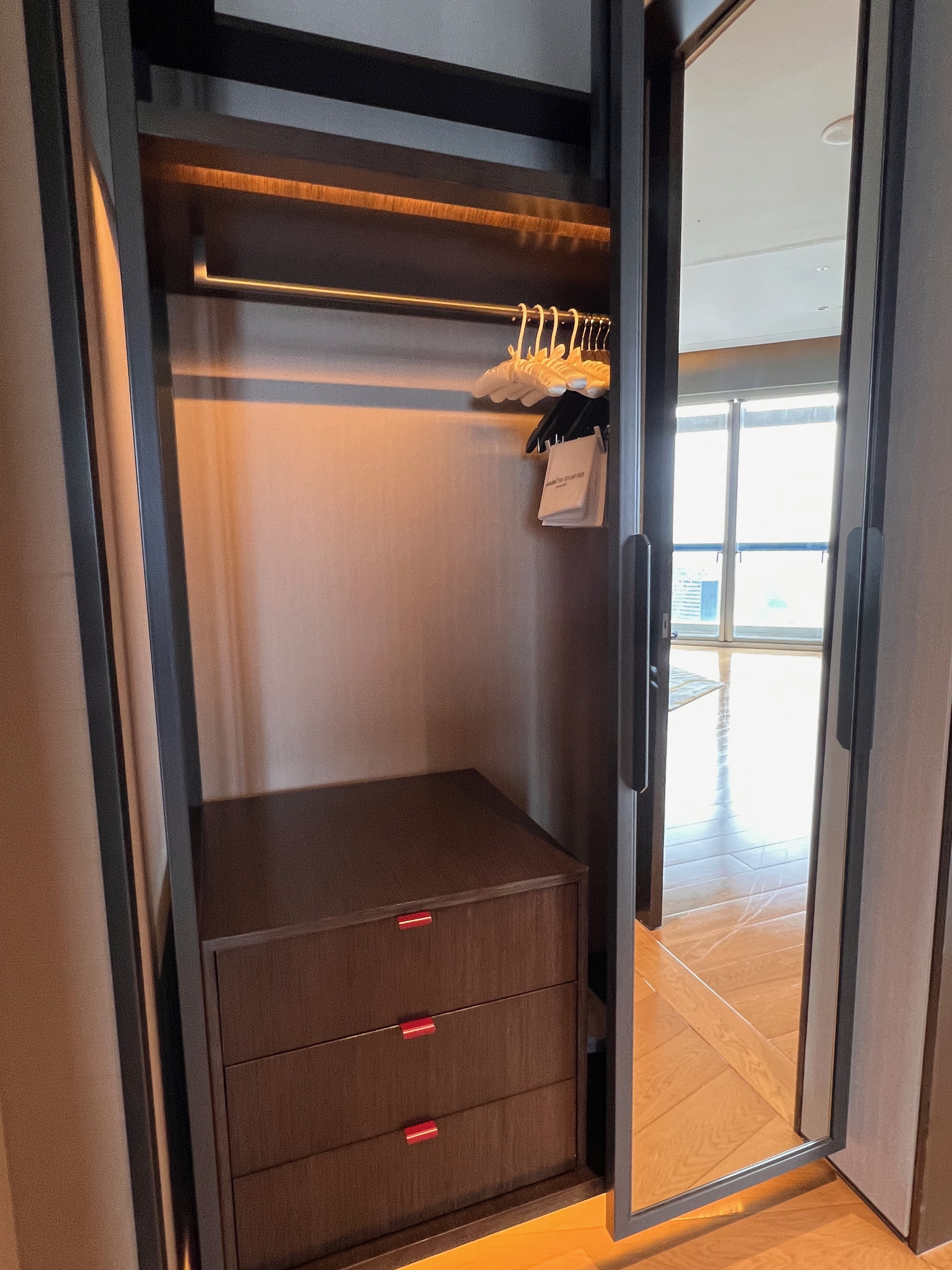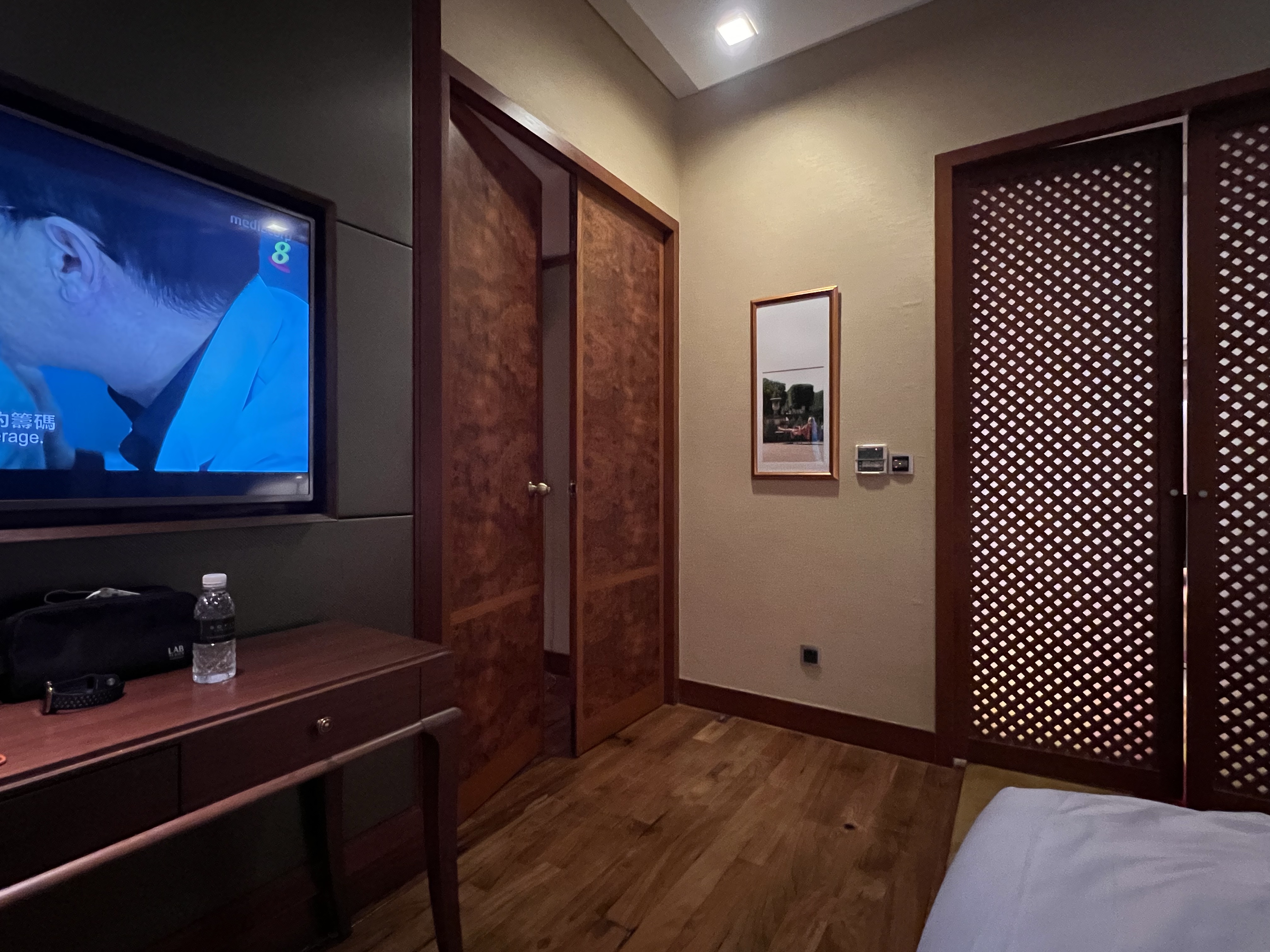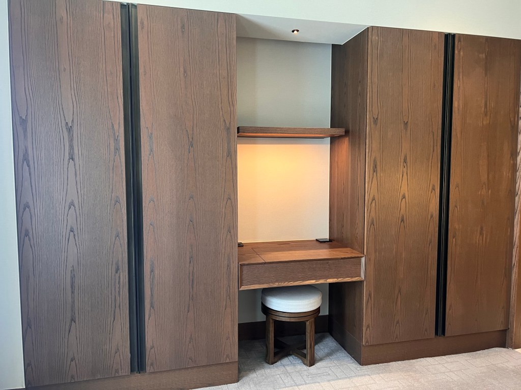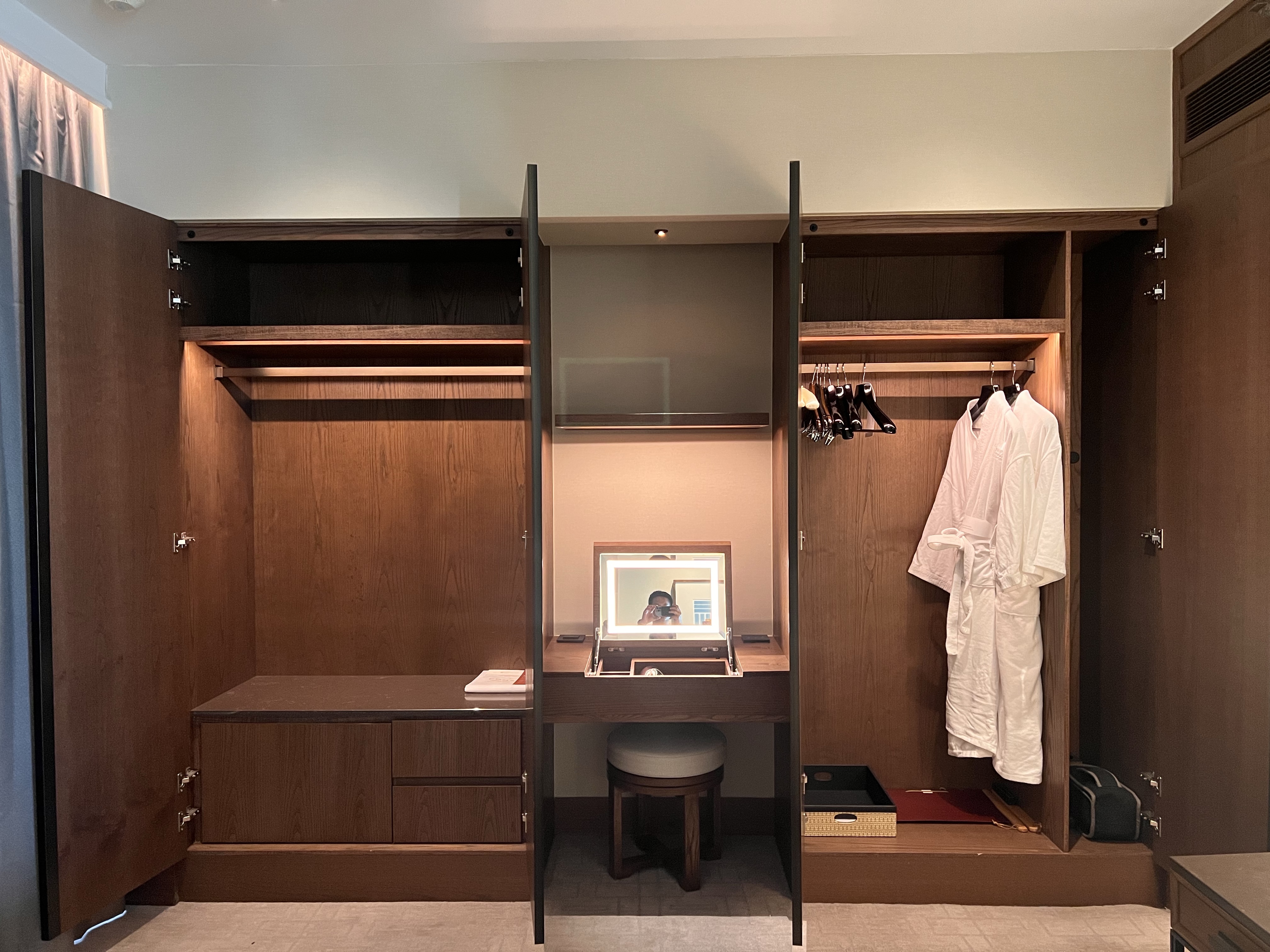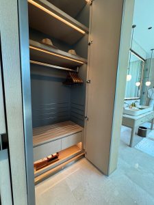 A large sliding wooden door separates the bathroom space from the sleeping area in the bedroom pavilion. Behind the sliding door lies a small section dedicated to the wardrobe, which gives us the feel of a walk-in wardrobe. Raffles Sentosa Singapore fitted two large wardrobes in this area, both with a similar design, with the only difference being the drawer. One of the wardrobes has a larger drawer below, where the in-room safe is hiding, while the other wardrobe is fitted with two deeper drawers where we can store smaller clothing items. The hanging light fitted in this pseudo walk-in wardrobe gave this space a luxurious vibe.