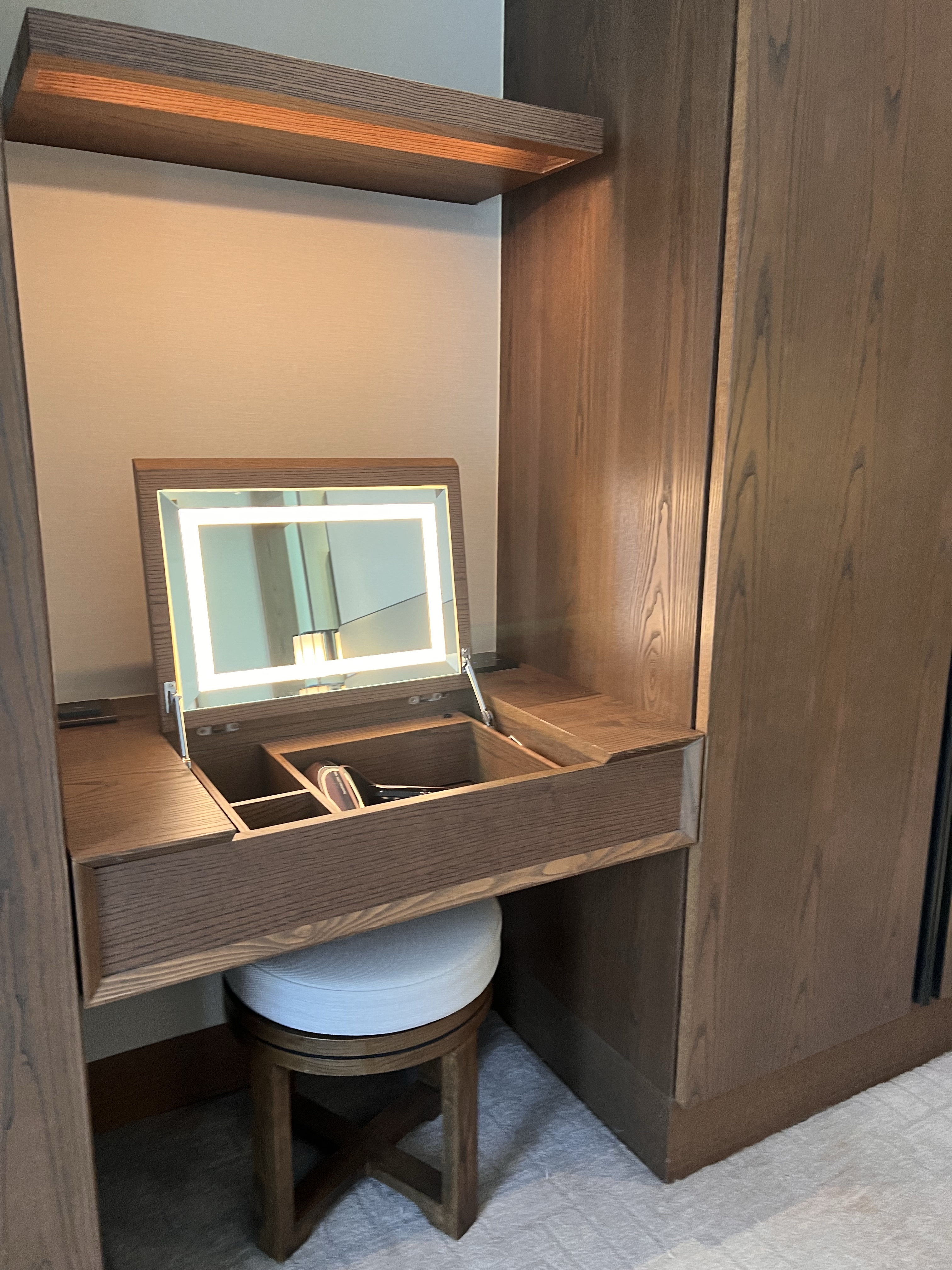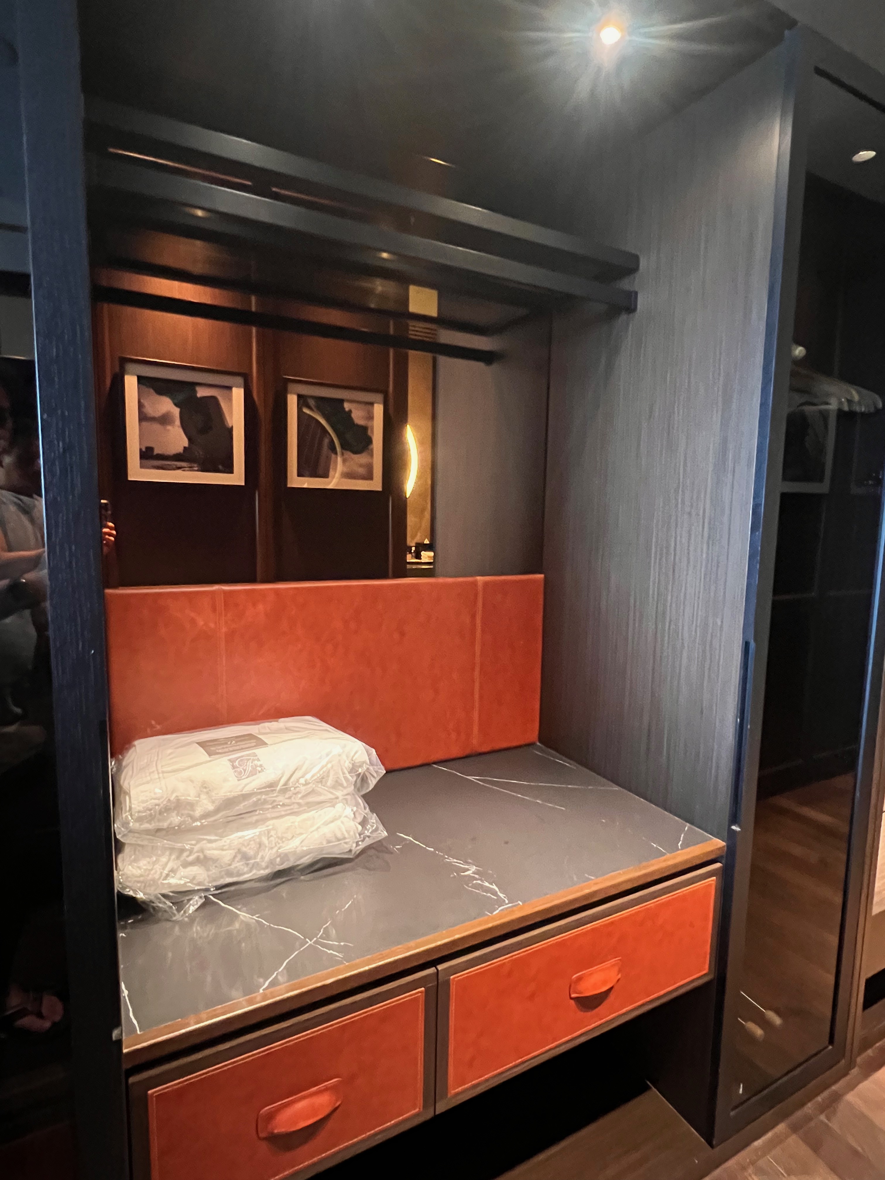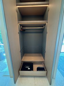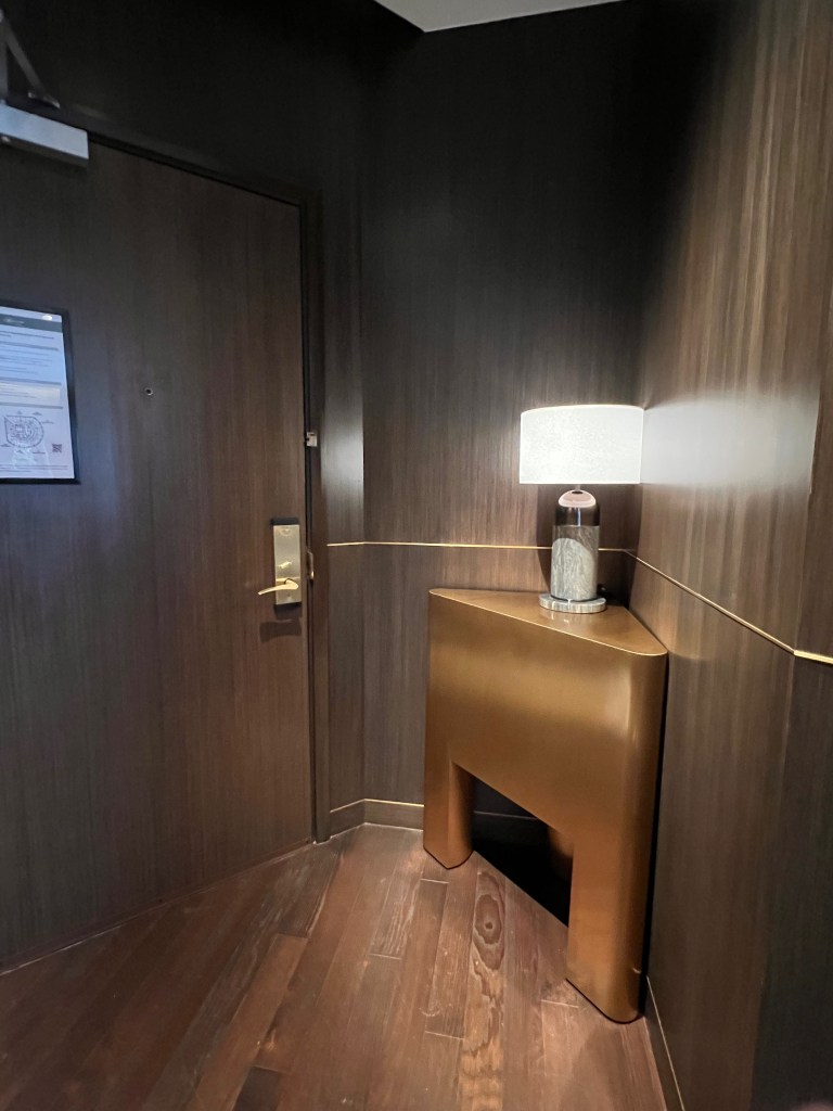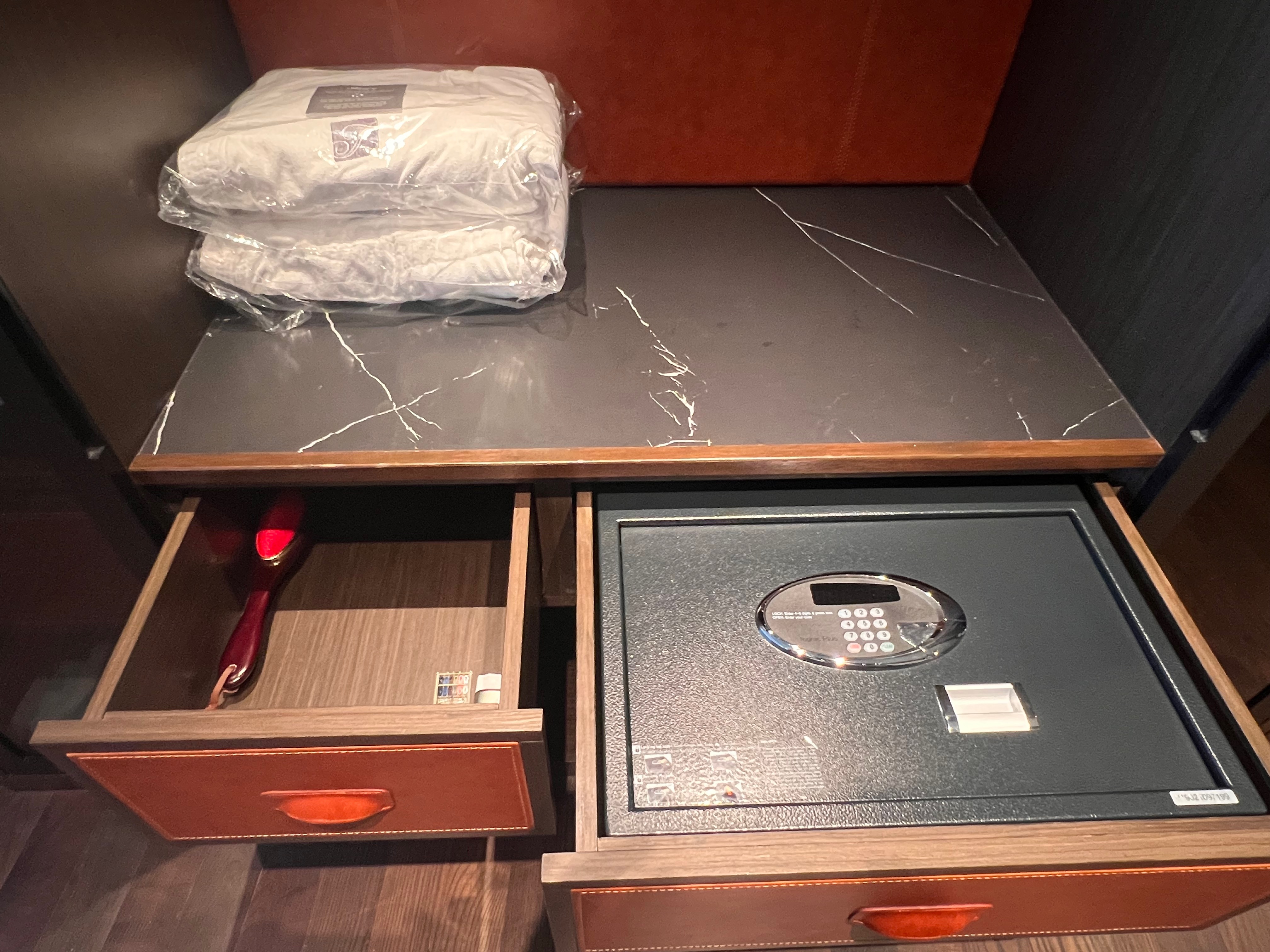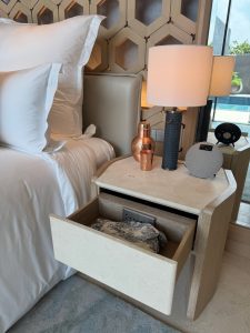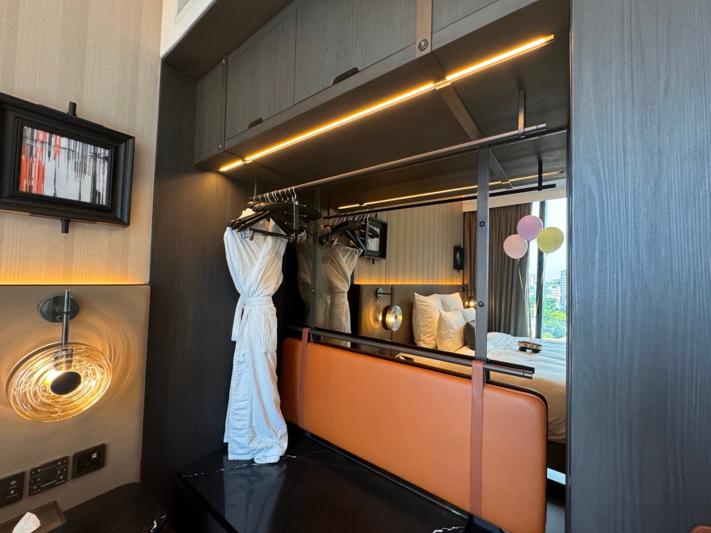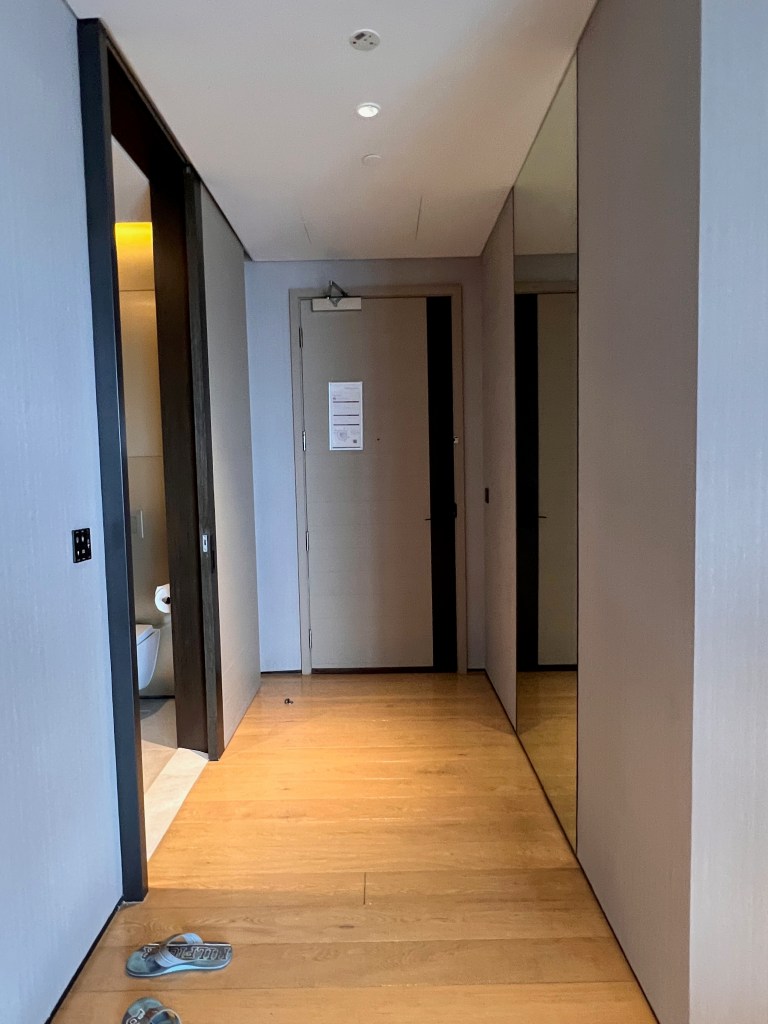 A large sliding wooden door separates the bathroom space from the sleeping area in the bedroom pavilion. Behind the sliding door lies a small section dedicated to the wardrobe, which gives us the feel of a walk-in wardrobe. Raffles Sentosa Singapore fitted two large wardrobes in this area, both with a similar design, with the only difference being the drawer. One of the wardrobes has a larger drawer below, where the in-room safe is hiding, while the other wardrobe is fitted with two deeper drawers where we can store smaller clothing items. The hanging light fitted in this pseudo walk-in wardrobe gave this space a luxurious vibe.