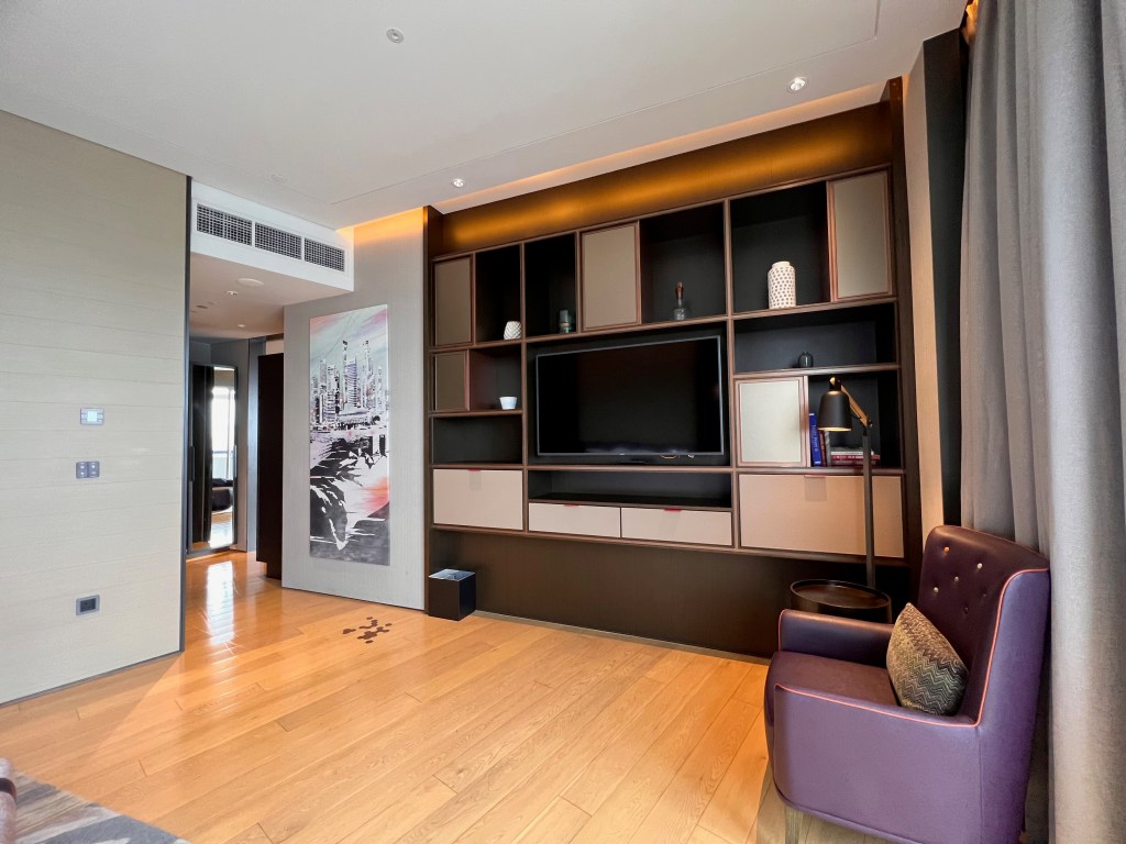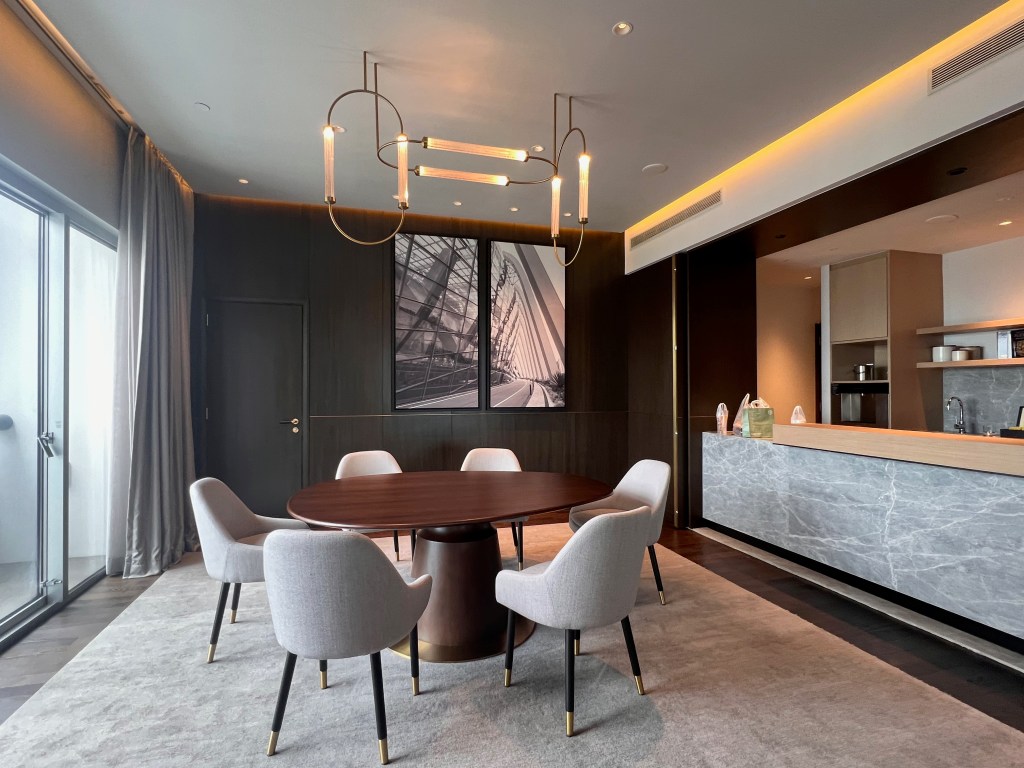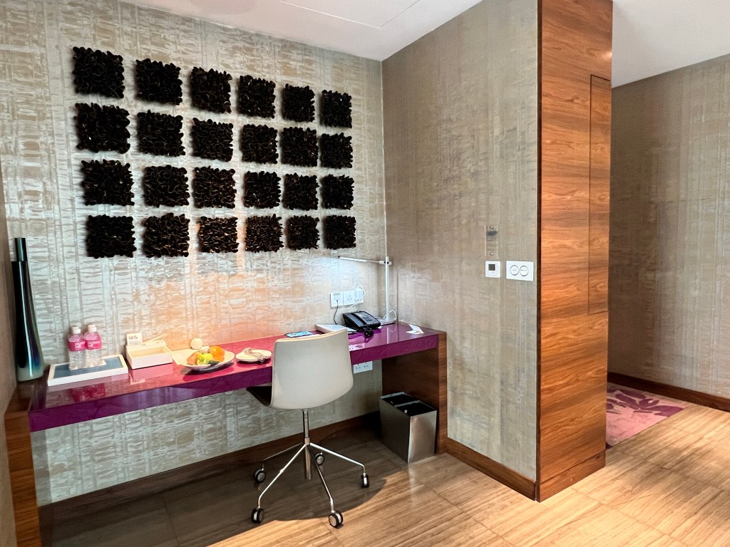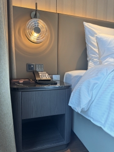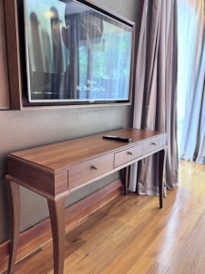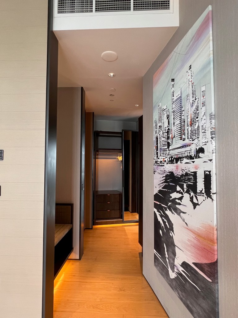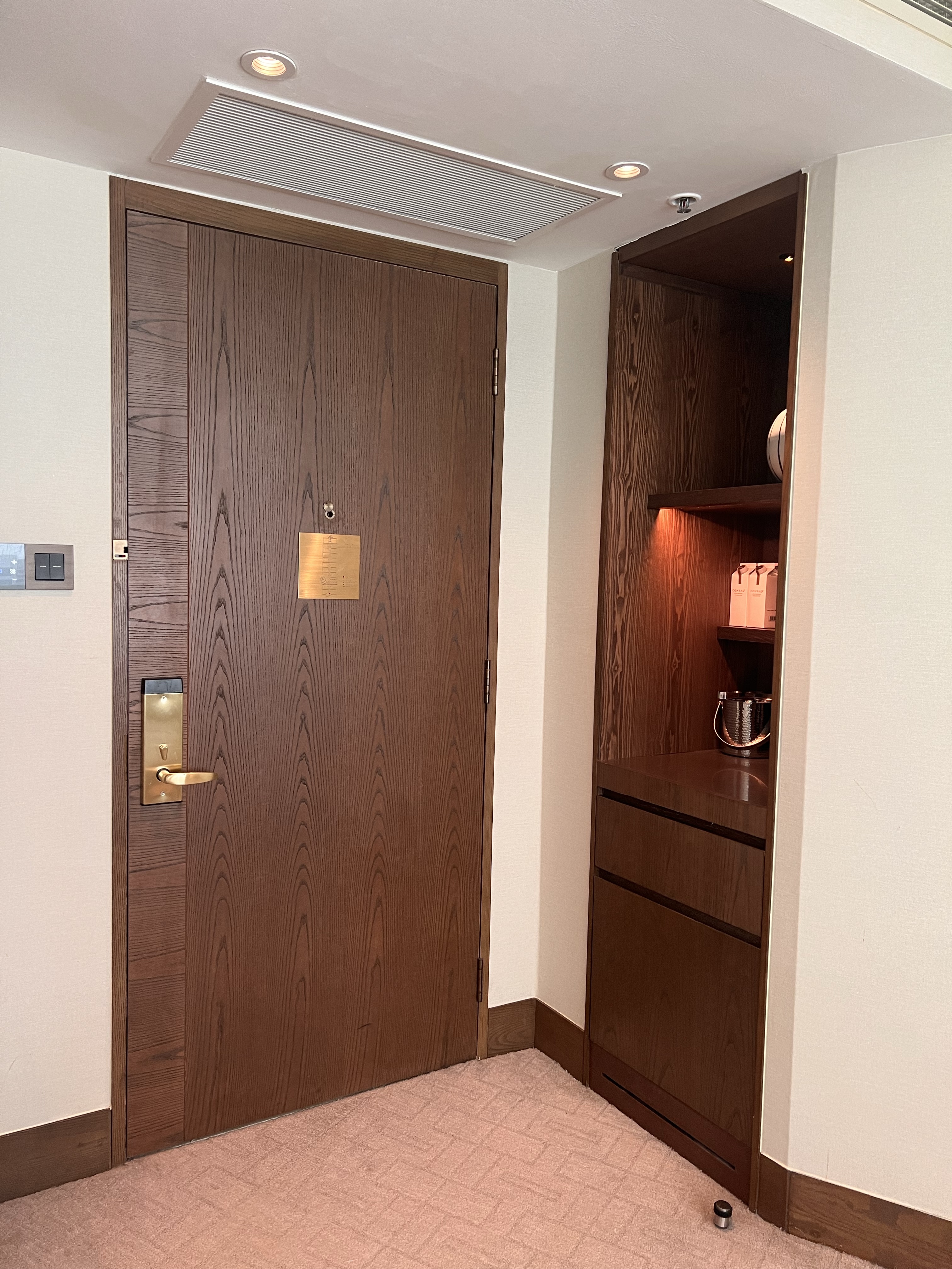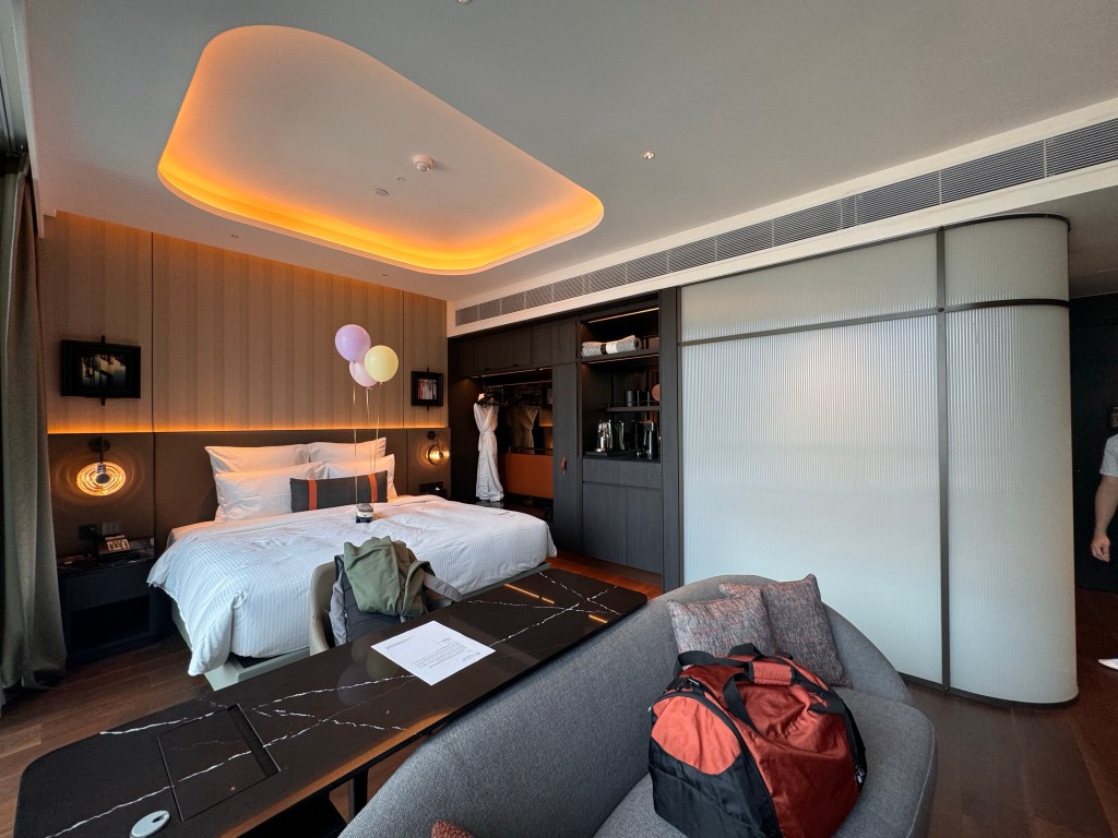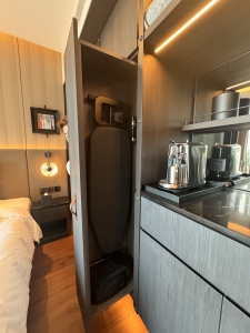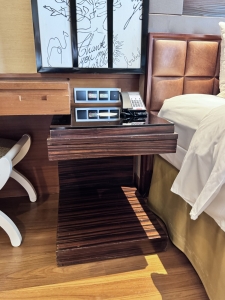 A large sliding wooden door separates the bathroom space from the sleeping area in the bedroom pavilion. Behind the sliding door lies a small section dedicated to the wardrobe, which gives us the feel of a walk-in wardrobe. Raffles Sentosa Singapore fitted two large wardrobes in this area, both with a similar design, with the only difference being the drawer. One of the wardrobes has a larger drawer below, where the in-room safe is hiding, while the other wardrobe is fitted with two deeper drawers where we can store smaller clothing items. The hanging light fitted in this pseudo walk-in wardrobe gave this space a luxurious vibe.