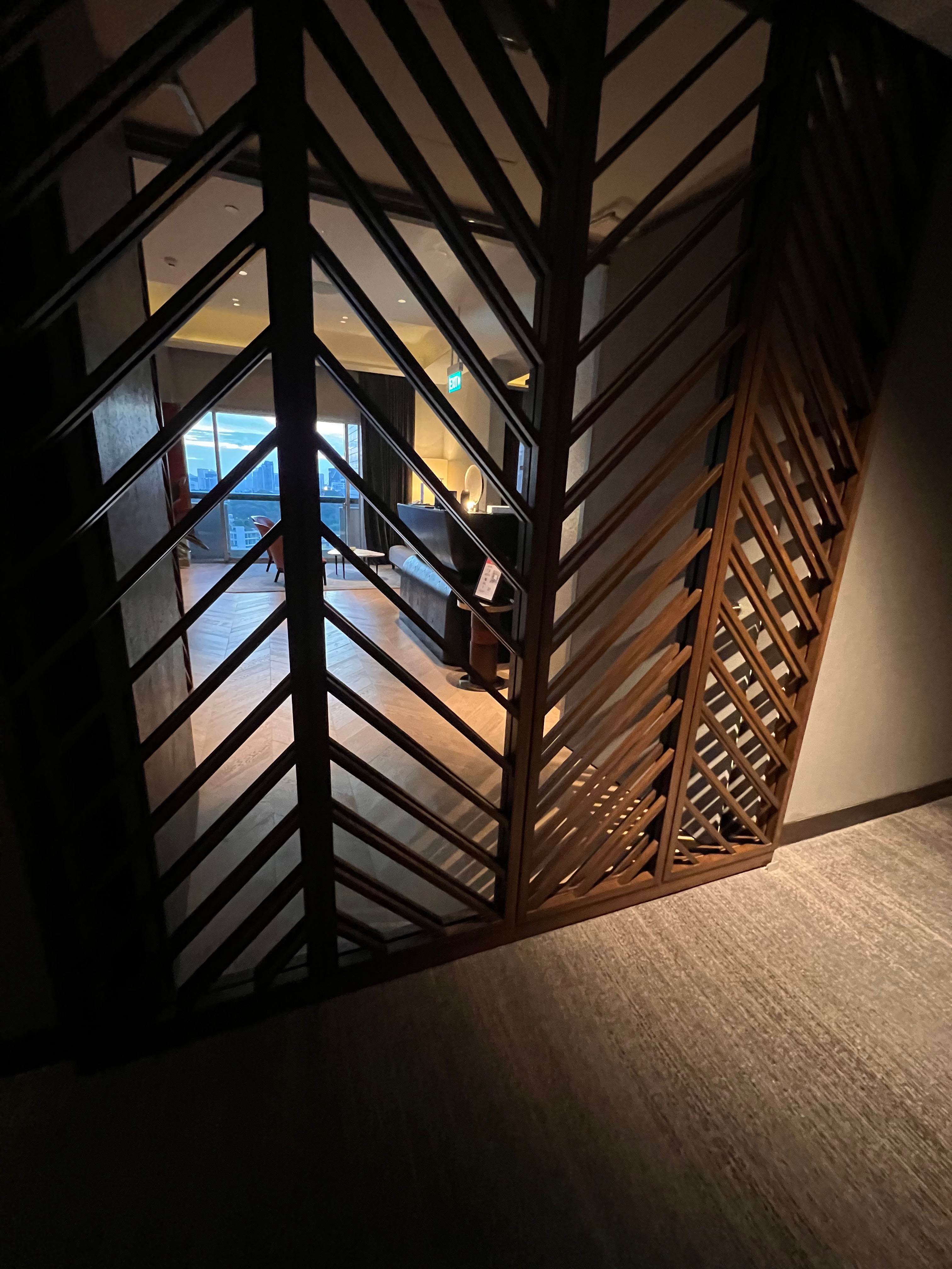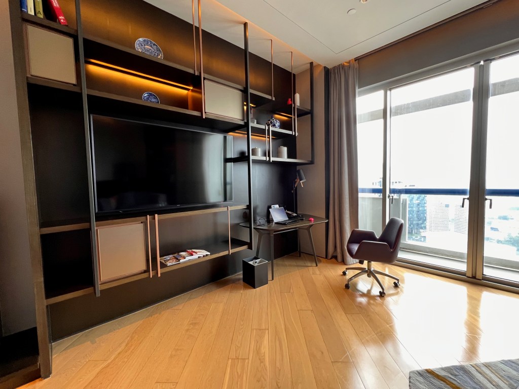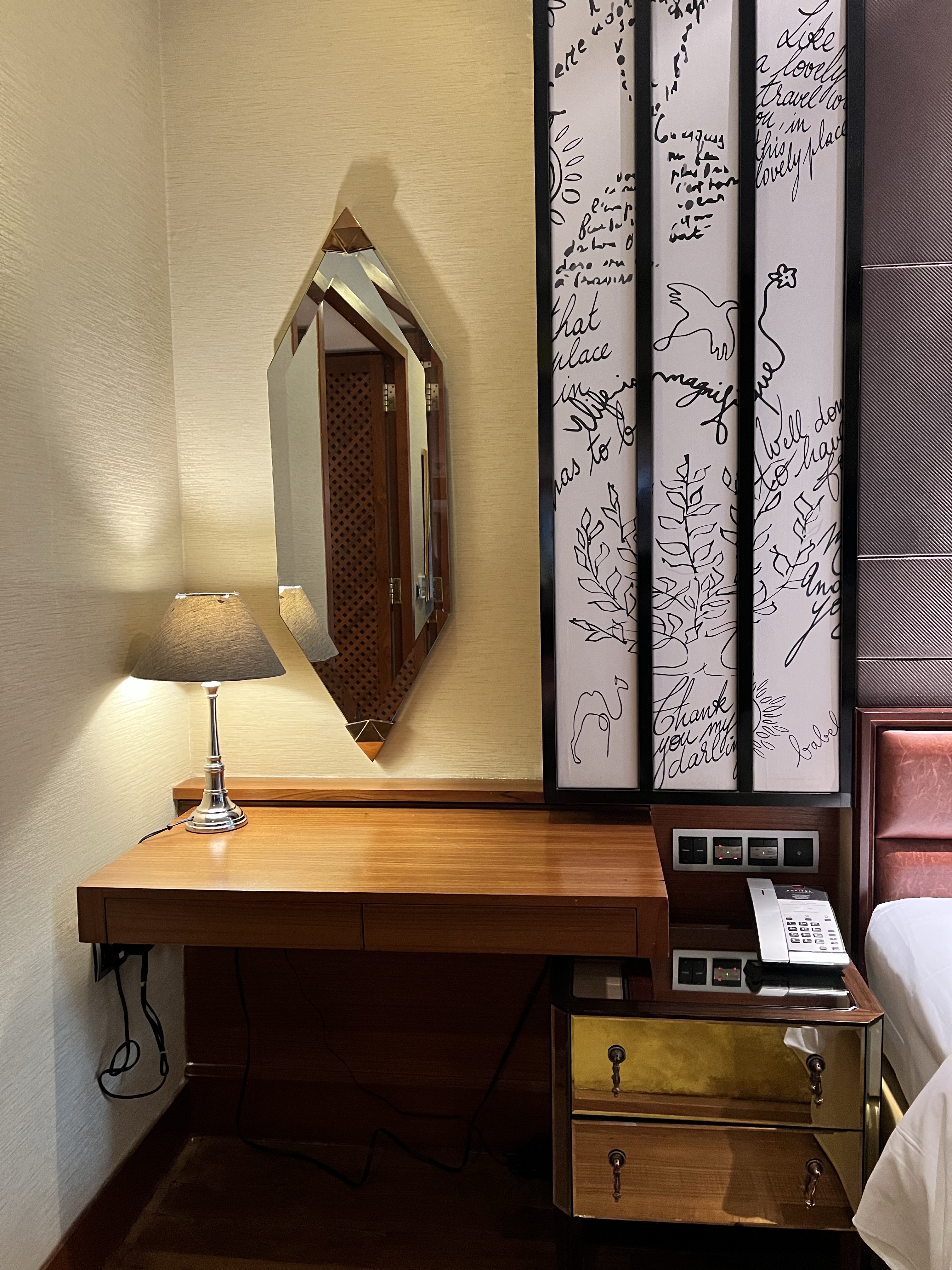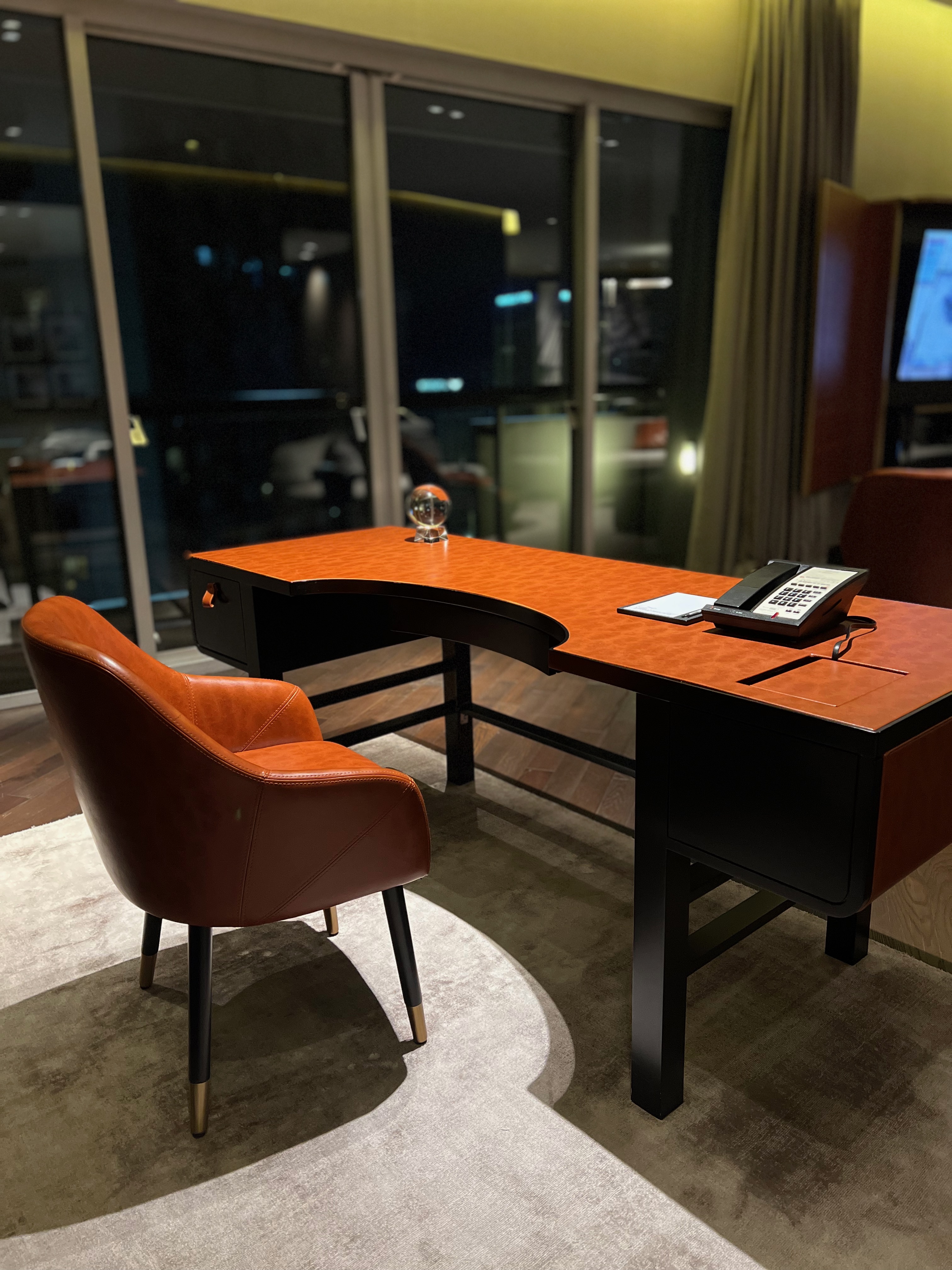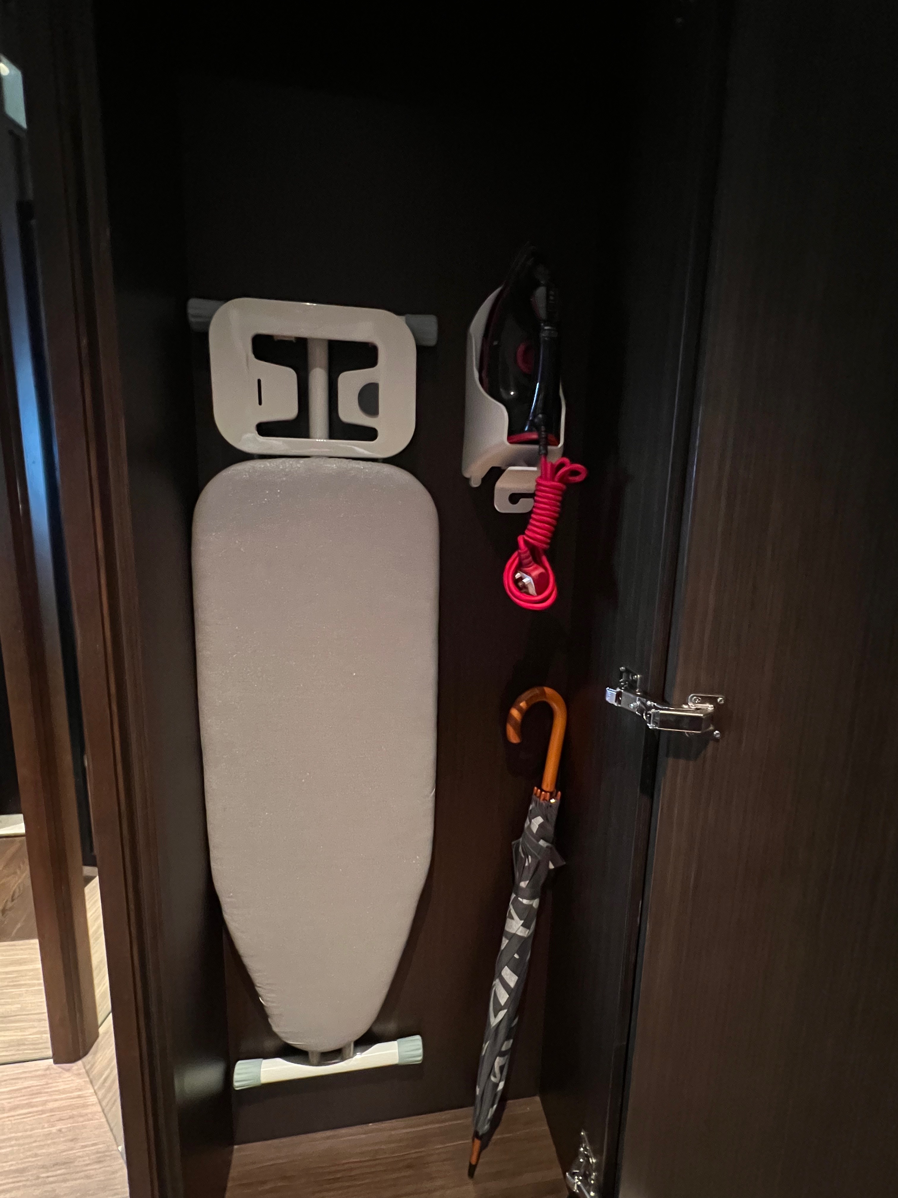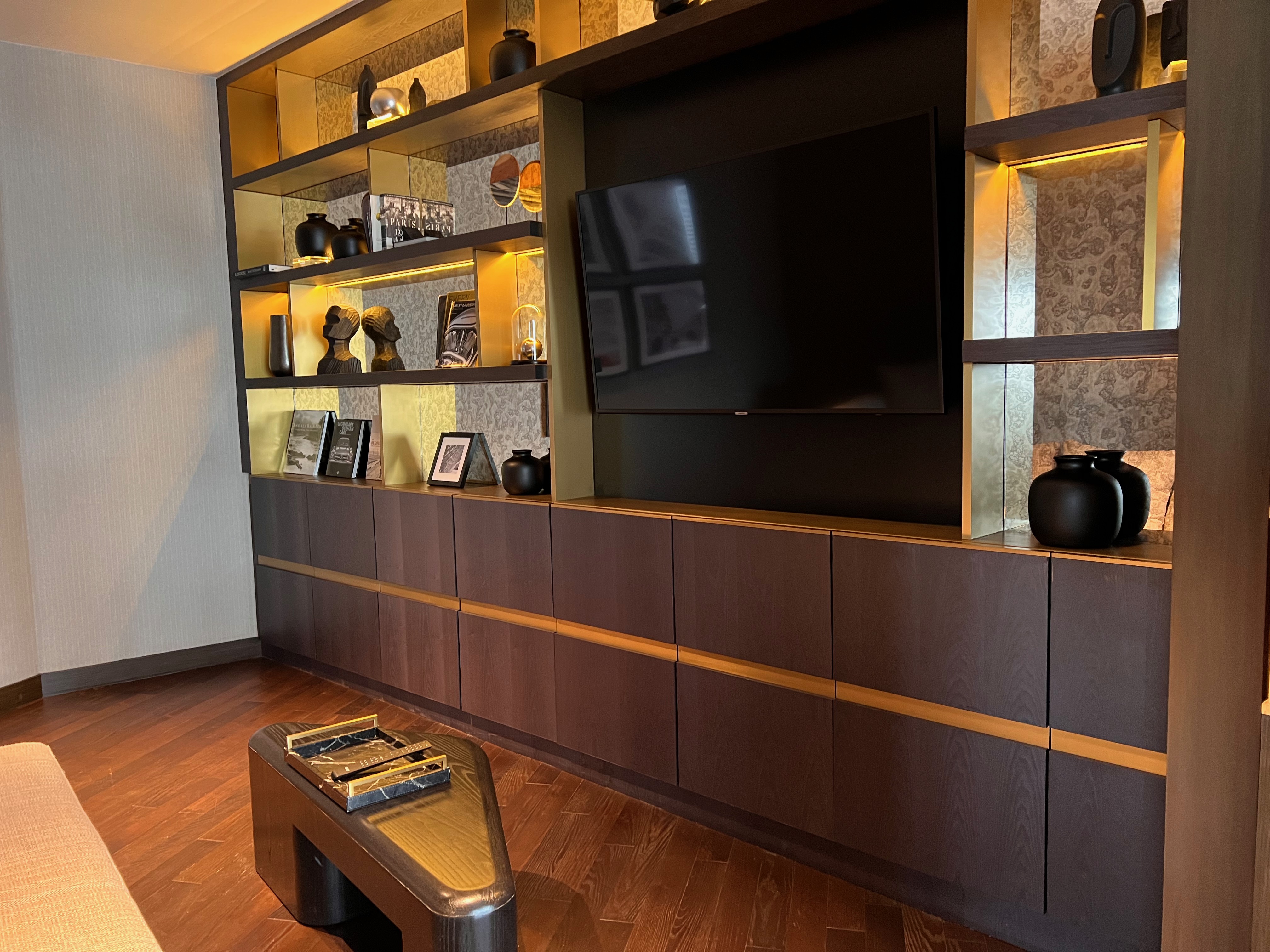 A large sliding wooden door separates the bathroom space from the sleeping area in the bedroom pavilion. Behind the sliding door lies a small section dedicated to the wardrobe, which gives us the feel of a walk-in wardrobe. Raffles Sentosa Singapore fitted two large wardrobes in this area, both with a similar design, with the only difference being the drawer. One of the wardrobes has a larger drawer below, where the in-room safe is hiding, while the other wardrobe is fitted with two deeper drawers where we can store smaller clothing items. The hanging light fitted in this pseudo walk-in wardrobe gave this space a luxurious vibe.