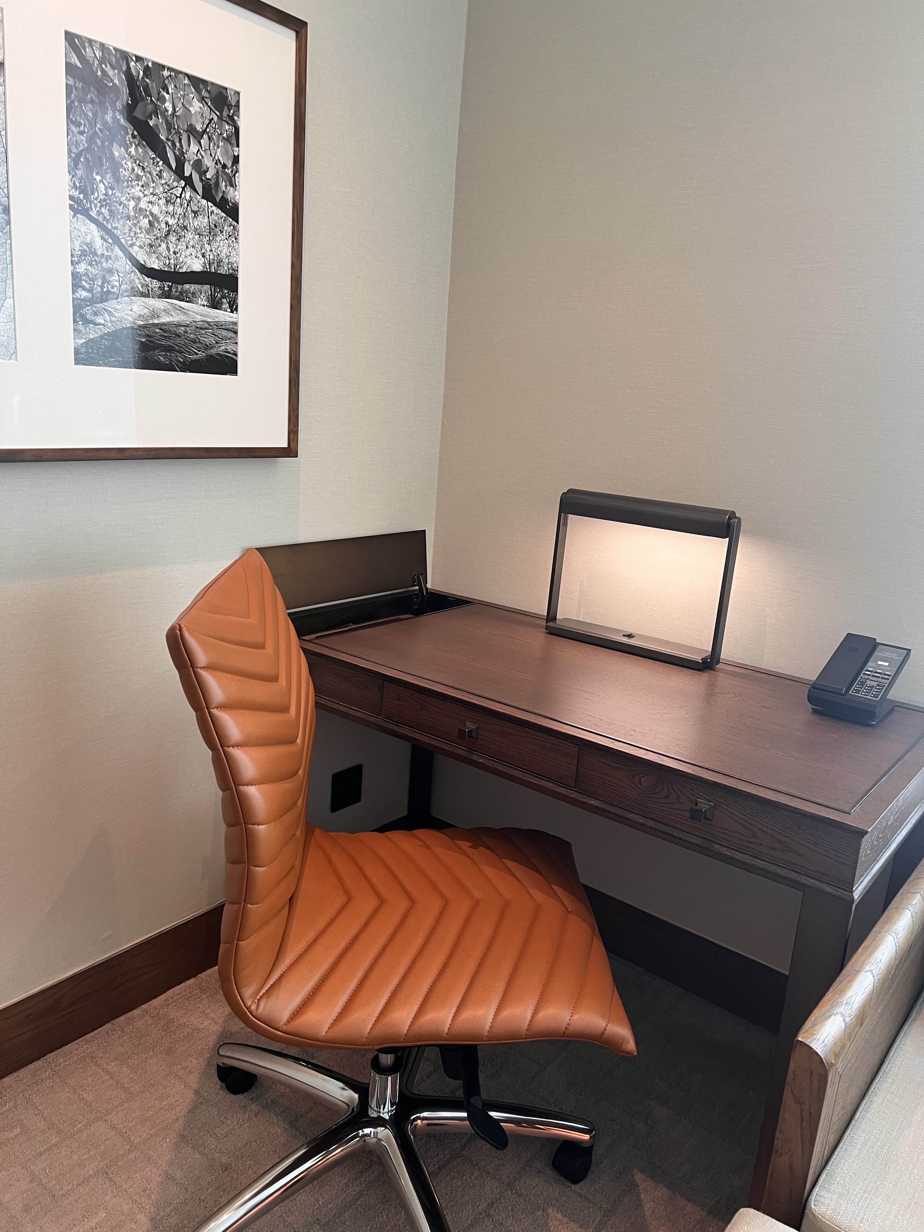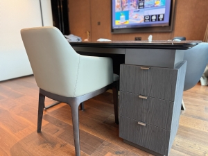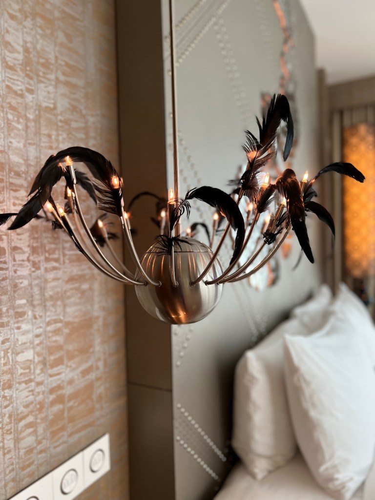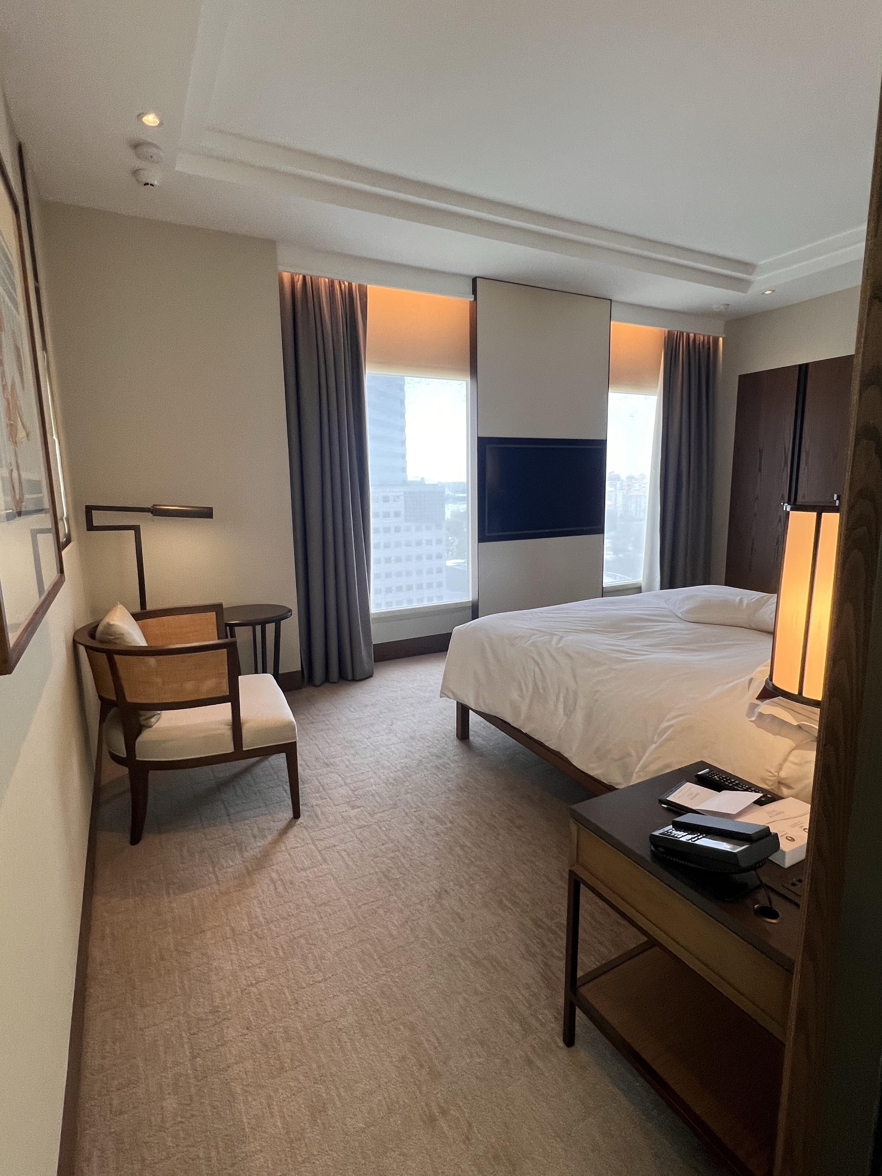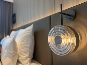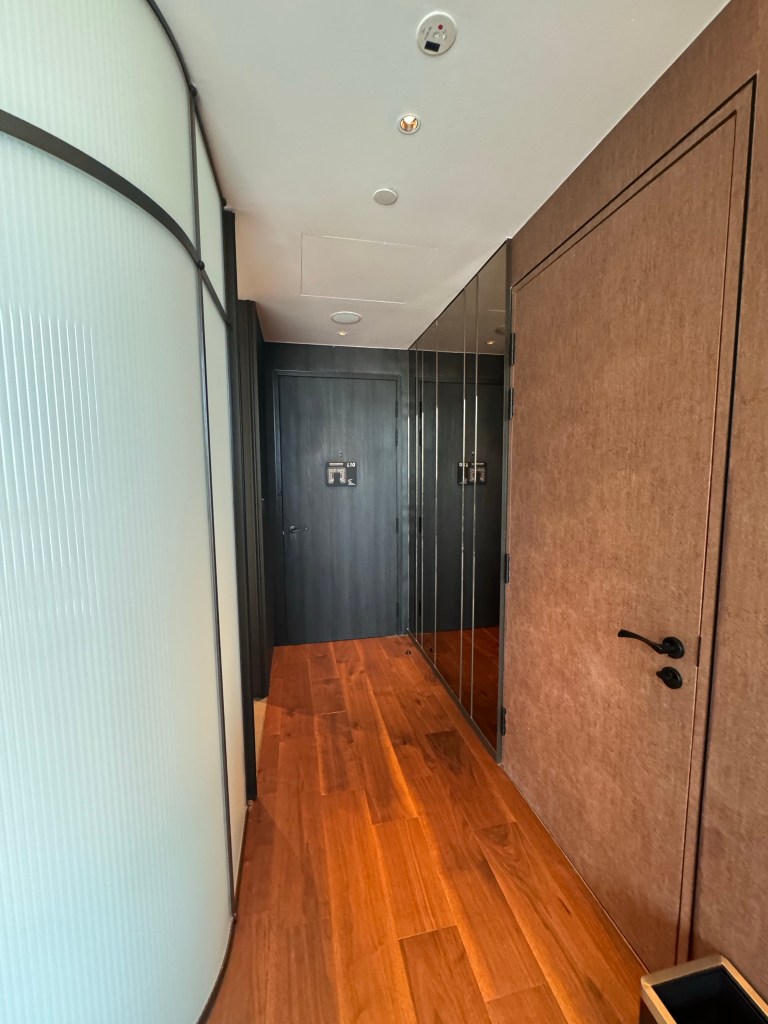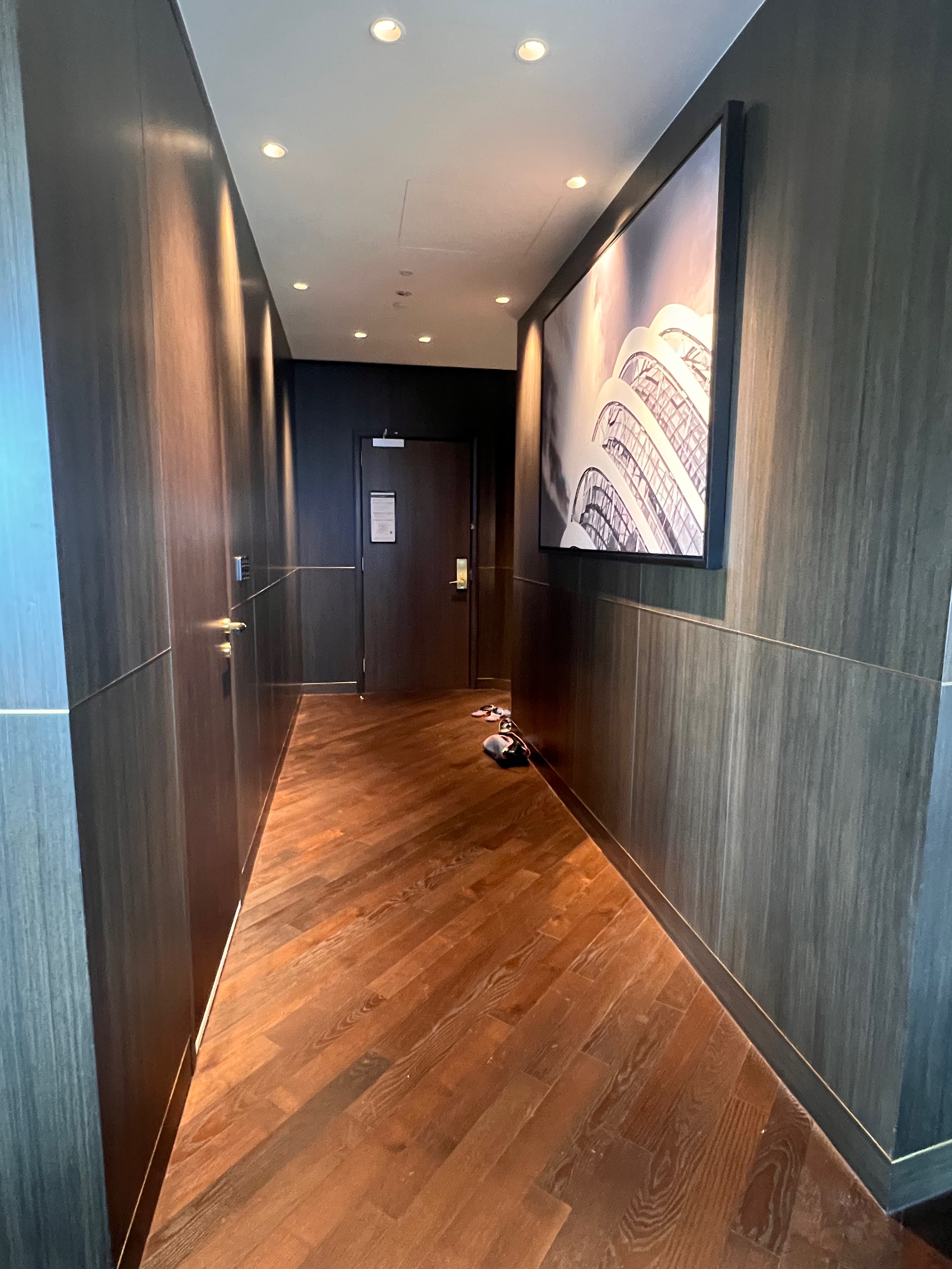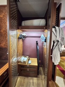 A large sliding wooden door separates the bathroom space from the sleeping area in the bedroom pavilion. Behind the sliding door lies a small section dedicated to the wardrobe, which gives us the feel of a walk-in wardrobe. Raffles Sentosa Singapore fitted two large wardrobes in this area, both with a similar design, with the only difference being the drawer. One of the wardrobes has a larger drawer below, where the in-room safe is hiding, while the other wardrobe is fitted with two deeper drawers where we can store smaller clothing items. The hanging light fitted in this pseudo walk-in wardrobe gave this space a luxurious vibe.