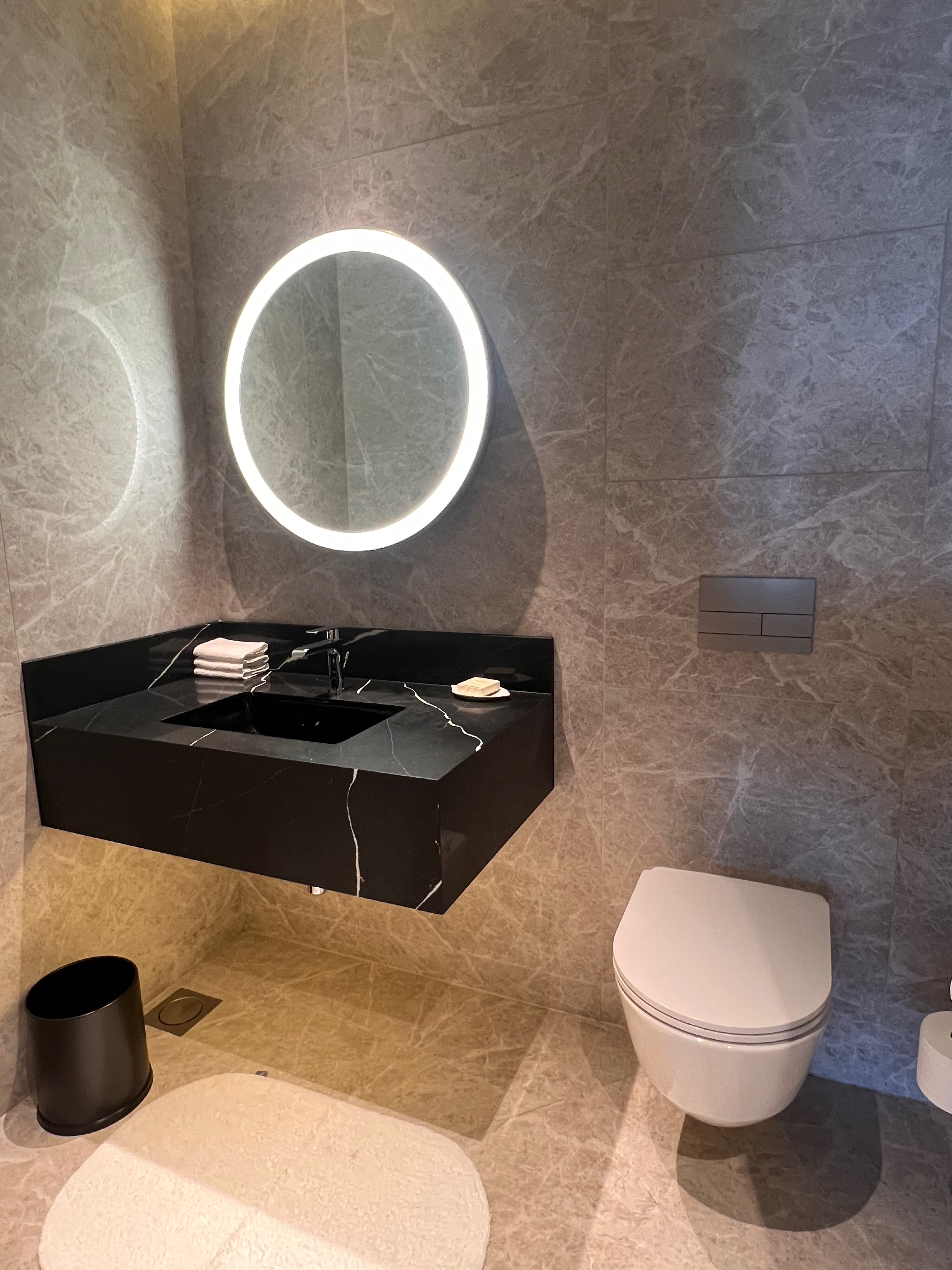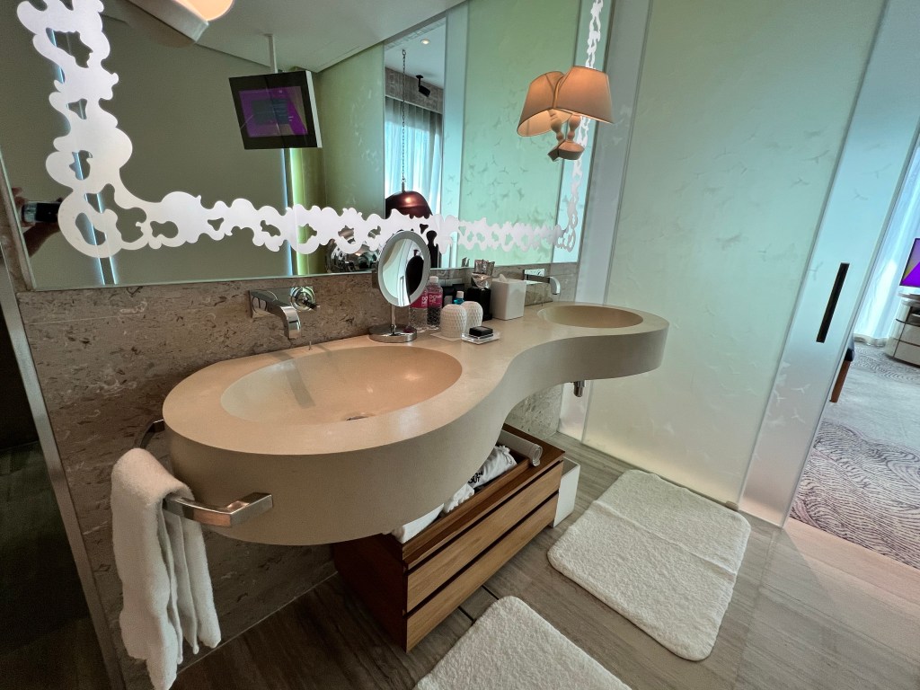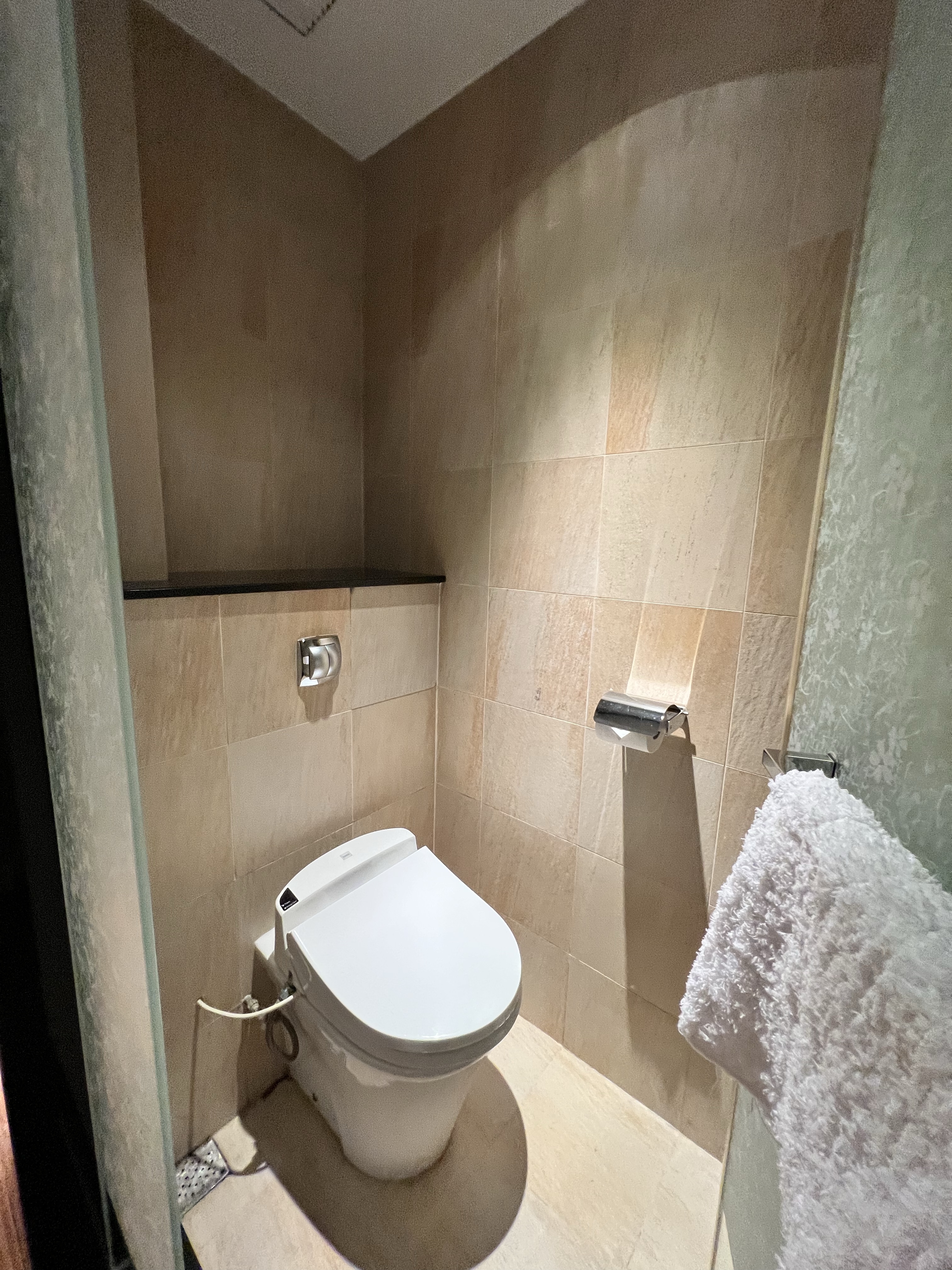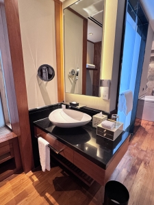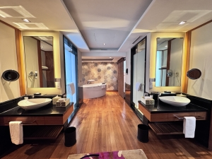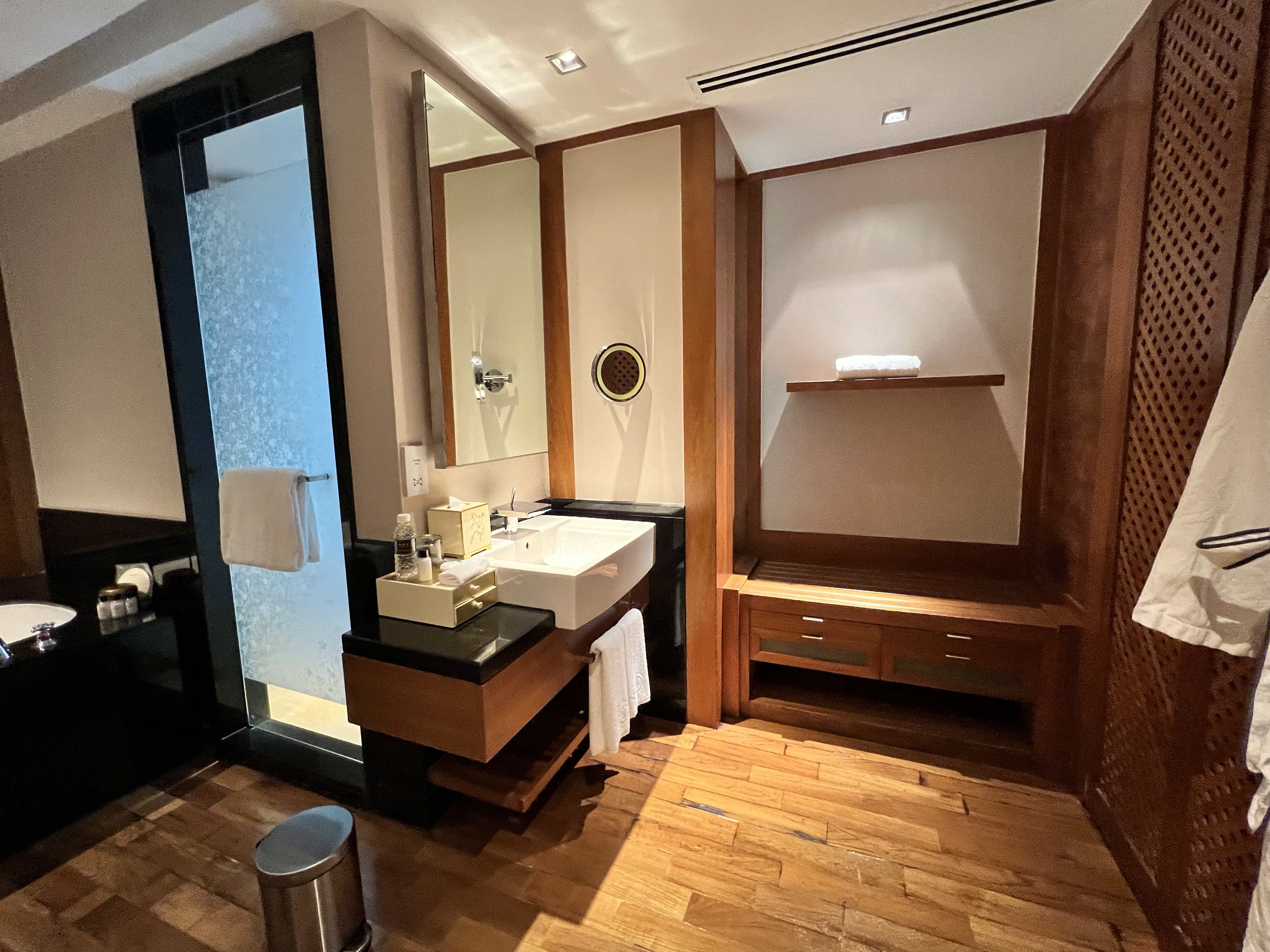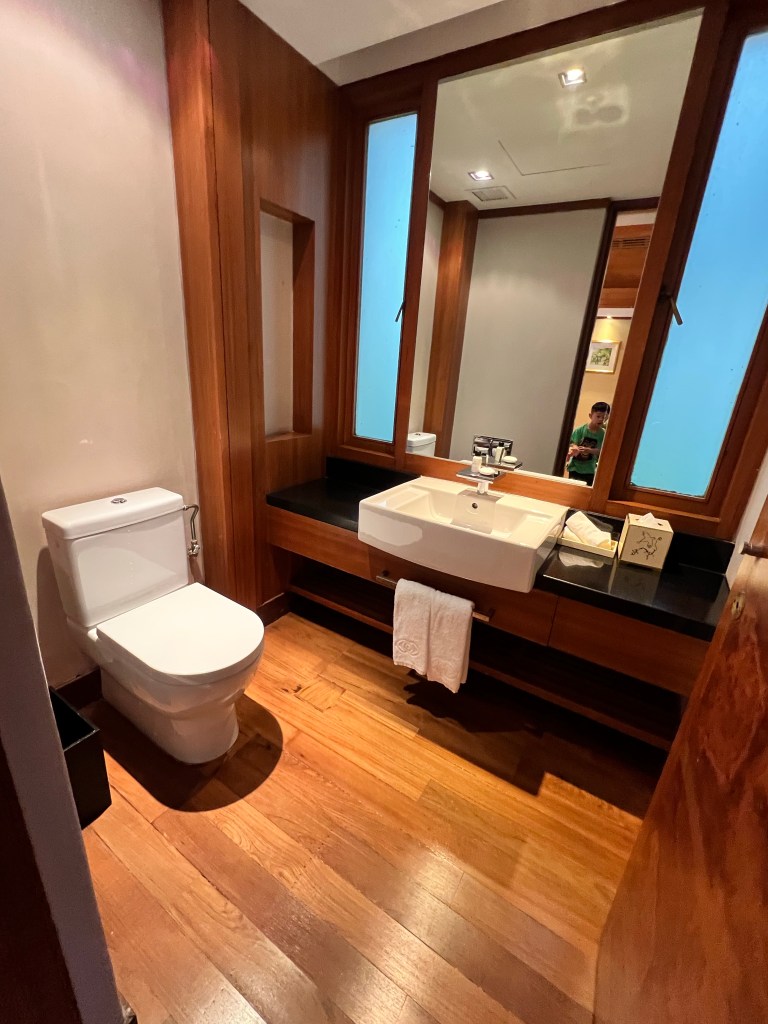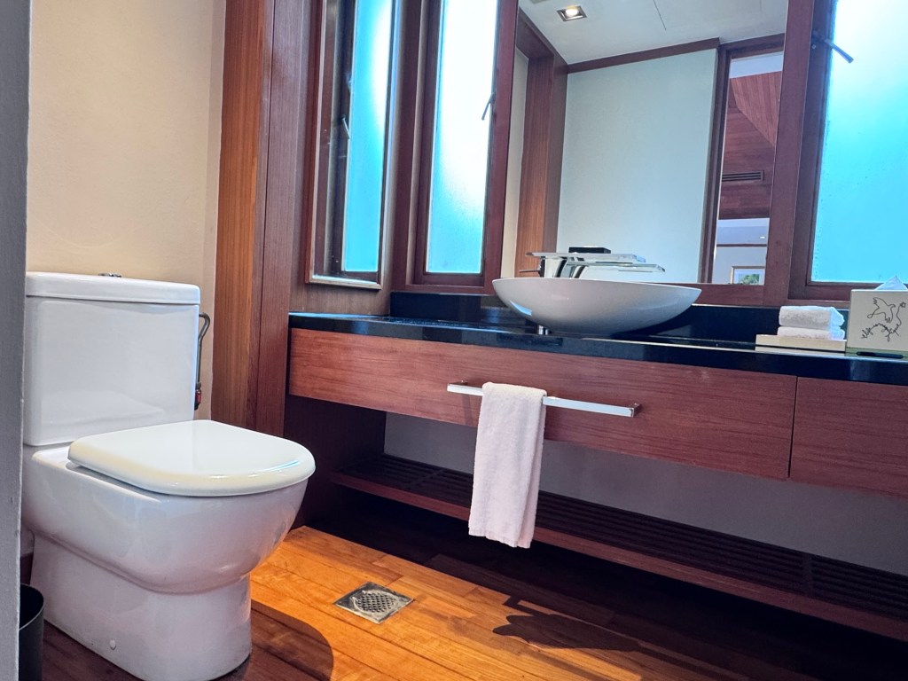 The bathroom has a more luxurious vibe, mostly decked in sand coloured marble tiles on its walls and flooring, a departure from the nature theme we saw in the living room and the sleeping area. Placed next to the floor-to-ceiling window that surrounds one side of the bathroom, facing the pool, is a deep-seated marble bathtub. I like how the resort fitted a wooden platform with a tablet holder at the bathtub so guests could watch videos on their tablet while soaking in the tub. A door near the bathtub provides direct access to the pool and the terrace. A vanity table sits at one corner of the bathroom, next to the bathtub.