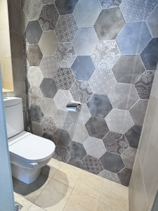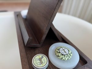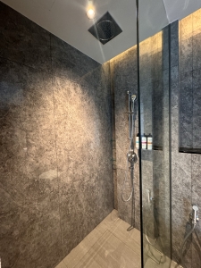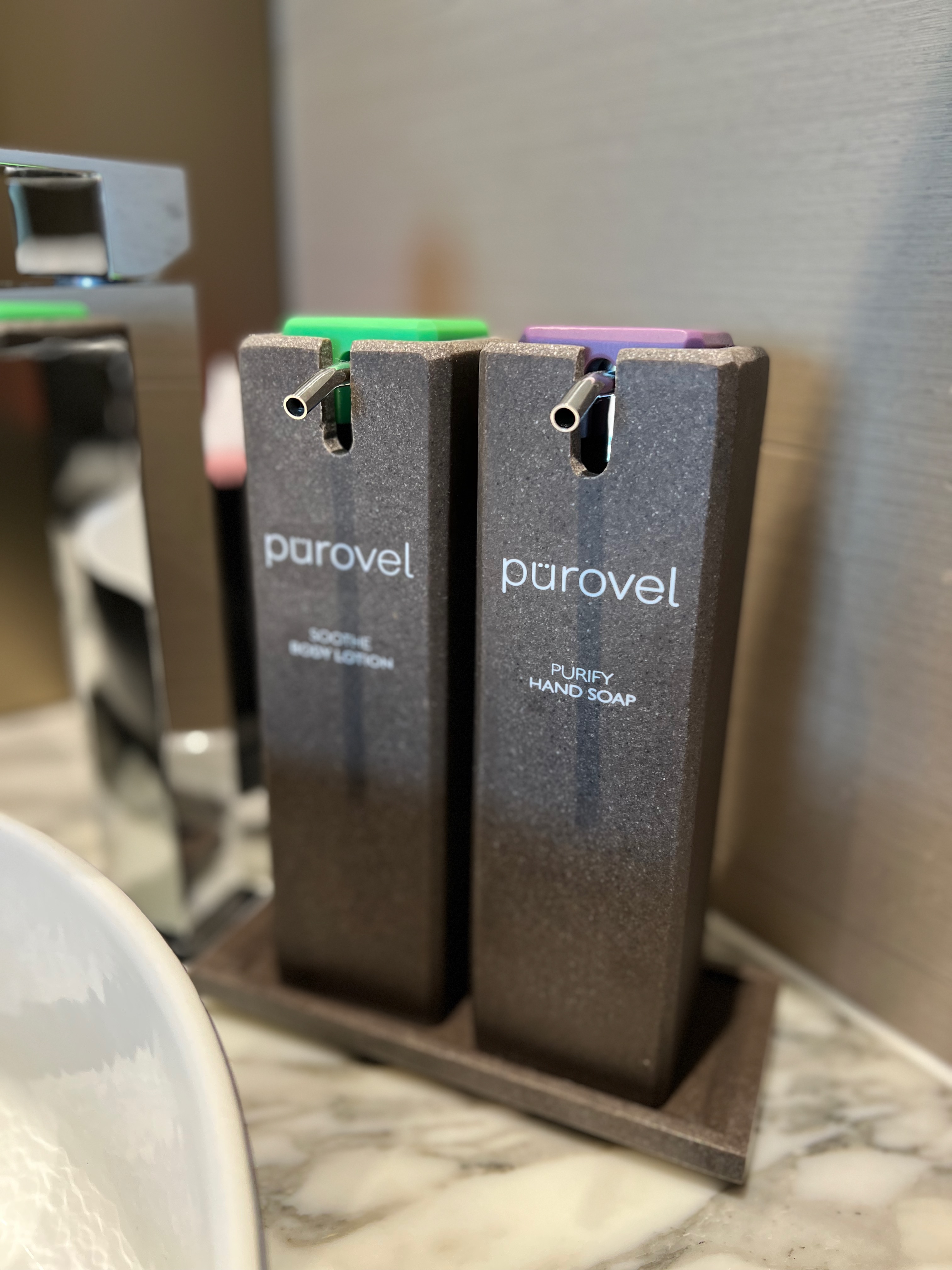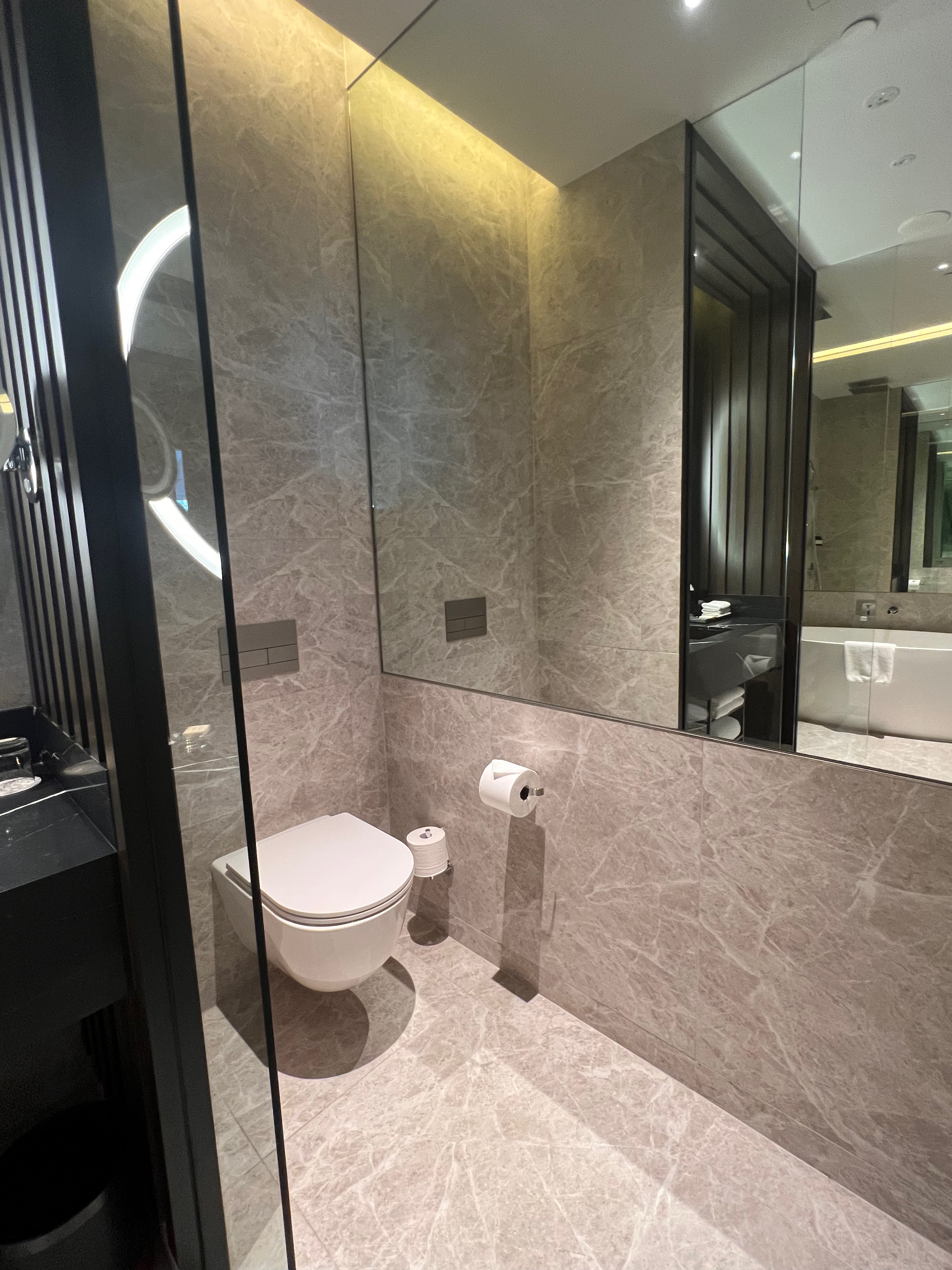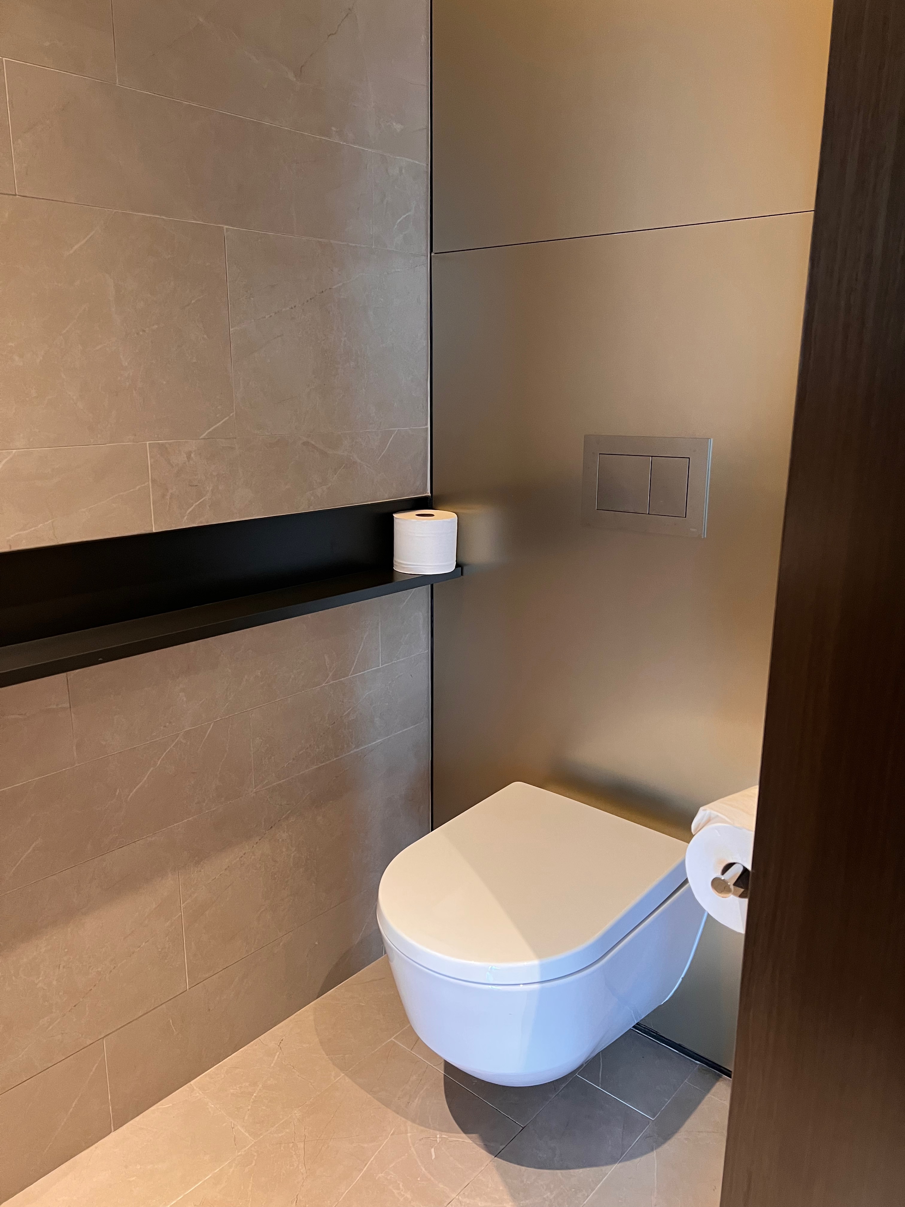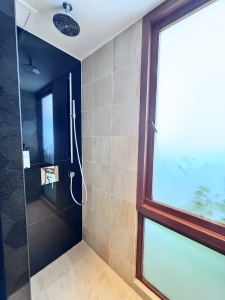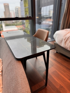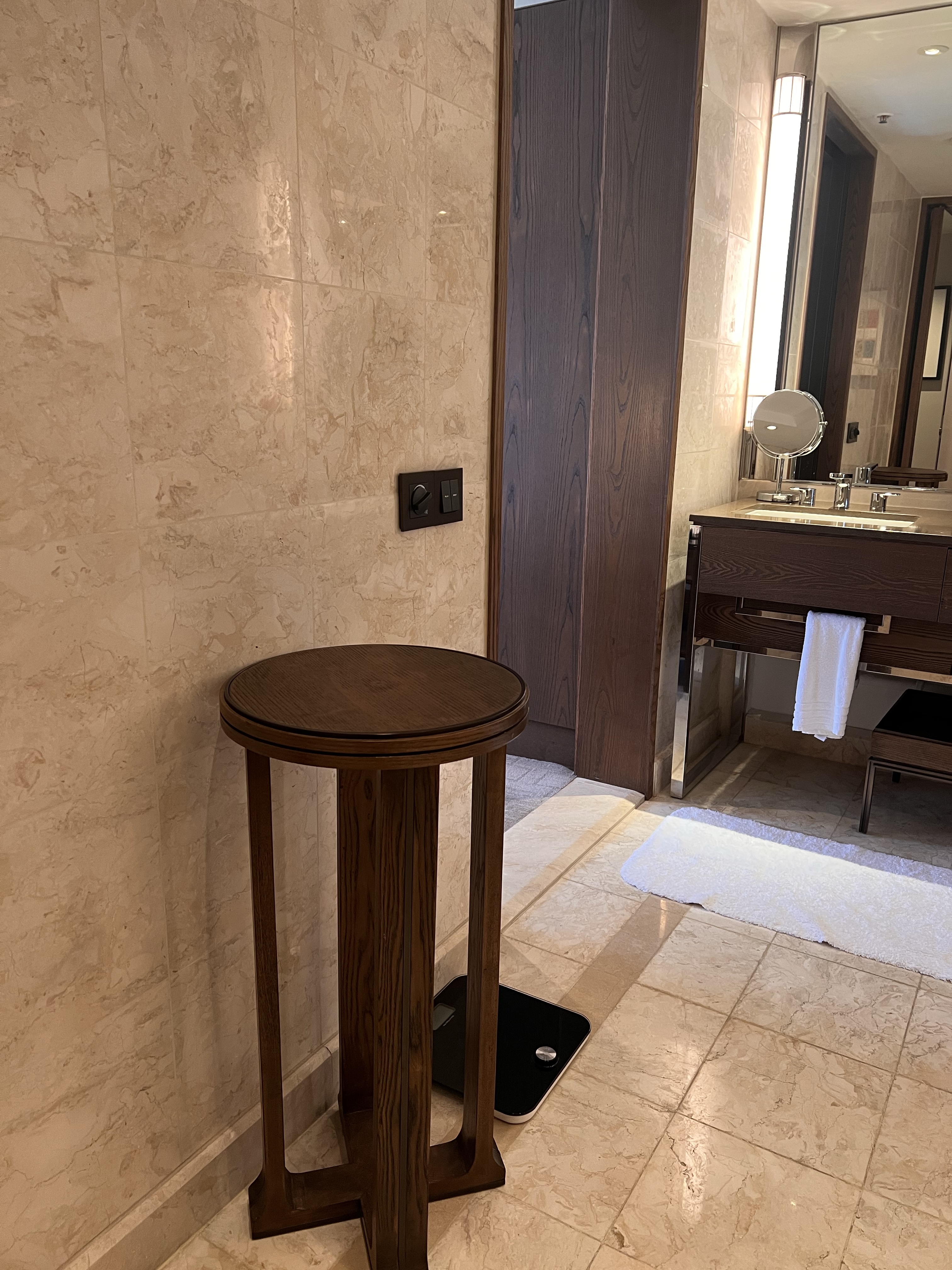 The bathroom has a more luxurious vibe, mostly decked in sand coloured marble tiles on its walls and flooring, a departure from the nature theme we saw in the living room and the sleeping area. Placed next to the floor-to-ceiling window that surrounds one side of the bathroom, facing the pool, is a deep-seated marble bathtub. I like how the resort fitted a wooden platform with a tablet holder at the bathtub so guests could watch videos on their tablet while soaking in the tub. A door near the bathtub provides direct access to the pool and the terrace. A vanity table sits at one corner of the bathroom, next to the bathtub.