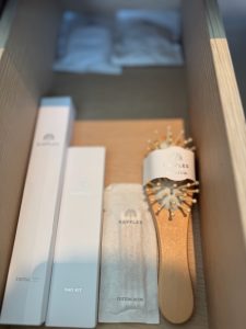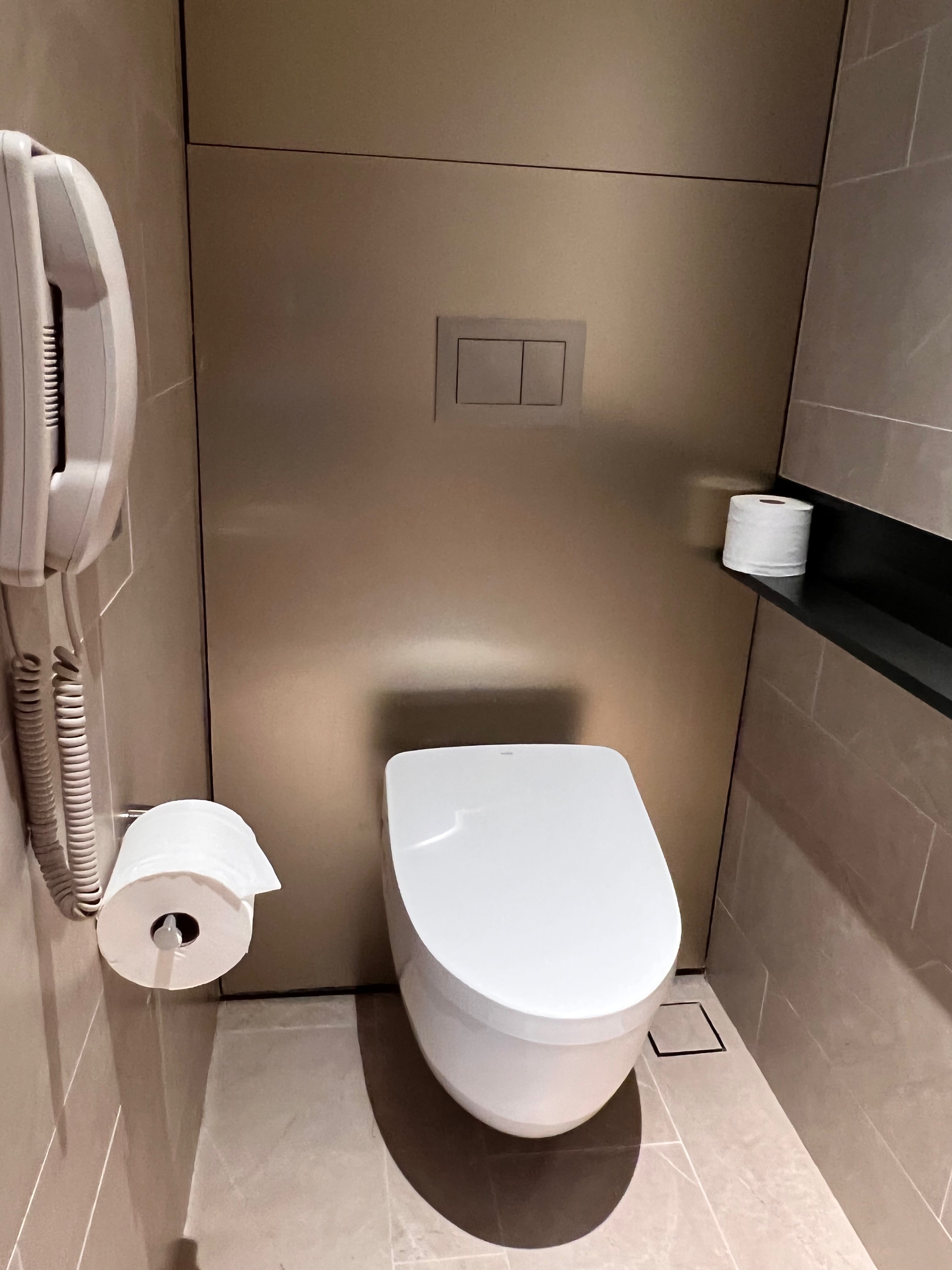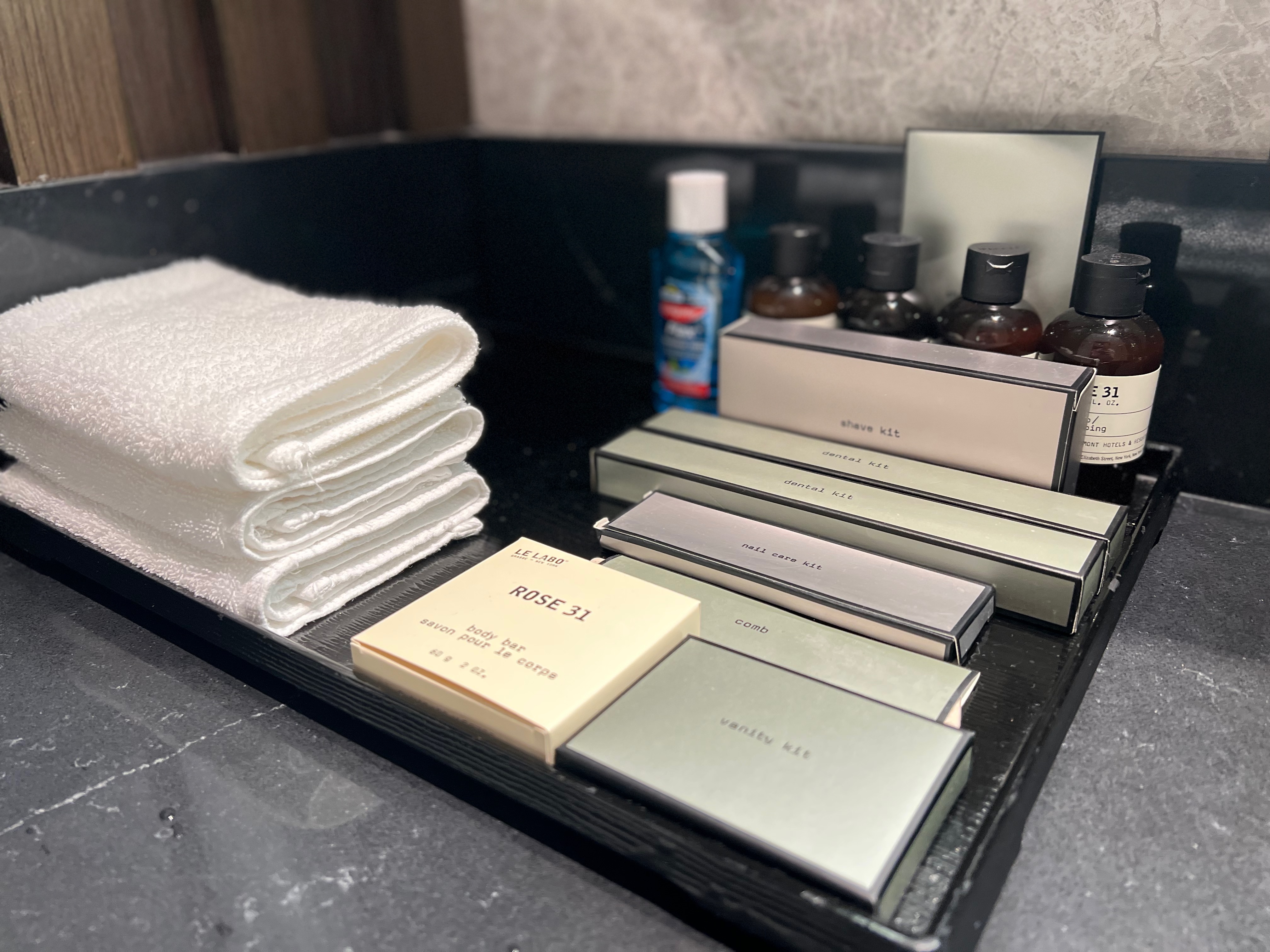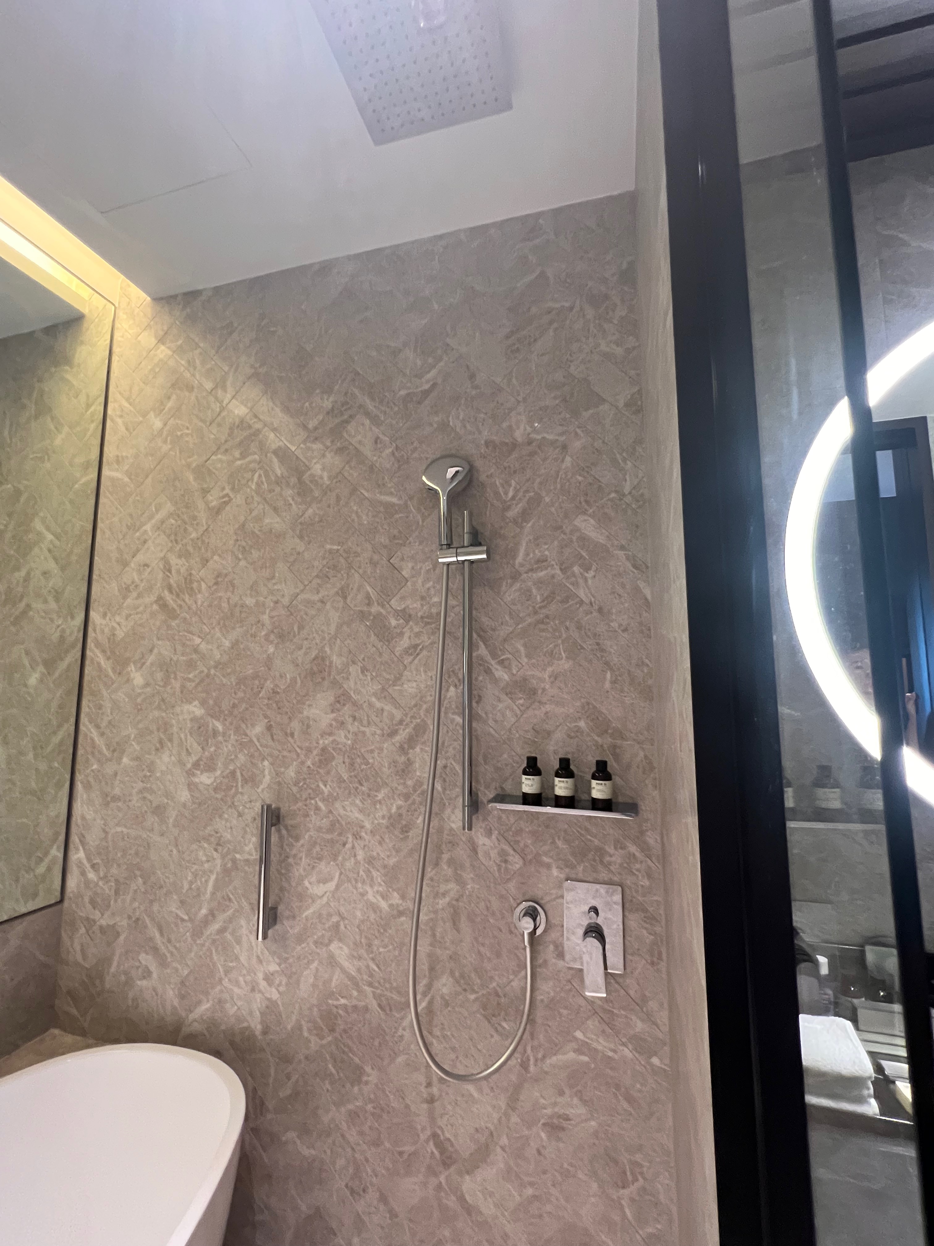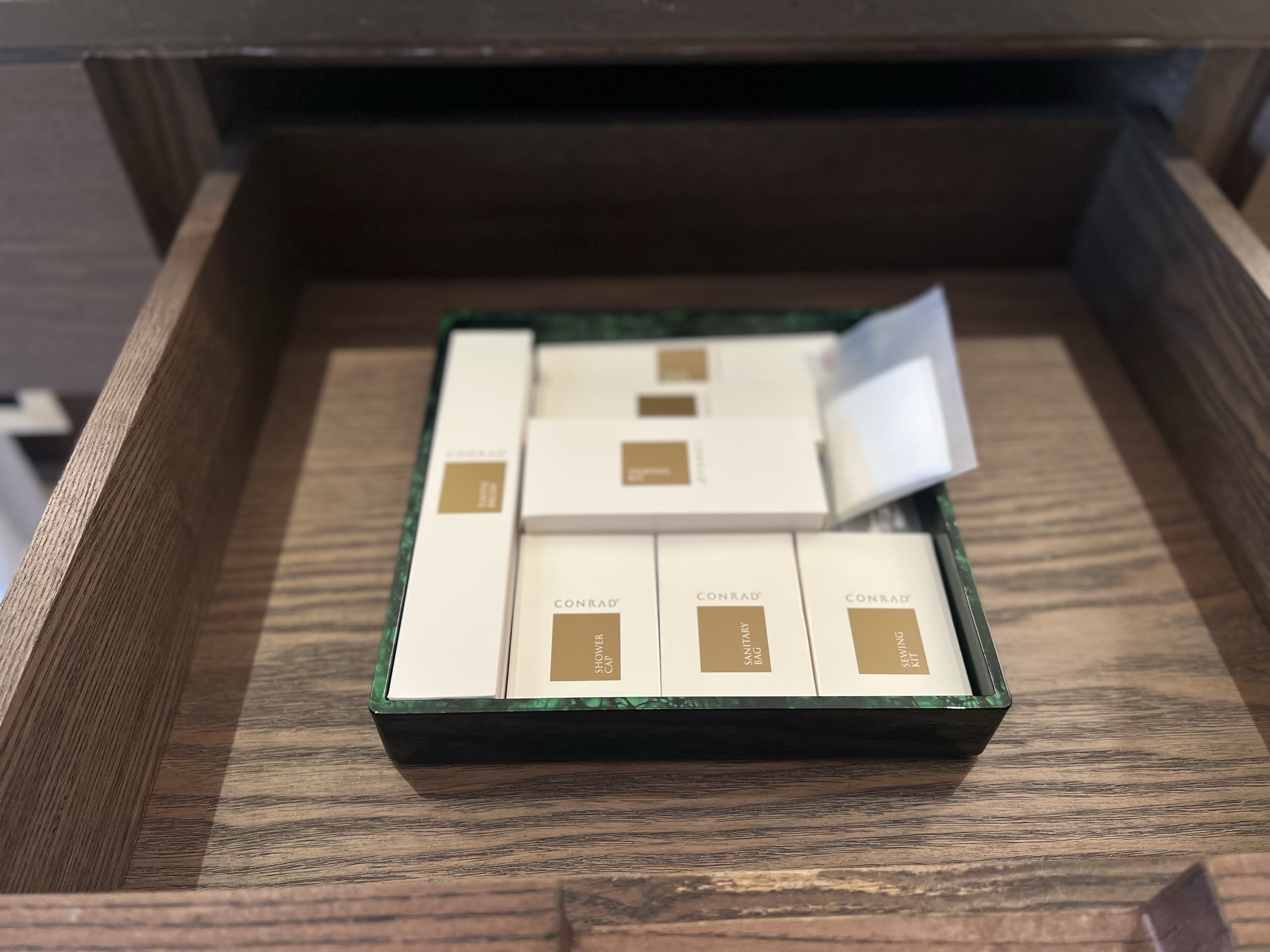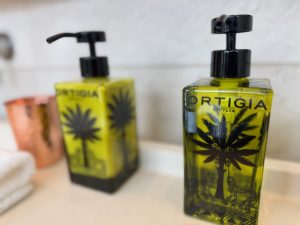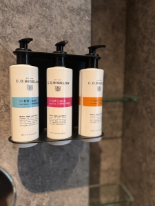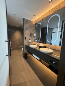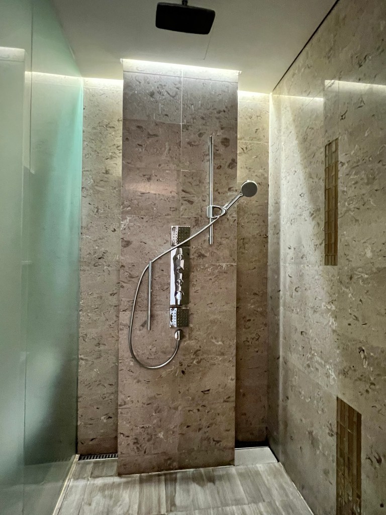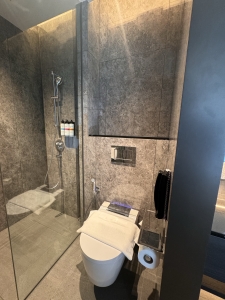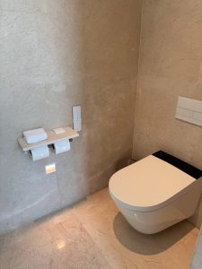 Built onto a sand coloured marble wall opposite the bathtub is the sink area. At one glance, it looks as if the bathroom is fitted with one huge sink. However, upon closer inspection, there are actually two sinks. Despite having oversized sinks, we still found ample space at the countertop to stow our toiletries. The three drawers below the sink provided us with space to stow away our toiletries bags and whatnots. The bathroom amenities that the resort provided were stowed in these drawers. I like the large mirror Raffles Sentosa Singapore installed by the sink countertops, which made the already airy-looking bathroom look even roomier. Behind the sand coloured marble wall lies the toilet cubicle on the left, and the walk-in shower on the right. The resort installed a Japanese-style bidet in the toilet, while the walk-in shower is fitted with a regular and a rain shower head. I like the Italian-branded Ortigia shower amenities the resort provides, which are refreshing and have a hint of natural smell that leaves our skin feeling soft and refreshed.
