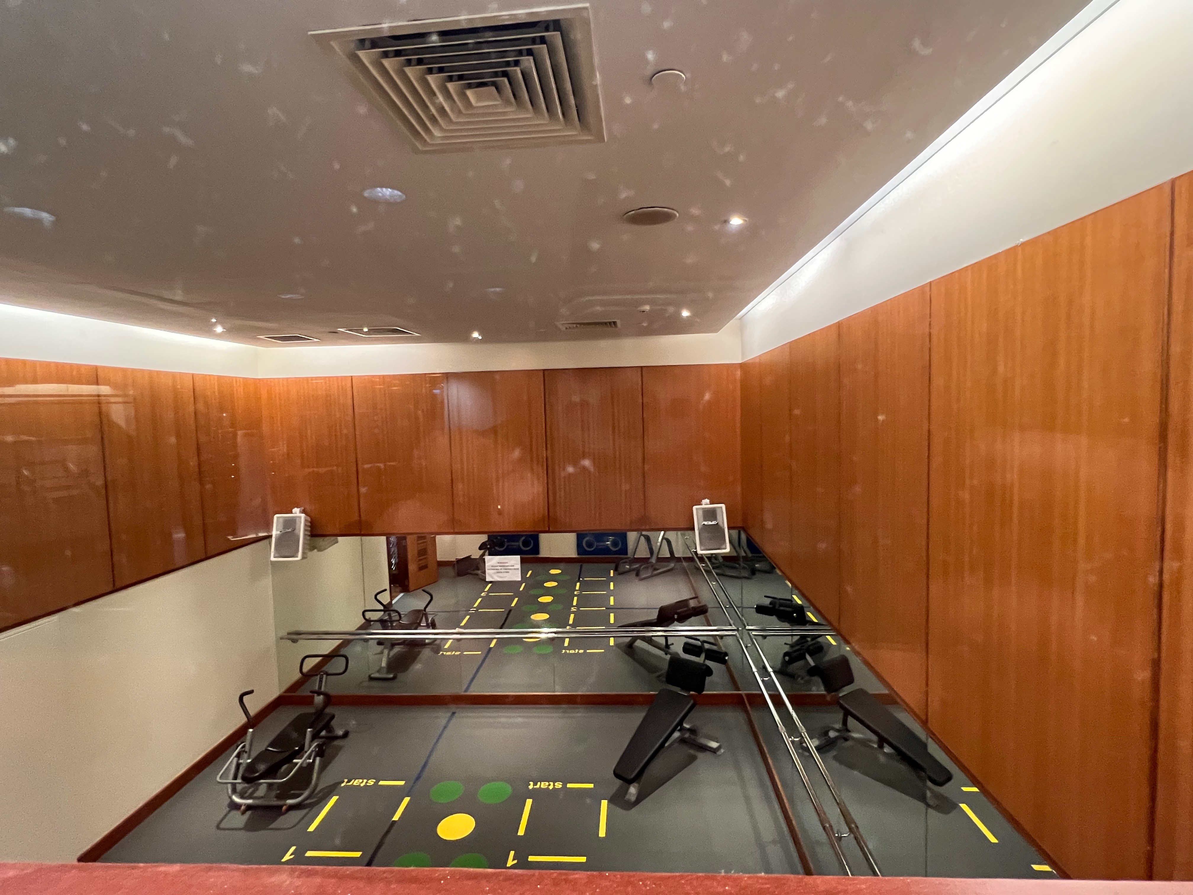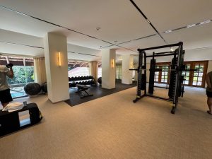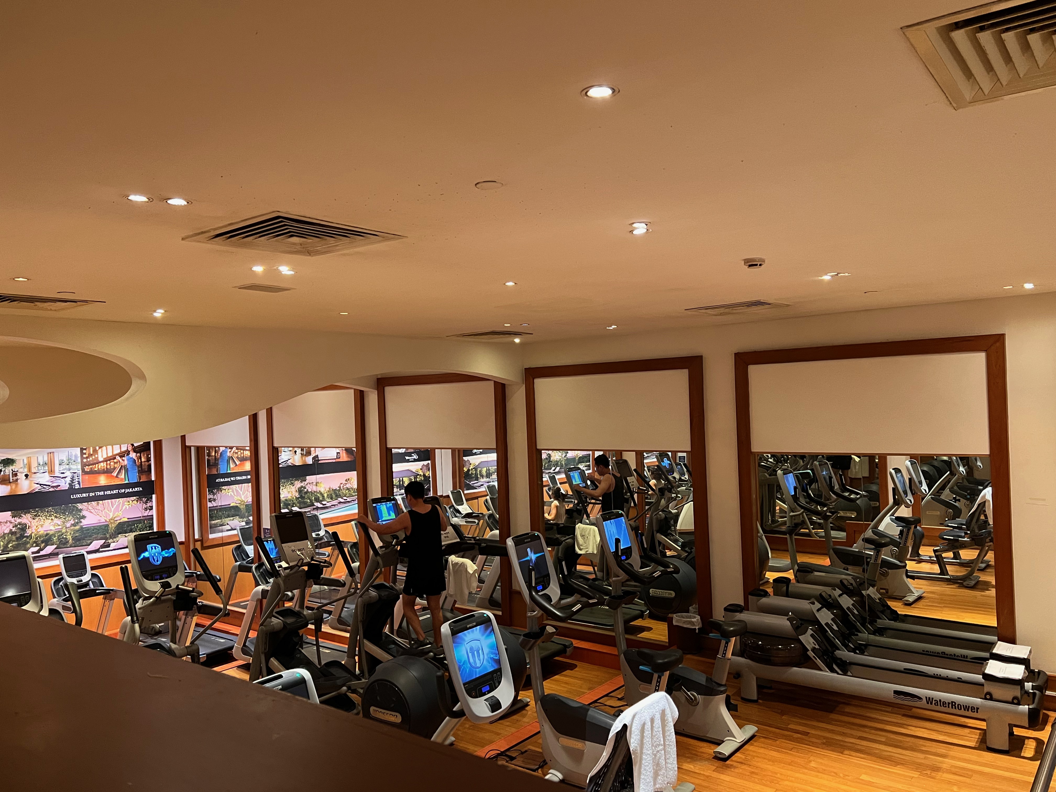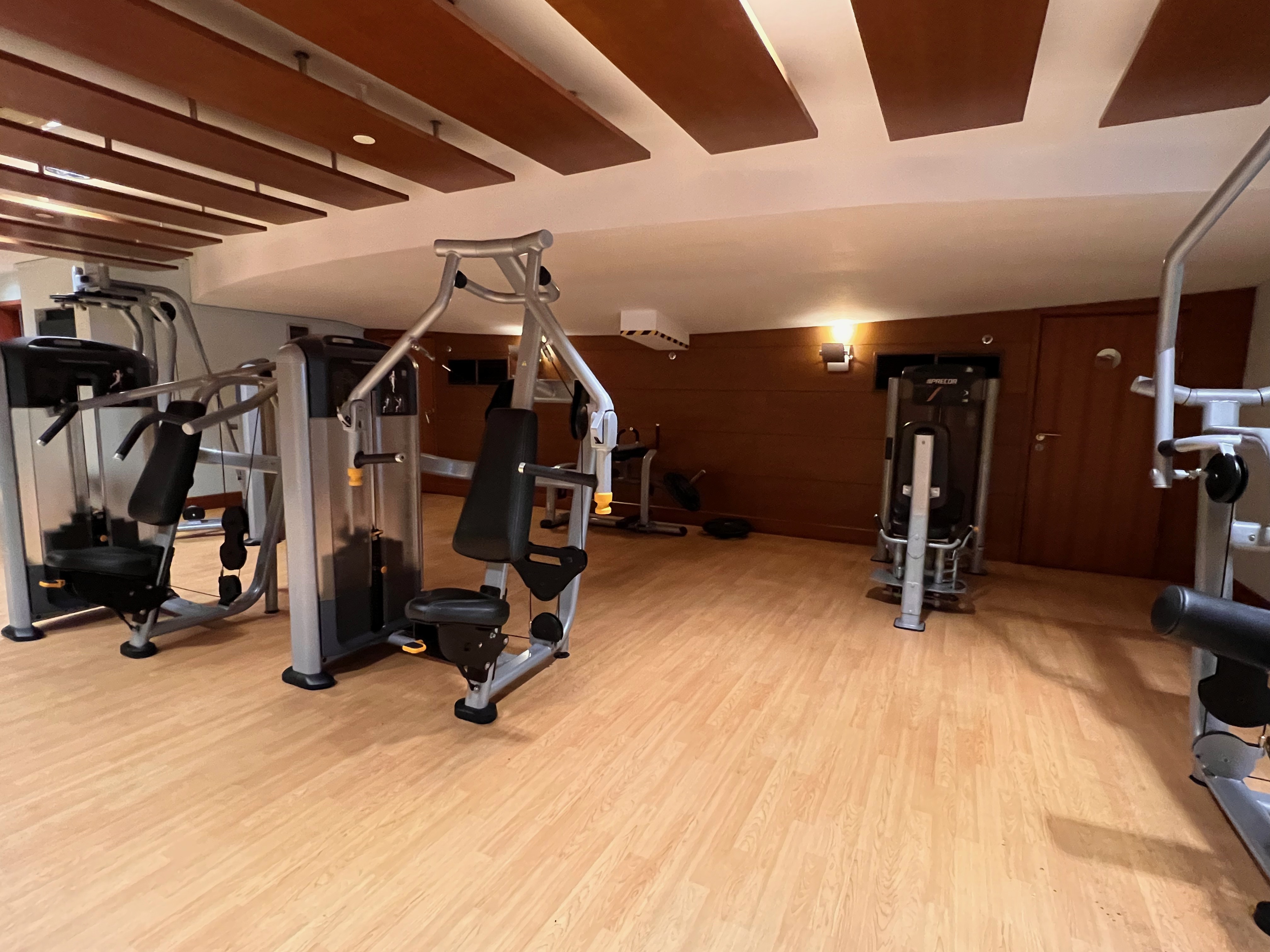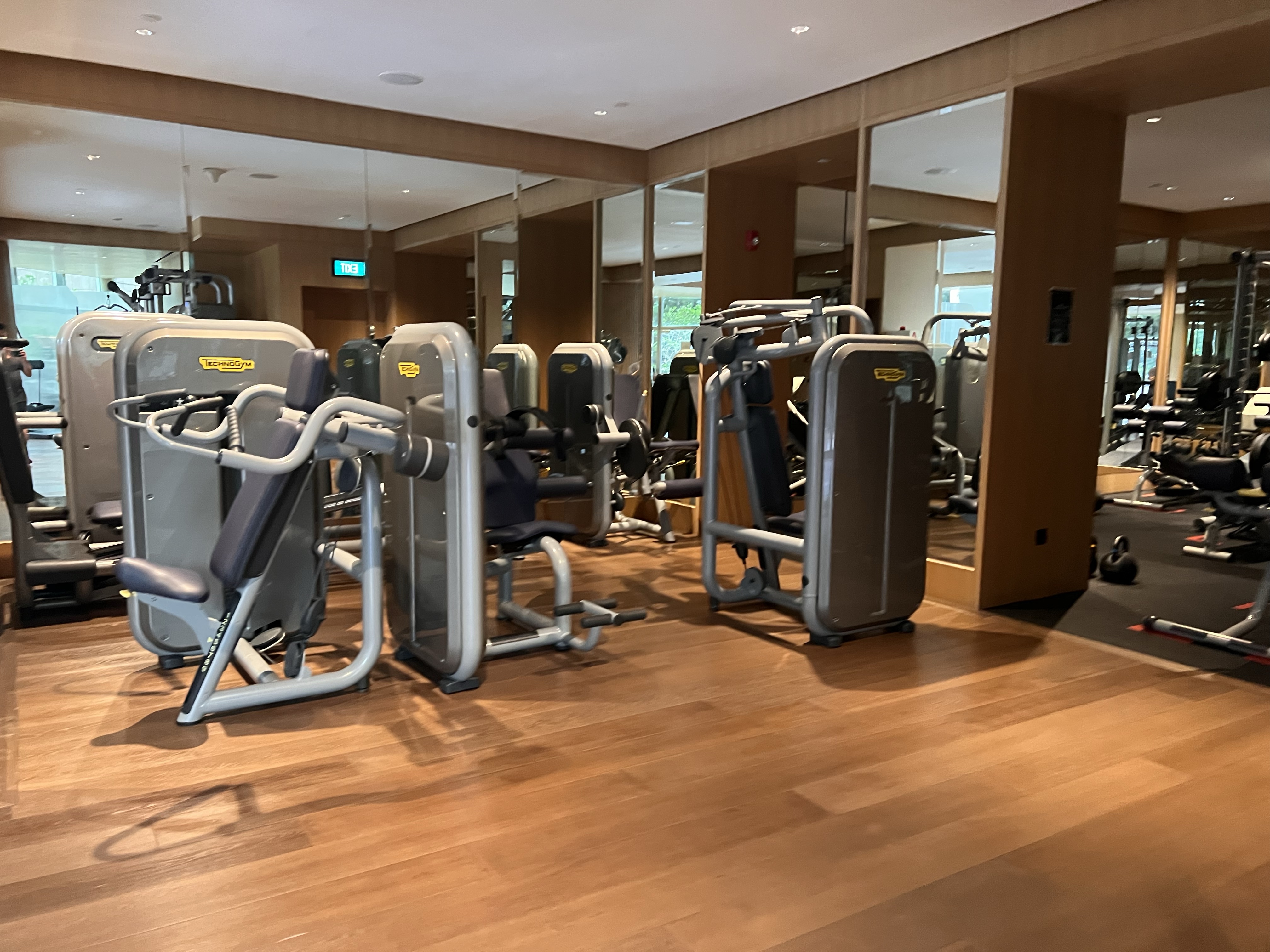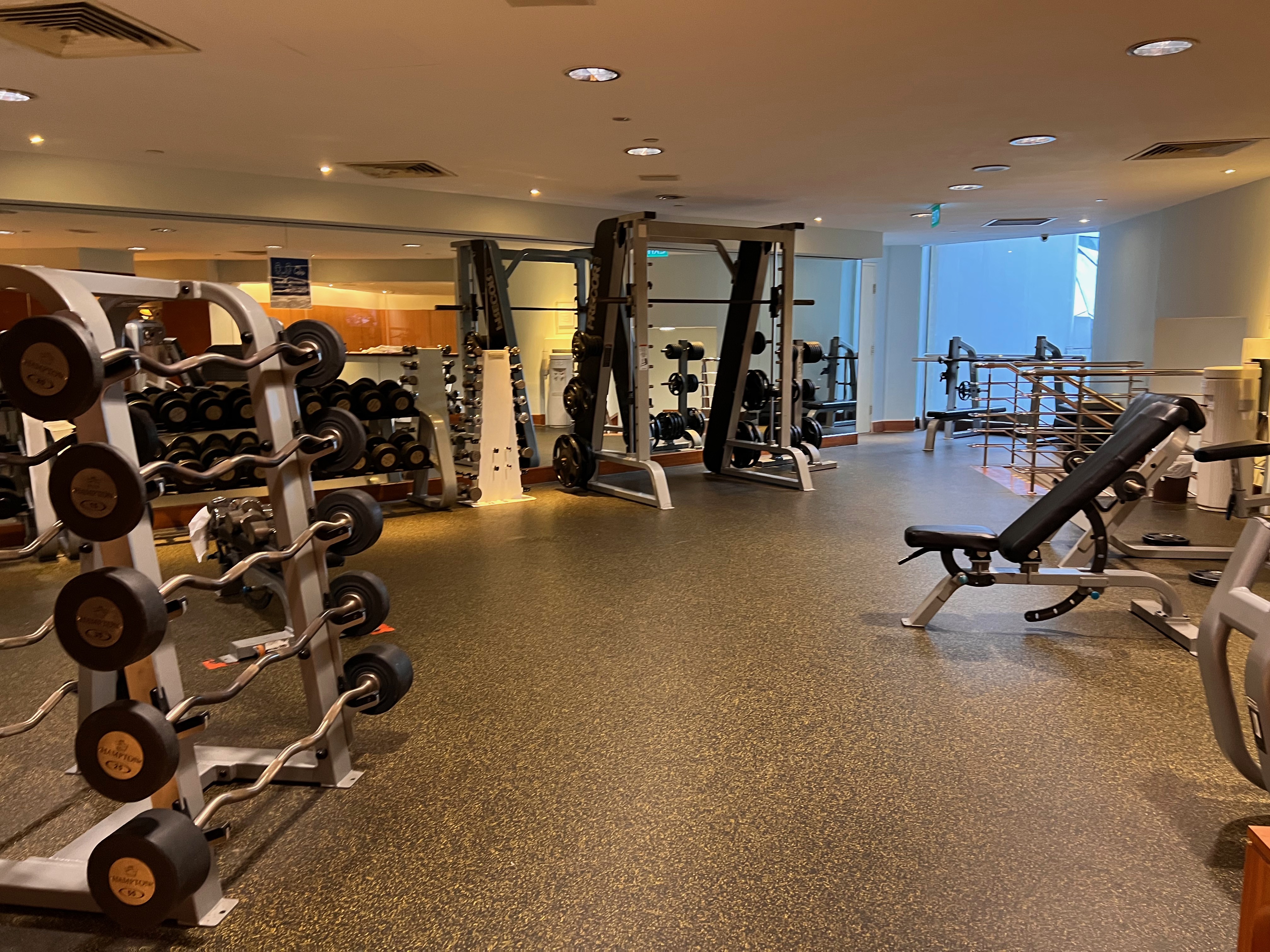The fitness centre in Raffles Sentosa Singapore is housed in a separate colonial building near the Royal China restaurant. The fitness centre has a small setup located on the second level of the building. The centre is only equipped with one strength workout machine, some free weights, and a handful of cardio workout machines. The placement of this fitness equipment made the centre look empty.