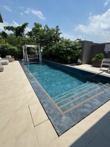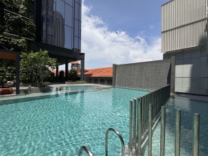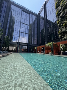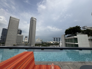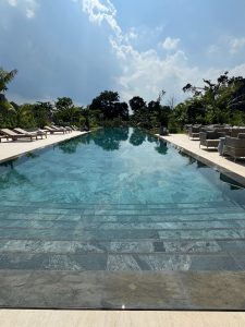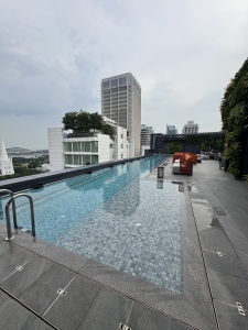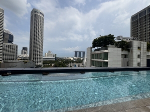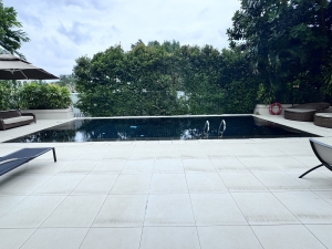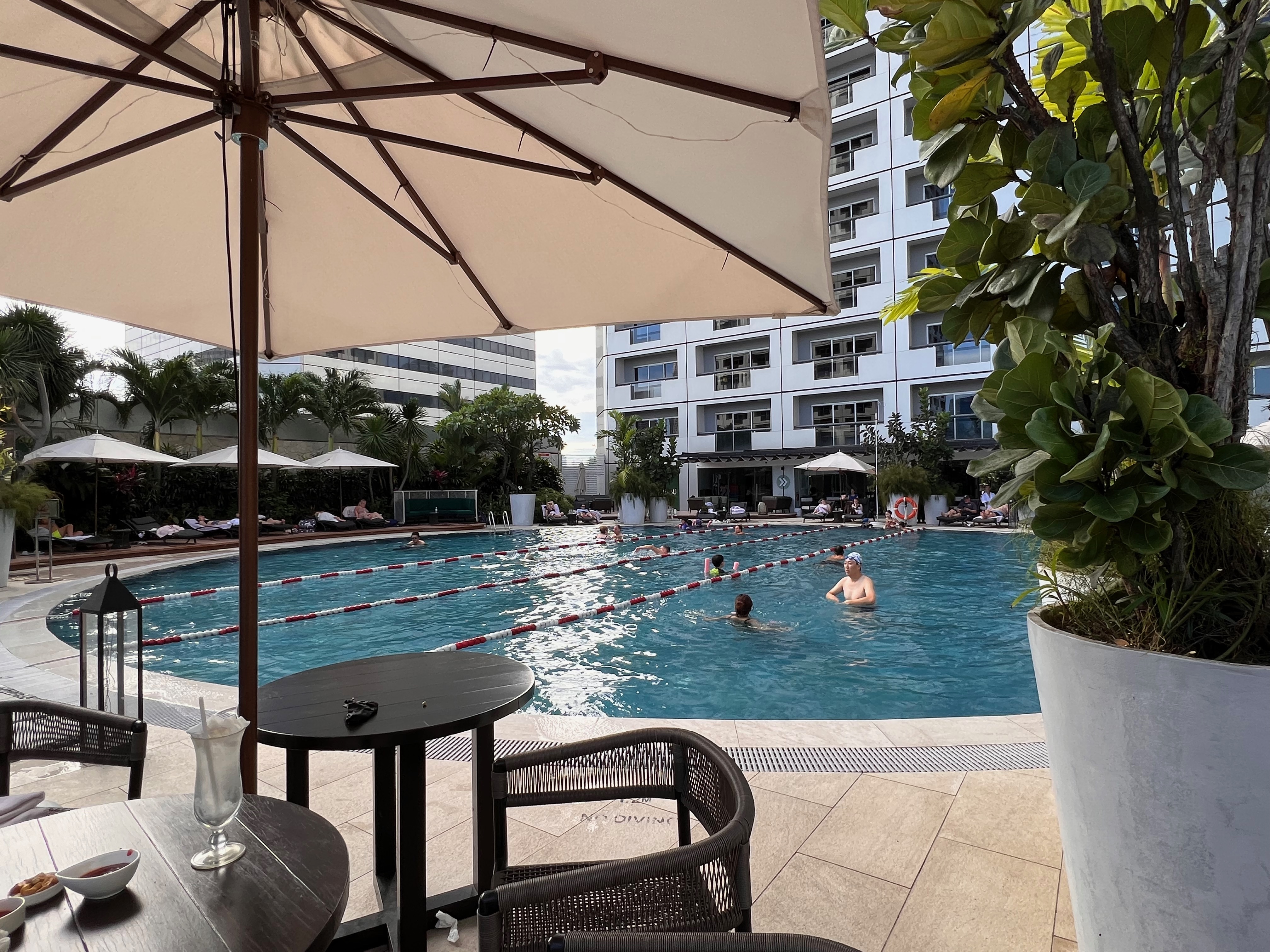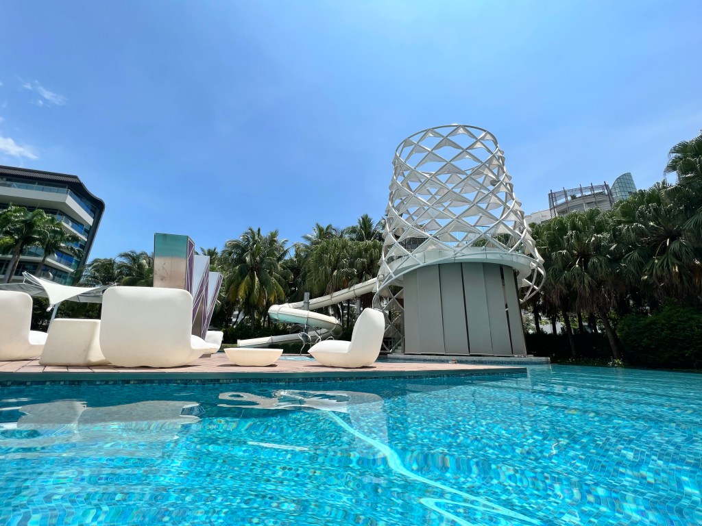 Raffles Sentosa Singapore has a central swimming pool on top of the private pools in all the villas. The main swimming pool is located at the Grill Empire restaurant, in the heart of the resort. The main infinity pool is large enough for guests to do some serious laps, and there is no lack of sun deck chairs around the main pool. It is a great place for guests to get a good tan due to the lack of vegetation to block the sun. There are three cabanas in the main pool for families to enjoy. The pool was empty at our visit, and we are unsure if the emptiness is due to each villa having its own pool or if the resort was still in its soft launch phase.
