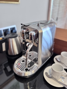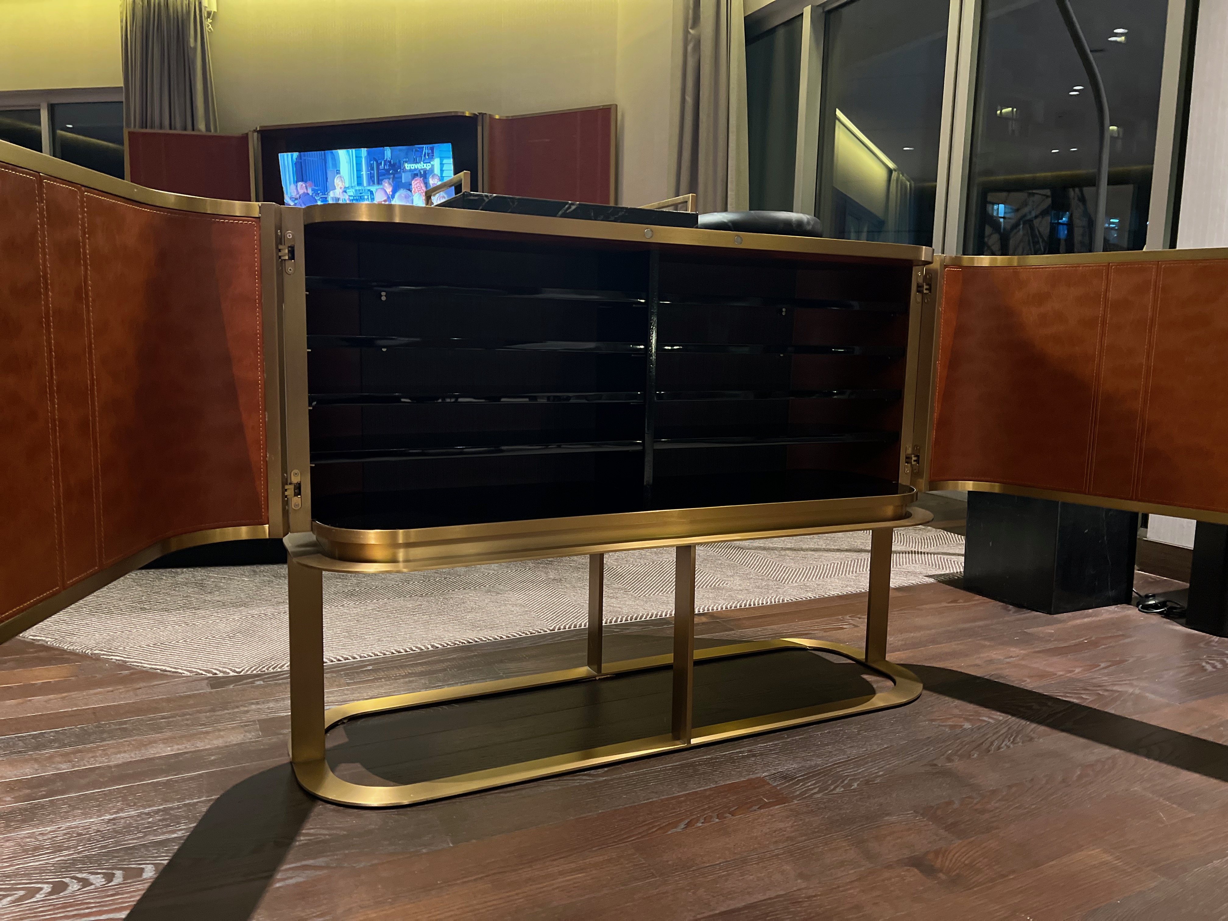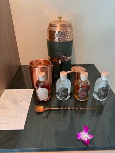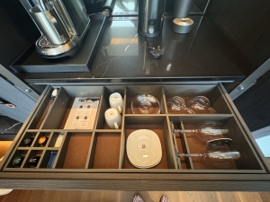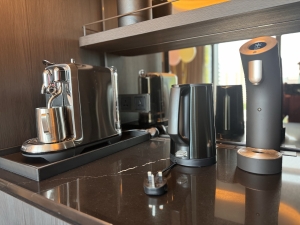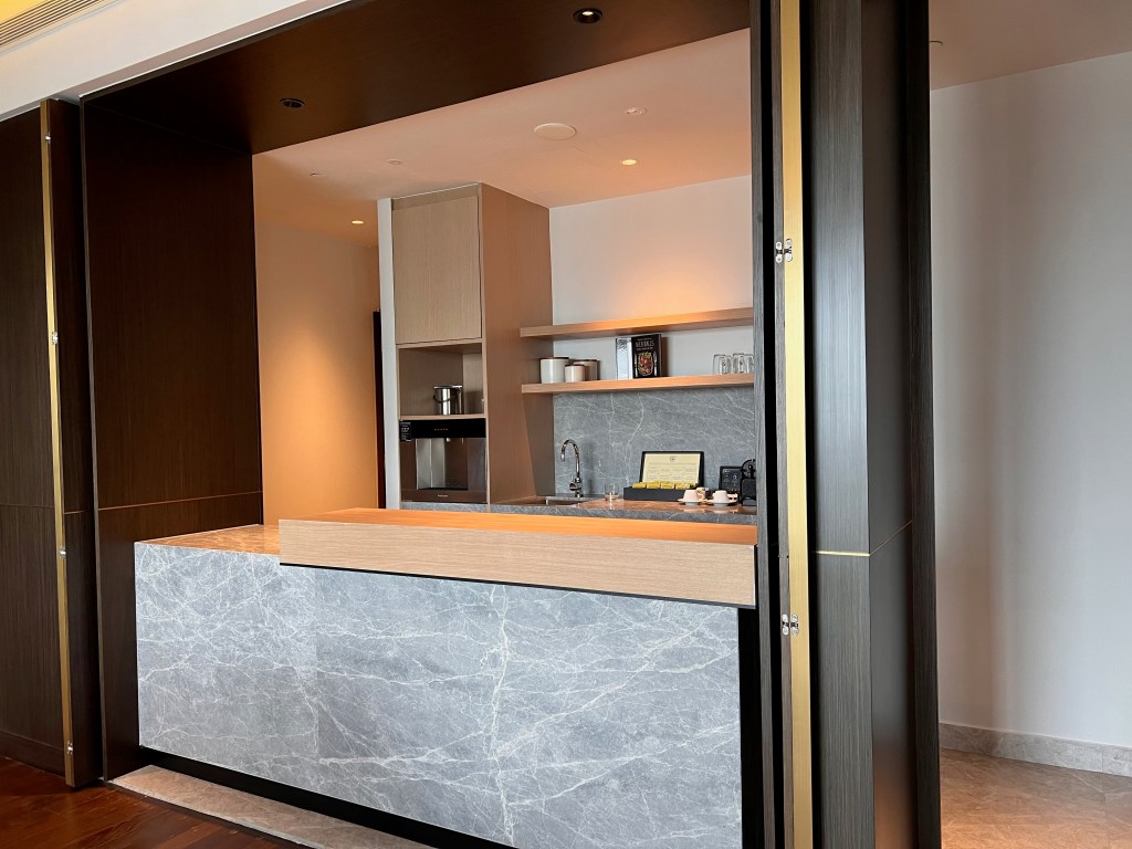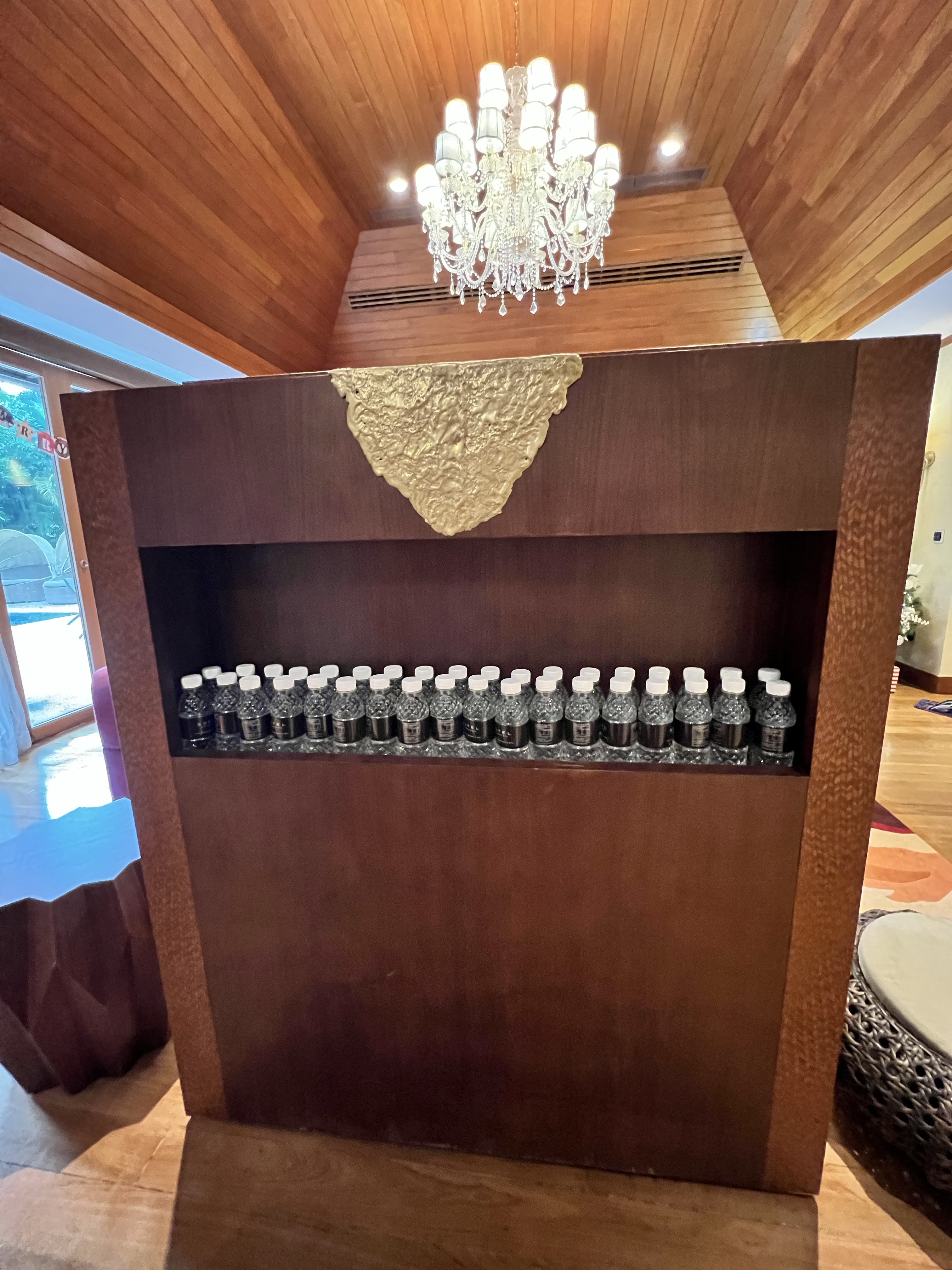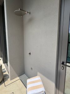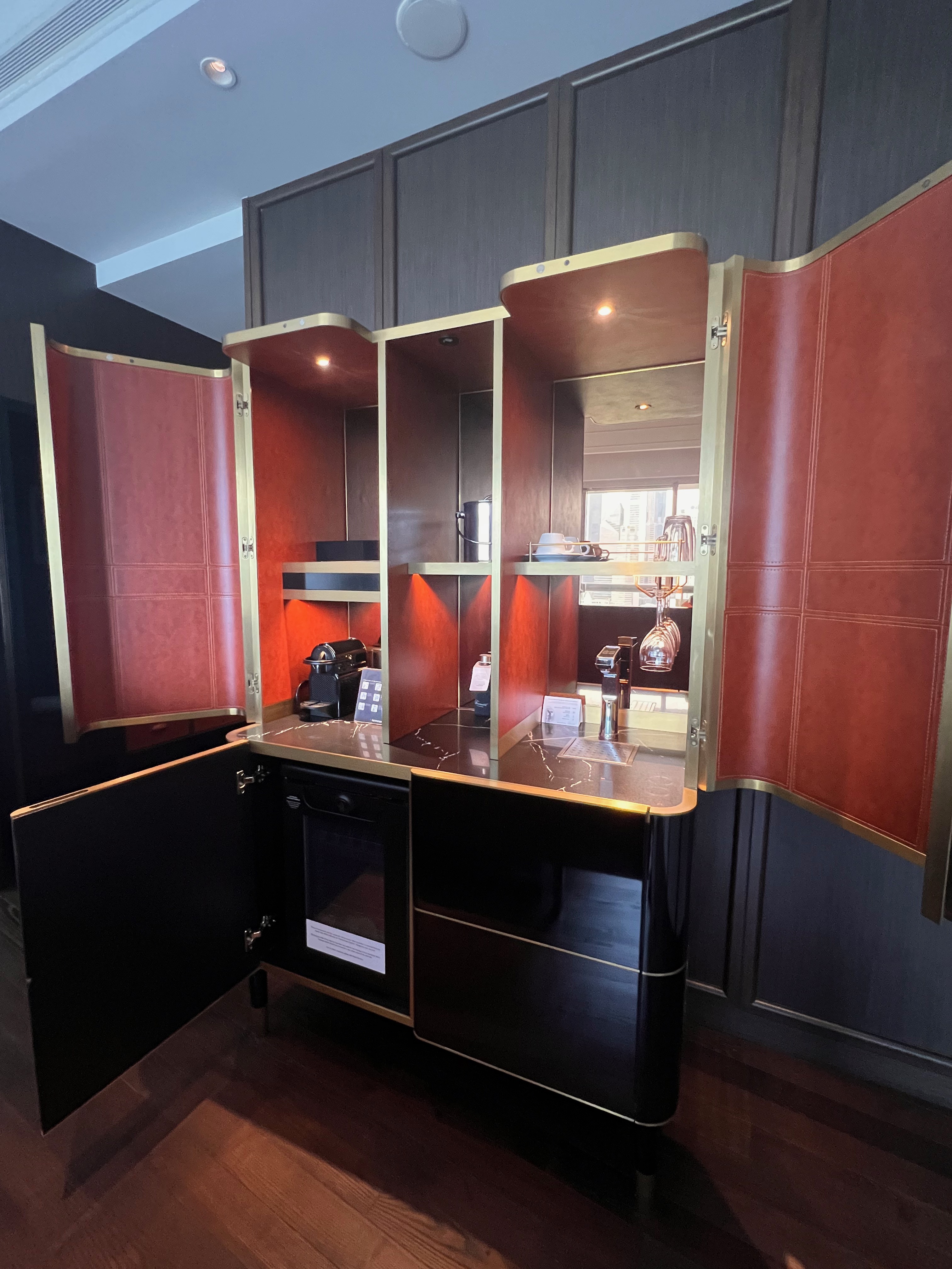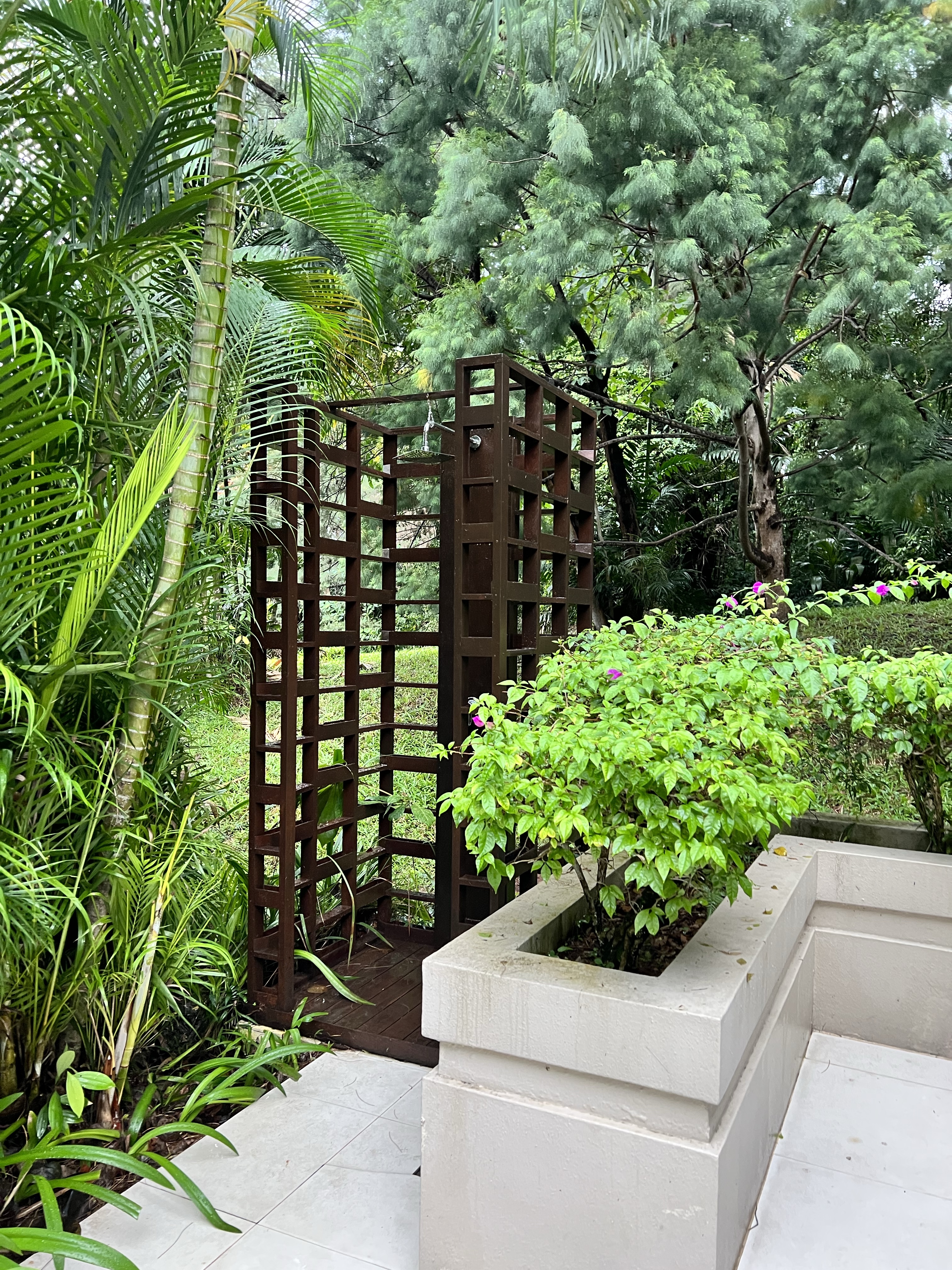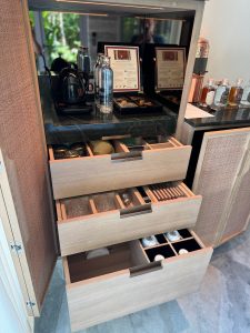 A 55″ flatscreen TV is mounted on the wall beside the couch, loaded with multiple local and international cable channels, where we had no trouble finding a channel for entertainment. Sitting in a corner of the living room pavilion are a couple of minibar cabinets. The wooden cabinets’ wooden mash-designed doors give off a colonial era vibe. The larger cabinet houses complementary coffee and tea. Instead of the usual Nespresso coffee machine, Raffles Sentosa Singapore provides its guests with the top-of-the-range Singaporean brand Bacha coffee and TWG tea. The three drawers inside this cabinet are where we found tea cups and glasses. The short cabinet next to the coffee and tea cabinet houses the in-villa fridge, one of the more unique fridges I have seen. Other than the usual chilling of overpriced beverages, the top tier of this fridge has a wine chiller that can chill up to four bottles of wine. While the living room may be comfortable, I found the lack of a guest bathroom here very inconvenient. Not only would our guests have to travel to the bedroom pavilion to use the toilet, but we also found it troublesome when getting water to make coffee and tea. We also had some issues with the air conditioning in the living room. The air-conditioning will cut off when the doors are not closed properly, resulting in us having to “slam” the heavy doors every time we enter or exit the living room pavilion.