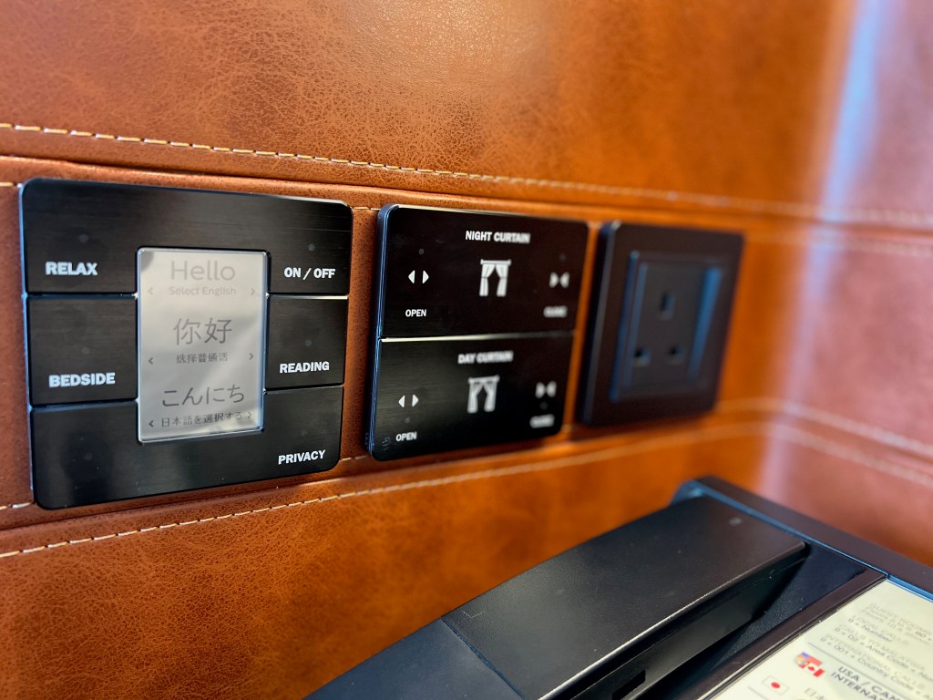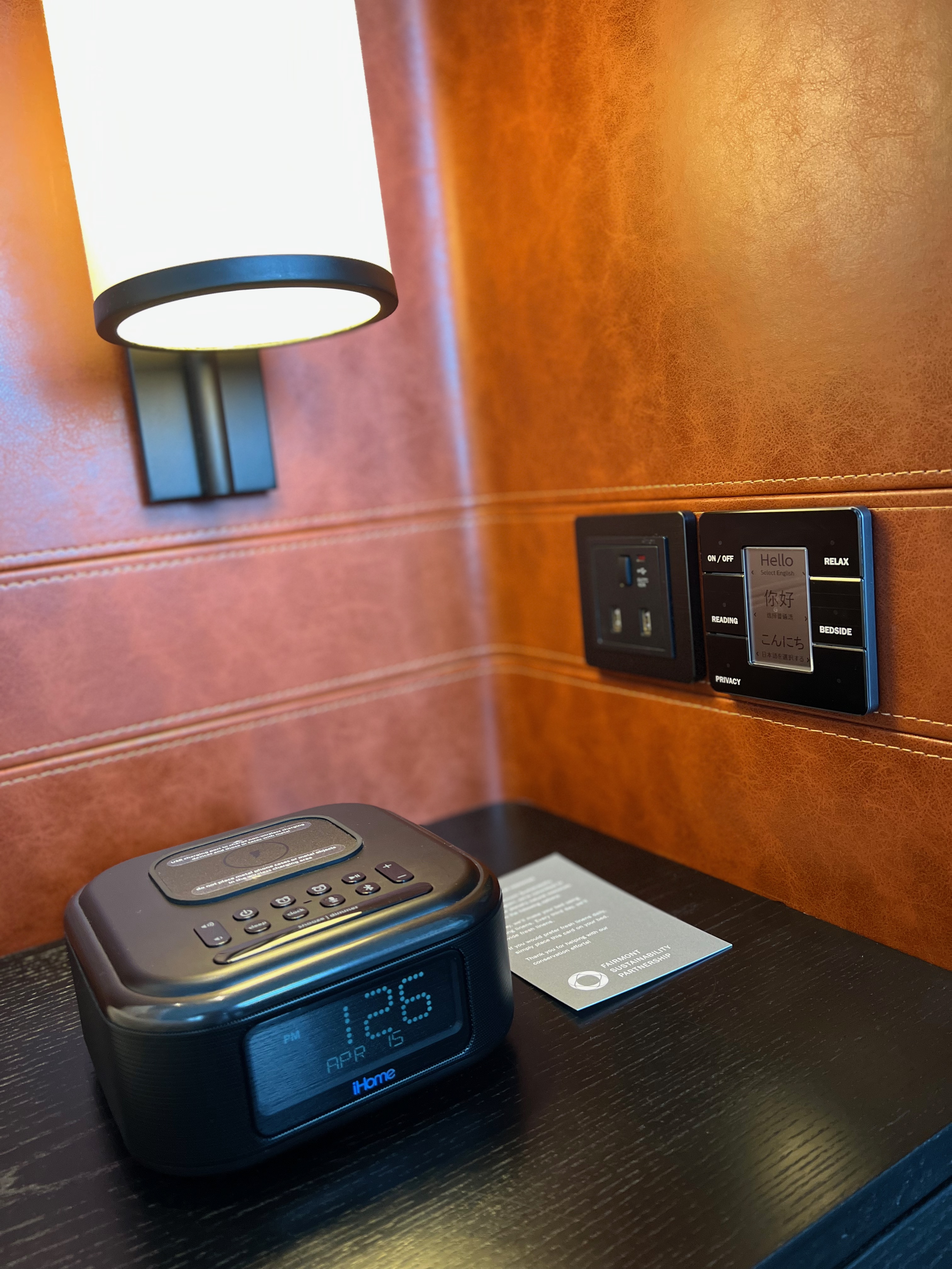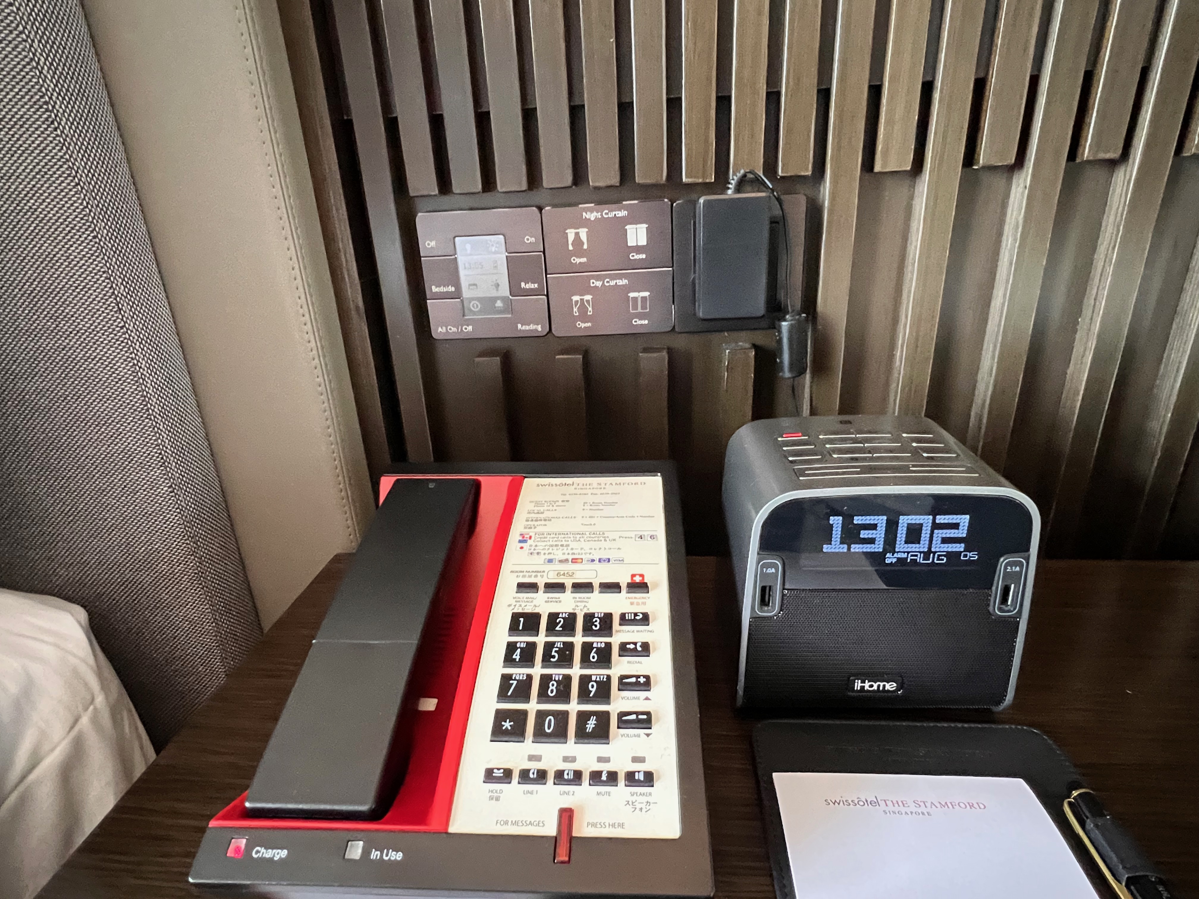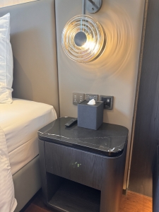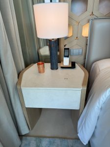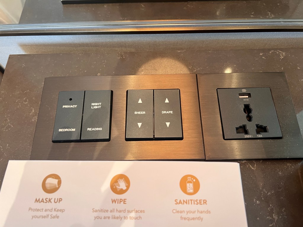 The sleeping area occupies about half the space in the bedroom pavilion. Like the living room pavilion, the sleeping area is fitted with three large panels of sliding doors that can be opened to invite the outdoors in. The nature theme in the living room pavilion is also seen here. Instead of a large greenery painting, the nature theme comes in the form of a wooden feature wall, against which the oversized king bed is placed. The ceiling of the sleeping area is also decked with the same wooden ceiling seen in the living room. The king bed here, positioned to face the private pool, is very comfortable to sleep on, and the mattress is of the right firmness. However, the pillows are too soft for my liking. The resort has a pillow menu (after we checked with the butler team), unfortunately, these pillows are unavailable as the resort was running at full capacity. Despite the softness of the pillows (which usually gave me neck aches), I was still able to get some great sleep on the king bed. I like how Raffles Sentosa Singapore furnished two large bedside tables on both sides of the king bed. These bedside tables come fitted with wireless charging functions, but I found the charging speed slow. The two power outlets are fitted inside the drawers, which gives the bedside tables a clean look.