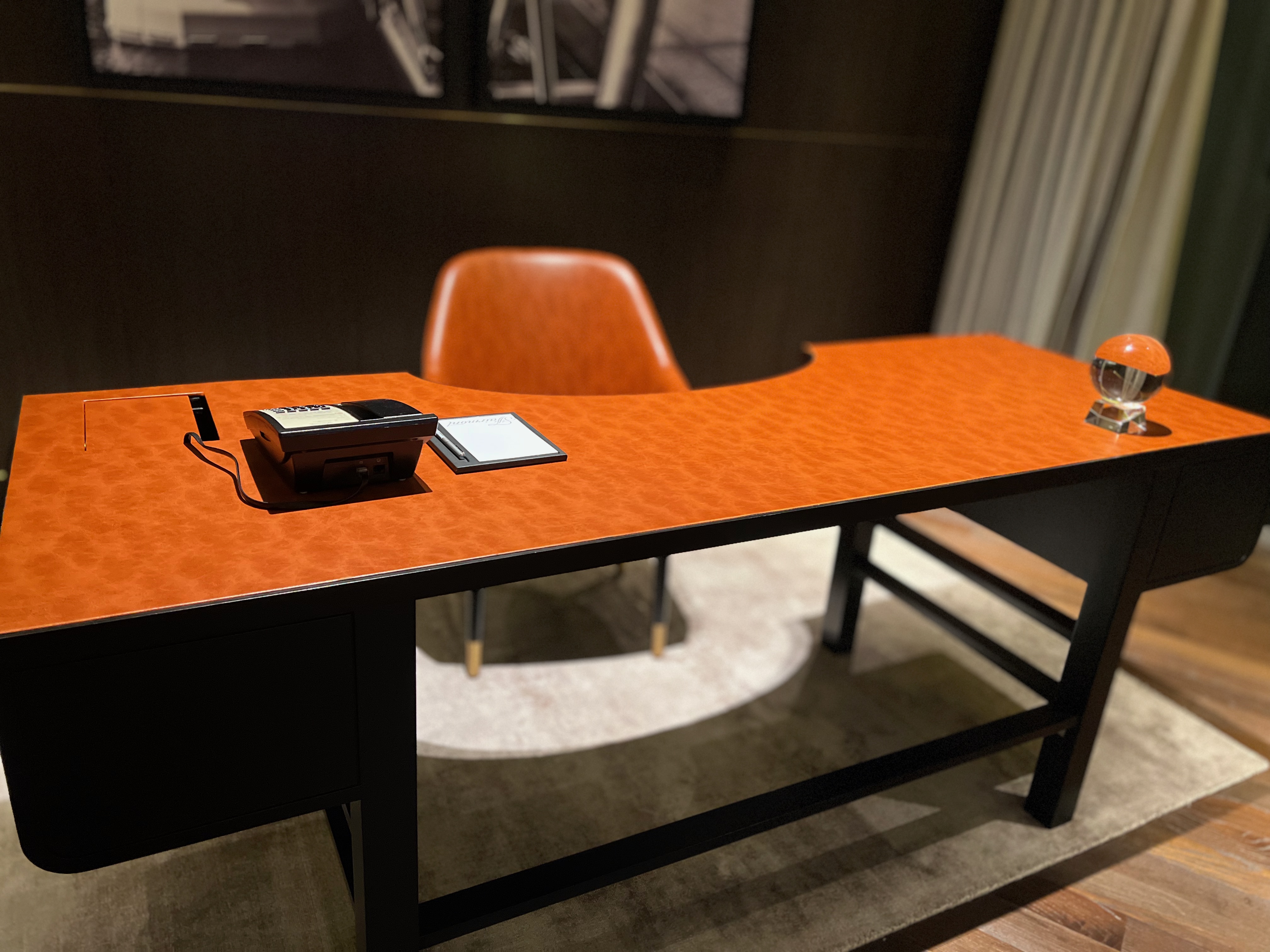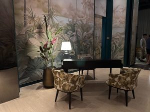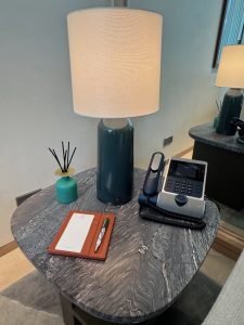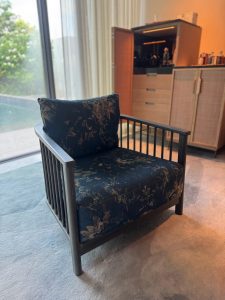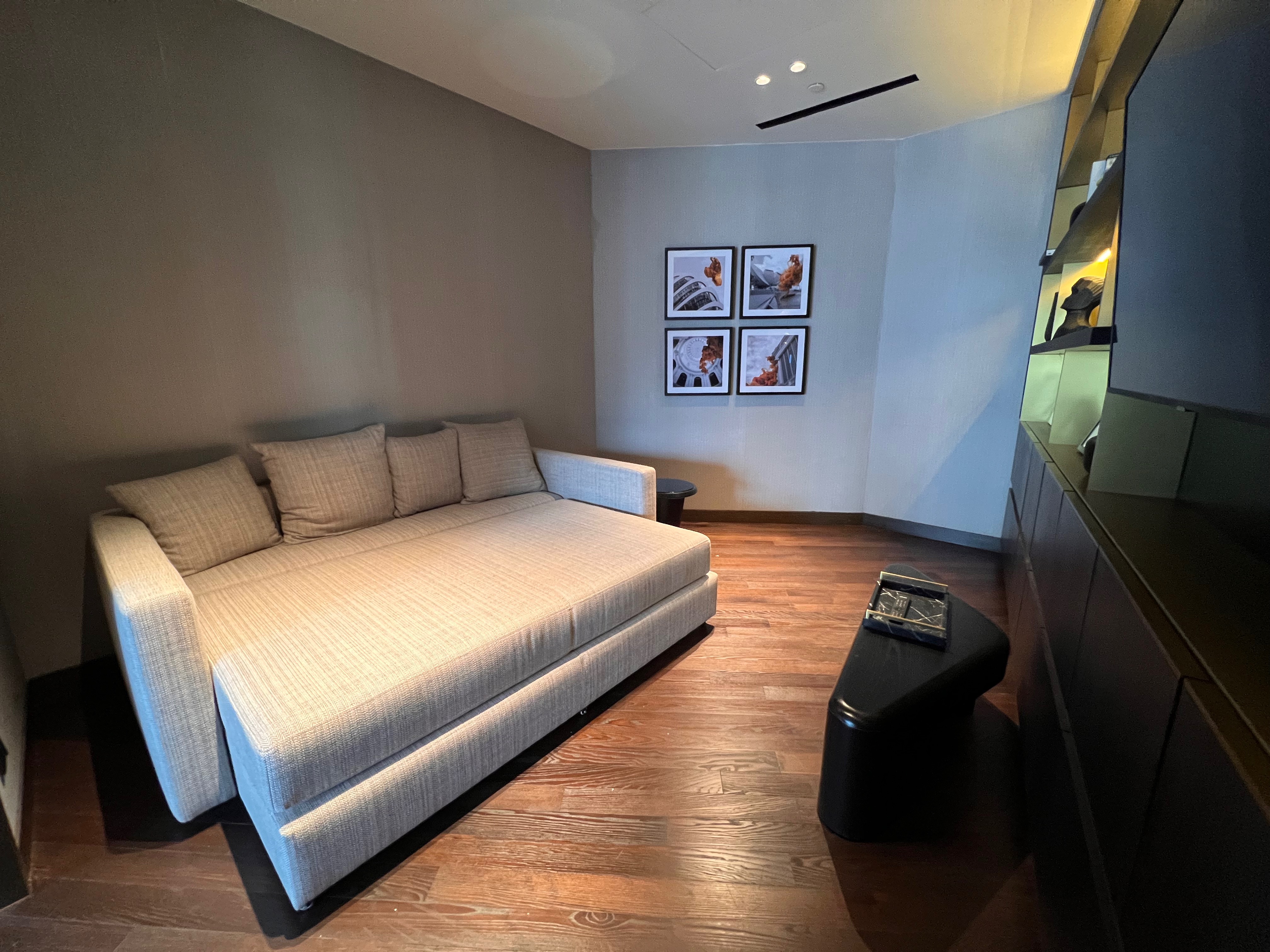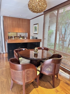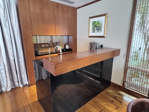 The living room pavilion is housed in a standalone building to the right of the entryway to the villa. From the large painting of the rainforest motif on the wall to the wooden ceiling and the mini bar cabinets, the living room gives off a return to nature vibe. The light blue carpet in the living room, which seems to represent the sea, subtly reminds us that we were on Sentosa Island. This living room has one side of the walls fitted with a floor-to-ceiling window panel, which can be opened to create an indoor-outdoor living concept, further blending into the natural surroundings. The living room is mainly furnished with sitting furniture, with a large couch in front of the rainforest painting. Decked in light green fabric, reinforcing the nature theme, the comfortable couch can sit four adults. There are two other armchairs, one with a similar design to the couch and another wooden armchair decked in navy blue cushions, increasing the seating capacity by two in the living room. In the centre of the living room is a large jade green marble coffee table. A side table is placed between the couch and the armchair, furnished with a table lamp and the in-house phone.