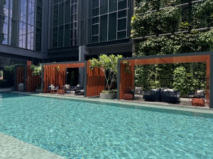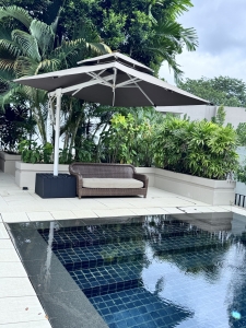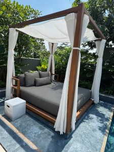 The Sunset 1-Bedroom Pool Villa has a small pool where the two pavilions face. This private pool, partially surrounded by plants inside the private terrace of the villa, is great for families and friends to dip in. Though a little small, the villa’s occupants can use the pool for some laps. A cabana sits on a platform at one end of the pool, which looks like it was floating in the pool. The cabana is perfect for parents to watch over their children playing in the pool or for guests to relax and sunbathe under the intense Sentosa sun.
