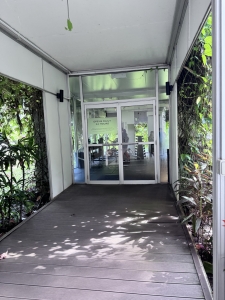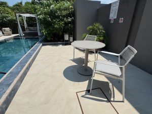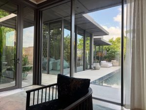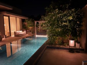 Beyond the large wooden door at the main entrance to our Sunset 1-Bedroom Pool Villa lies a small corridor leading into the private terrace. The entryway is decorated with a bed of greenery on the right, which pays homage to the resort’s natural theme. From the villa’s entryway, we can see the two pavilions on either side of the entryway and our private pool nestled in the centre of the two pavilions.
