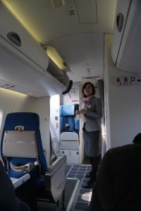All the 74 seats onboard have a pitch of 31″ and width of 17″. The legroom is very good considering it is a single class aircraft. As this is a domestic flight, there are no IFEs onboard. The seats onboard are very basic but comfortable for the 50 min flight time to New Chitose Airport. There is only a button on the armrest for passengers to reclining the seats. The control for lighting is located on the ceiling above our seats. The reading materials are stowed in the single compartment large seat pocket. The single-piece tray table is large enough for one to put a 13″ laptop on comfortably.