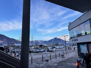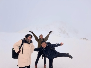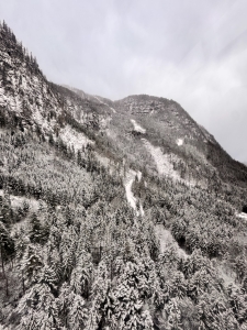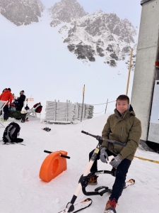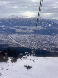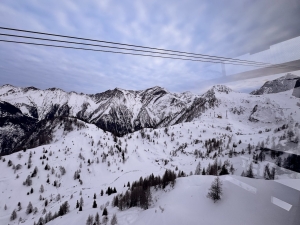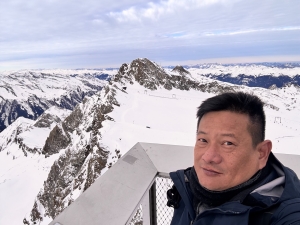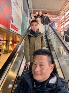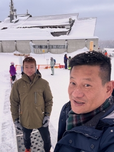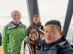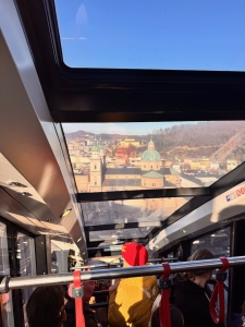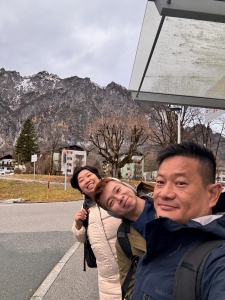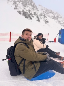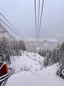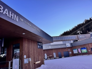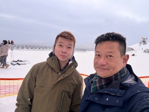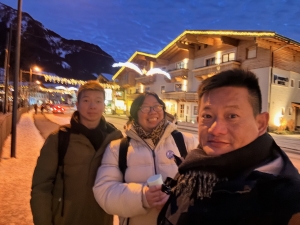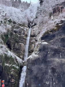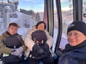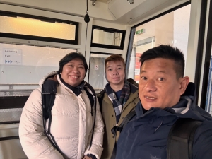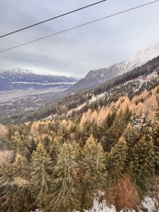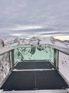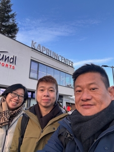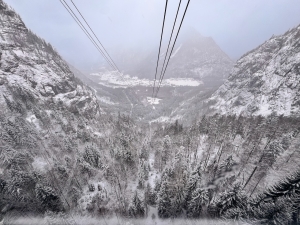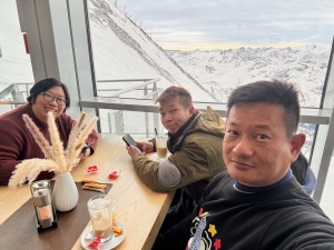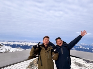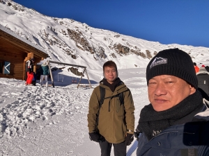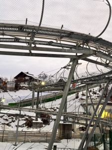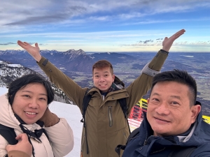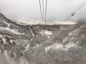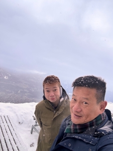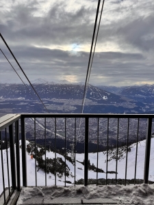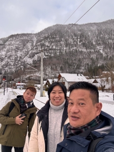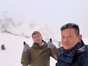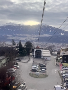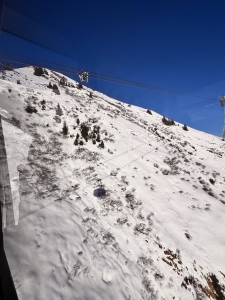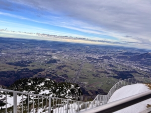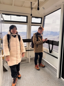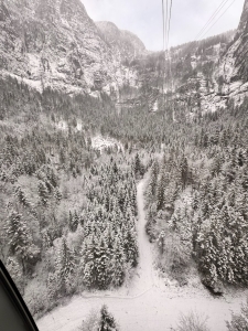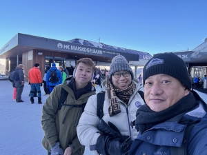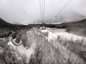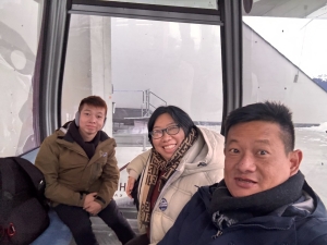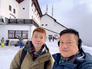 The walk back downslope on the icy path was very challenging. We were unsure if the next step would result in us tumbling down the slope or, worse, down the mountains. We thought the way down was exhausting, both psychologically and physically. After a few minutes of mental challenge in taking our next small step down, my friend and I decided to slide down the slope. It felt safer, but our bums suffered. Soon, we were at the same wooden lodge we had seen earlier and knew we were close to the summit station. The final stretch downslope to the summit station was very icy and slippery. Fortunately, we saw a path leading to the station’s terrace deck (the second floor), which was easier to walk on. We finally made it back to the station and had lunch in the restaurant to reward our efforts (partly because we were hungry) while waiting for the next cable car down (cable cars depart the station at the quarter of the hour).