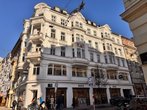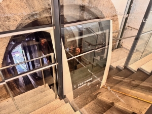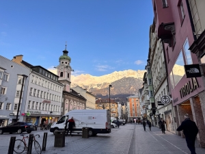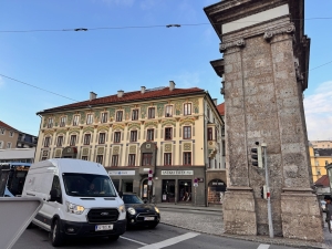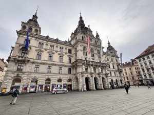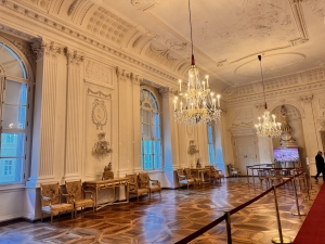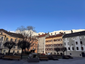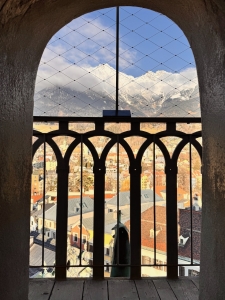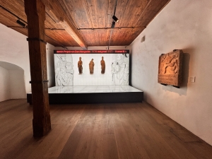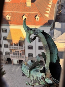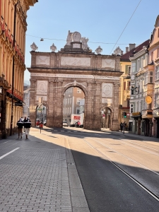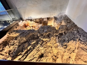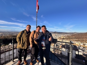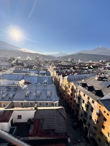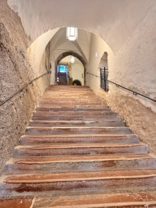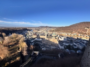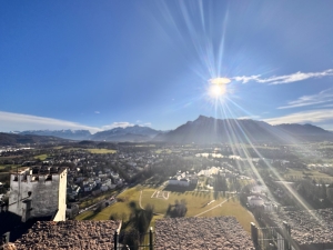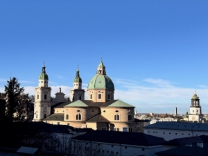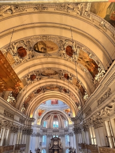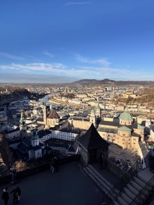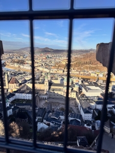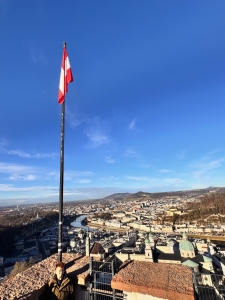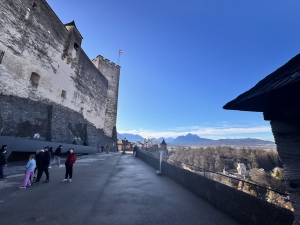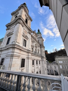The State Rooms served as the prince-archbishop’s residence and was where he worked. There were 10 staterooms opened to the public, each serving a purpose, with the first few rooms serving as the guard’s room or waiting rooms for people who wanted an audience with the prince-archbishop. All of these rooms had different frescos painted on their ceilings, with some depicting the rulers claiming their success and some with paintings of the gods interacting with humans. Of these 10 rooms, I thought the Conference Hall (the second room from the Carabinieri Hall) and the Audience Hall (the fourth room from Carabinieri Hall) were the most interesting. The Conference Hall has a bright red velvet wall, which is more vibrant than most of the rooms we have seen. The four crystal chandeliers hanging from the ceiling and the elaborate ceiling frescos accompanied by the carvings on the ceiling made the room look posh. Here, Mozart first performed as a child at 7 (although we saw the piano Mozart used in the next room). The other significant room was the Audience Hall, filled with large, costly hand-woven tapestries from the era of Prince-Archbishop Wolf Dietrich. Here, we met a museum staff who generously shared some facts about the rooms (and the subsequent few rooms) and somewhat became our private guide. The staff told us that the Audience Hall is the most valuable room in the entire DomQuartier due to the antique tapestries and the Louis XVI furniture purchased in 1775 in the Audience Hall. The last door of the State Rooms opened up to the Cathedral Archway Terrace.