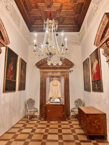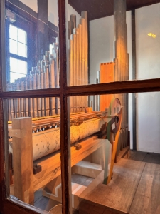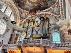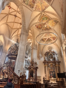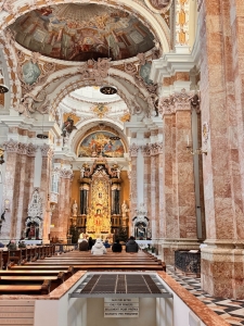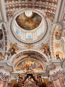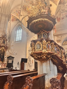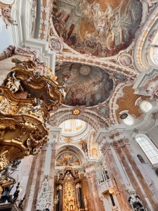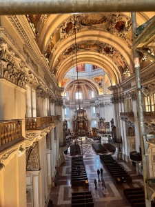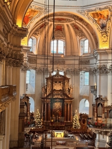 Our walk through the DomQuartier led us through the main organ loft. We originally wanted to visit the Salzburg Cathedral before coming to DomQuartier, but the entrance to the cathedral was not included in our Salzburg Card, which we eventually skipped. Little did we know that part of the DomQuartier included the entrance to the loft of Salzburg Cathedral. However, we were only allowed to stay at this loft at the cathedral. The highlight of the loft is our ability to get up close to the cathedral’s organ. However, we were more interested in the over-the-top baroque-style architecture inside the Salzburg Cathedral. From the loft, we were closer to the carvings on the pillars and the fresco painting on the ceiling. We were also able to see the altar from a distance.