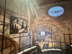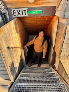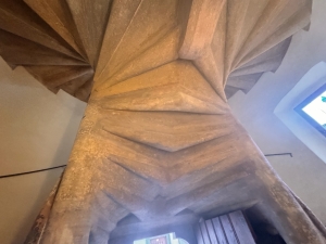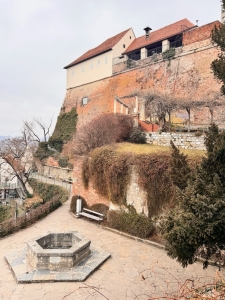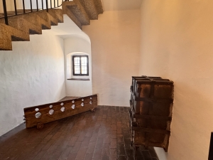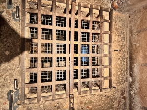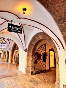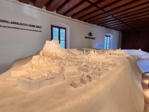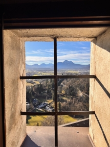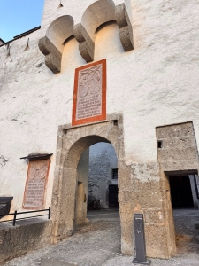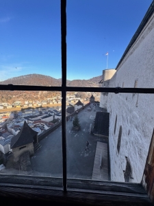 We headed inside the door for the Panorama Tour, which took us from the salt depot through the dungeon and finally to the viewing platform. The Panorama Tour is very easy to follow, there is only one way with stations and introduction of the various parts of the inner Fortress. First, we walked past a set of windows that gave us a good view of Salzburg City below, but I thought the views here paled in comparison to that from the bastion. The first room the walkway led us to was the Salt Depot, filled with a white table-like structure (which could be salt deposits) and a detailed model of Salzburg’s old town and the Fortress. There are panels explaining how Salzburg came to be and its connection with salt. Further on the path was the prison block. On the ground floor, the dungeon was visible through a metal grate on the floor. There are brief introductions about the prison cells and the dungeon in this room. Other than the grated floor and the exhibits, a wooden spiral staircase would lead us to the tower’s top deck. There were some empty rooms with nothing but a wooden chest on each floor of the tower. These would be prison cells. I thought the highlight of the Panorama Tour was the view from the platform above the prison cell block. From here, we can see the city of Salzburg and enjoy views of the surrounding Alps. We could also see Untersburg, which we visited in the morning. Descending from the tower, the rest of the tour was rather uneventful. We walked past some windows that gave us some good views of Salzburg from the Fortress. When we exited the building at the end of the walkway, we ended back in the courtyard, not far from where we entered the building earlier.