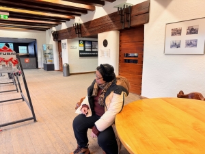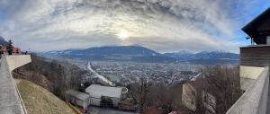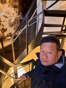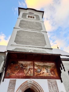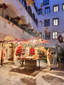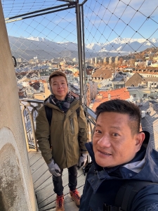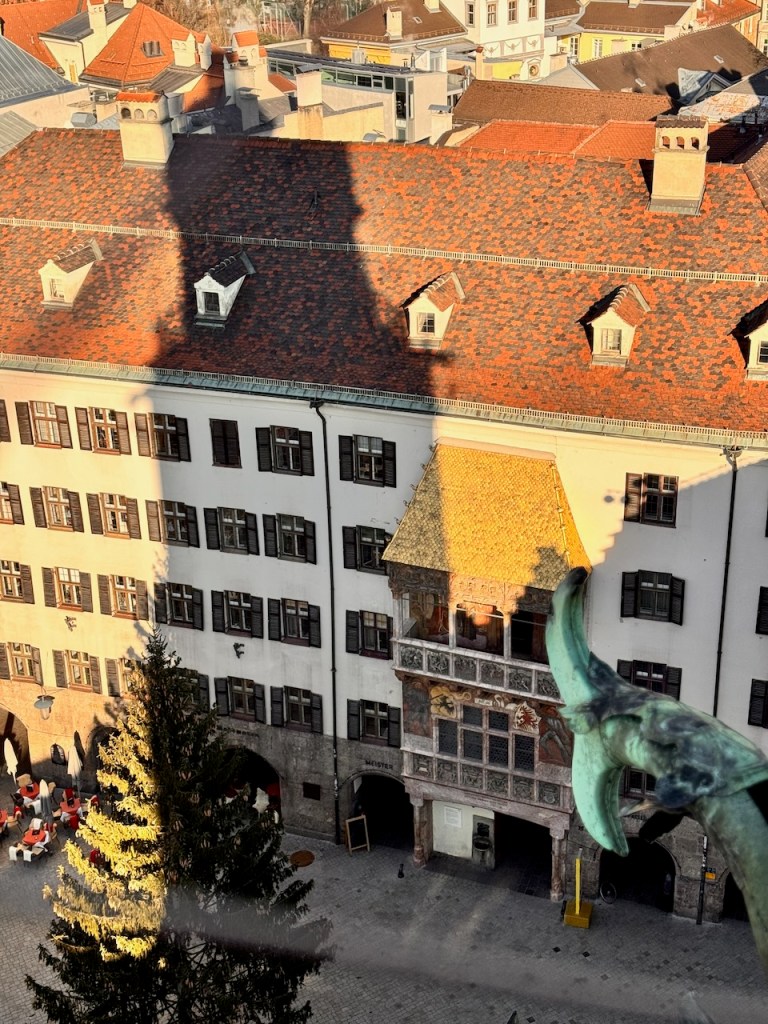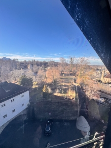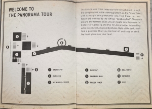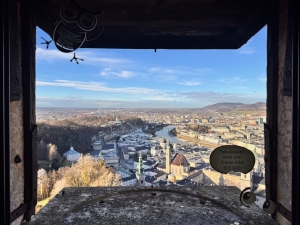 Taking the Festungsbahn is the fastest and easiest way to access Hohensalzburg Fortress (the other option was to walk up), which takes less than one minute to reach the top station. Exiting the station, we saw a German sign pointing us in two directions: to the left is “Tower Aussichtsturm”, and to the right is “Dinner & Konzert”. Not knowing what it meant, we assumed the right would bring us to some restaurant and took the left turn. This direction brought us to a large bastion where we got some really amazing views of Salzburg City. From here, we could see the Salzburg Cathedral towering over the buildings in Alstadt and the newer parts of the city further beyond, with the Salzach River running between the two areas. At this bastion, we could feel the graduere of the Fortress. We climbed the only stairs that seemingly led to the inner Fortress. While climbing the stairs, we realised the first landing gave us a better photo shot with Salzburg City below (highly recommended to take pictures here). The staircase landed us in the courtyards. Some unmarked buildings and small huts occupied the space in this courtyard, suggesting that Christmas markets might be operating here. From the staircase, we saw a sign marked “Panorama Tour” hanging from the side of the building wall, which was our next stop.