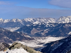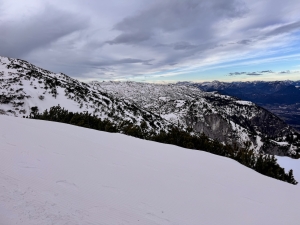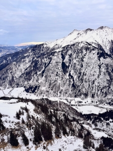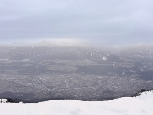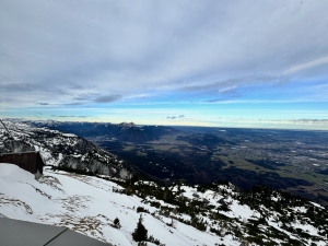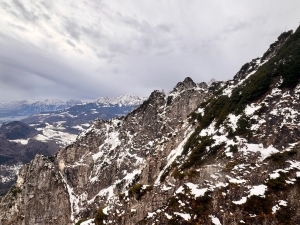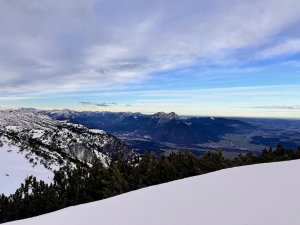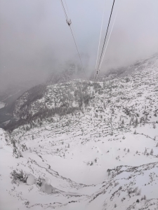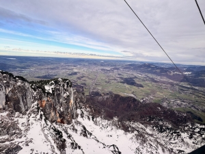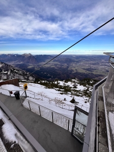 One of the ways to maximise the value of our Salzburg card is to visit Untersberg, the mountain ranges that span into neighbouring Germany. Our Salzburg card included a return cable car ride (€32 for a return cable car ride) to the summit station at Geiereck, about 1,776m in the Alps on the Salzburg side of the mountain ranges. To get to the base station of the Untersbergbahn, we took bus #5 from Salzburg Hauptbahnhof (€2.50 one way from Salzburg City) to the final stop of Untersbergbahn. Bus #25 also runs from Salzburg Hauptbahnhof to the base station. The cable car ride took about 8 mins up to the top. As we ascended the mountain, we saw the mighty surrounding mountain ranges sitting magnificently across the land in their white snow cap. As we approached the summit, the terrain below us turned from lush grassy plains to sharp mountain edges. Soon, we saw traces of snow draping on the mountain terrain below us. The snow coverage area increased as we were closer to the summit station. Passing the last cable car pylon, we were immersed in a snowy wonderland.