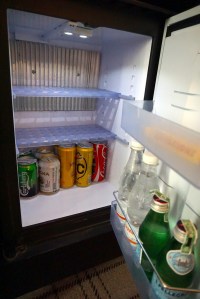 Opposite the bed, is a large table with the TV placed onto it, There are three drawers on the table for guests to store their stuff. There is a long beach placed underneath the table, which one can use to place their luggage on. Complimentary coffee and tea can be found in one of the three drawers. To the right of the table, near to the entrance of the room is where one can find a minibar area, with the bar fridge well-concealed on the bottom shelf.