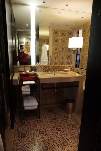 The room I checked in is the Grand King room. Upon checking in, I was upgraded to the Grand King View room. The difference between the two rooms is the view. While the Grand King room faces the back of the hotel, the Grand King View room faces the front of the hotel. Upon entering the rustic room, the entrance to the bathroom is immediate to the right side. The squarish designed bathroom feels compact and luxurious at the same time, extending the rustic feel from the entrance of the room. There are a couple of cubicles on the left of the entrance to the bathroom. The first cubicle is the walk-in shower with both rain shower and regular massage showerhead, and the cubicle next to it, next to the sink is the toilet. There is no additional door to the toilet cubicle. The sink feels rather small, but sufficient for one to place one’s additional toiletries. Opposite the cubicles, by a foldable door that opens to the room, in the bathtub. There are speakers piped into the bathroom so that one can watch the TV from the tub with the sound from the TV.