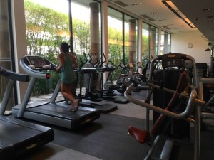 The gym is also located on the 5th floor of the hotel. The gym is quite well equipped with treadmills, press machines. There is a small counter serving drinks and complimentary bottled water next to the gym. Towels are available on the shelves outside the gym.