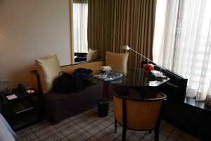 Walking past the wardrobe, the room opens up to the spacious bedroom. Right around the corner, one can find a king bed. The bed is very comfortable and allowed a very well needed rest for the night after all the walking in Bangkok. There is also a pillow menu for guests to choose from different types of pillows to suit one’s needs. There is a shelf to the left of the bed with a pot acting as a decoration in the room. The bottom part of the shelf houses a radio and control for the switches in the room. There is sufficient room for one to place one’s mobile phone while charging on the bottom shelf. To the right of the bed is a bedside table with a phone and another switch control. To the right of the bedside table, further into the room and nicely tucked into a corner of the room facing the window is a couch and a glass top table. The couch is oddly placed in the room and perhaps intended to function more like chairs for the table than for one to relax in and watch the TV. The large-sized glass table functions as both a work desk, with most of the international adaptor powerpoints at the side of the table, and a dining table. There is a lamp on the table. There is another armchair placed at the glass table.
