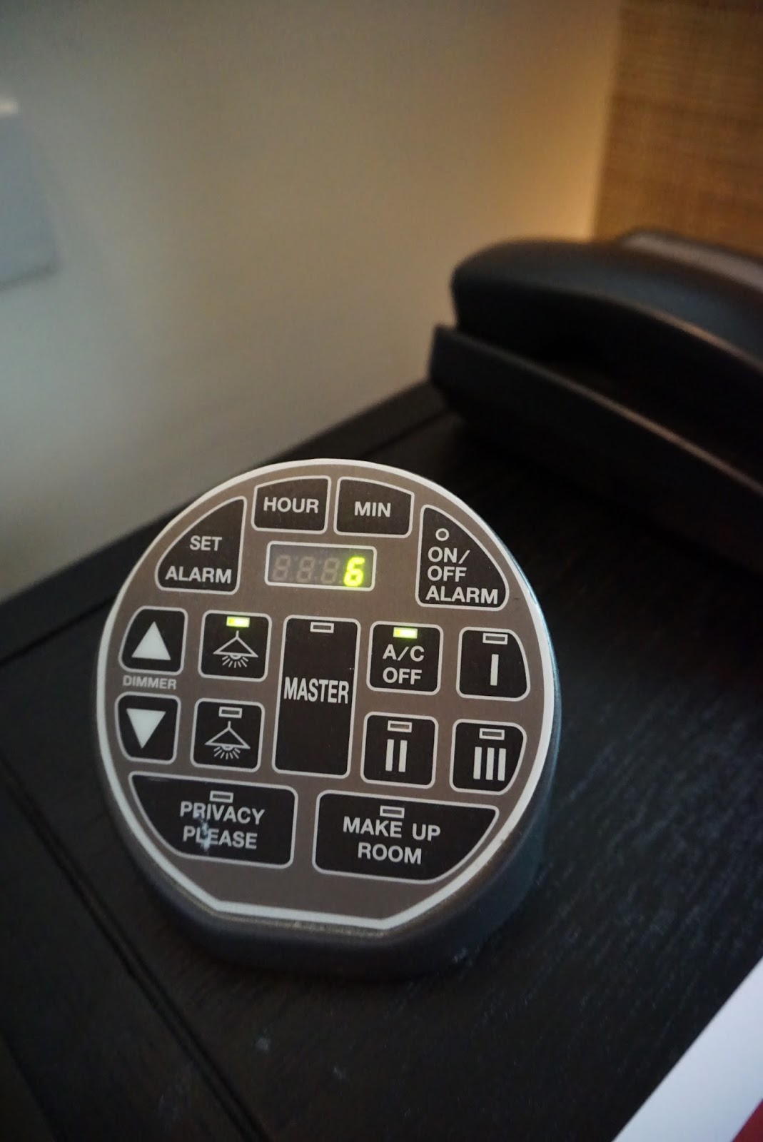 Walking past the wardrobe, the room opens up to the spacious bedroom. Right around the corner, one can find a king bed. The bed is very comfortable and allowed a very well needed rest for the night after all the walking in Bangkok. There is also a pillow menu for guests to choose from different types of pillows to suit one’s needs. There is a shelf to the left of the bed with a pot acting as a decoration in the room. The bottom part of the shelf houses a radio and control for the switches in the room. There is sufficient room for one to place one’s mobile phone while charging on the bottom shelf. To the right of the bed is a bedside table with a phone and another switch control. To the right of the bedside table, further into the room and nicely tucked into a corner of the room facing the window is a couch and a glass top table. The couch is oddly placed in the room and perhaps intended to function more like chairs for the table than for one to relax in and watch the TV. The large-sized glass table functions as both a work desk, with most of the international adaptor powerpoints at the side of the table, and a dining table. There is a lamp on the table. There is another armchair placed at the glass table.