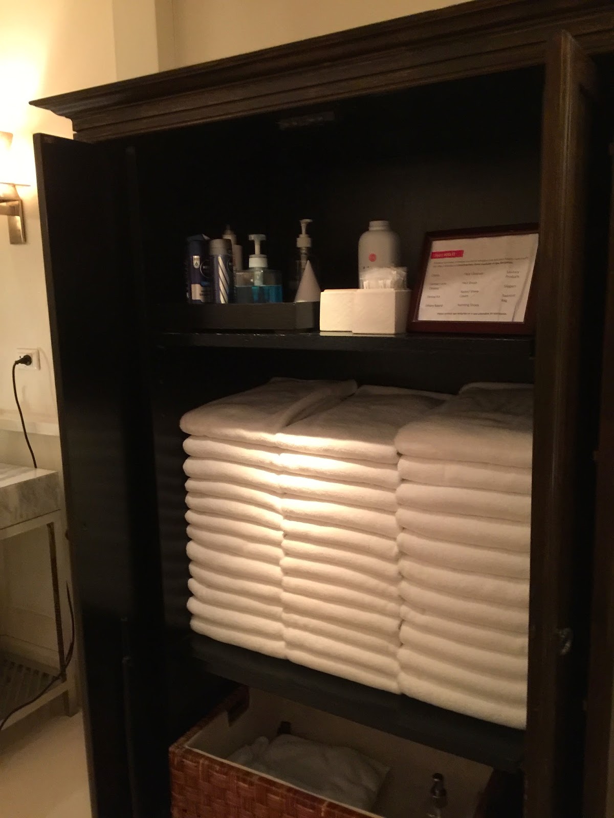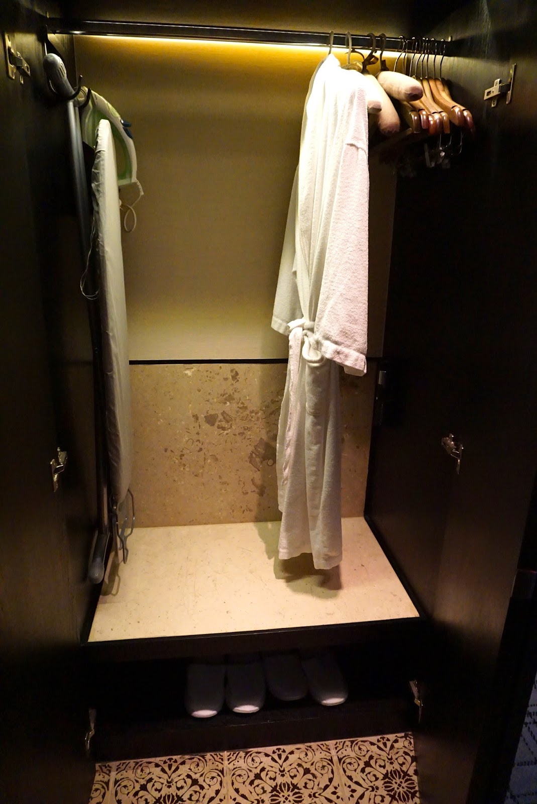 After the entrance to the bathroom is the wardrobe area. There are two sections to the wardrobe – the open part and the enclosed part. The open portion has five-tier shelving with the safe occupying the centre tier, whiles there are baskets for guests to put their stuff into for the rest of the shelves. The enclosed part of the wardrobe is purely for guest to hang their clothing. There is sufficient room for one to hang up to two weeks of clothing.
