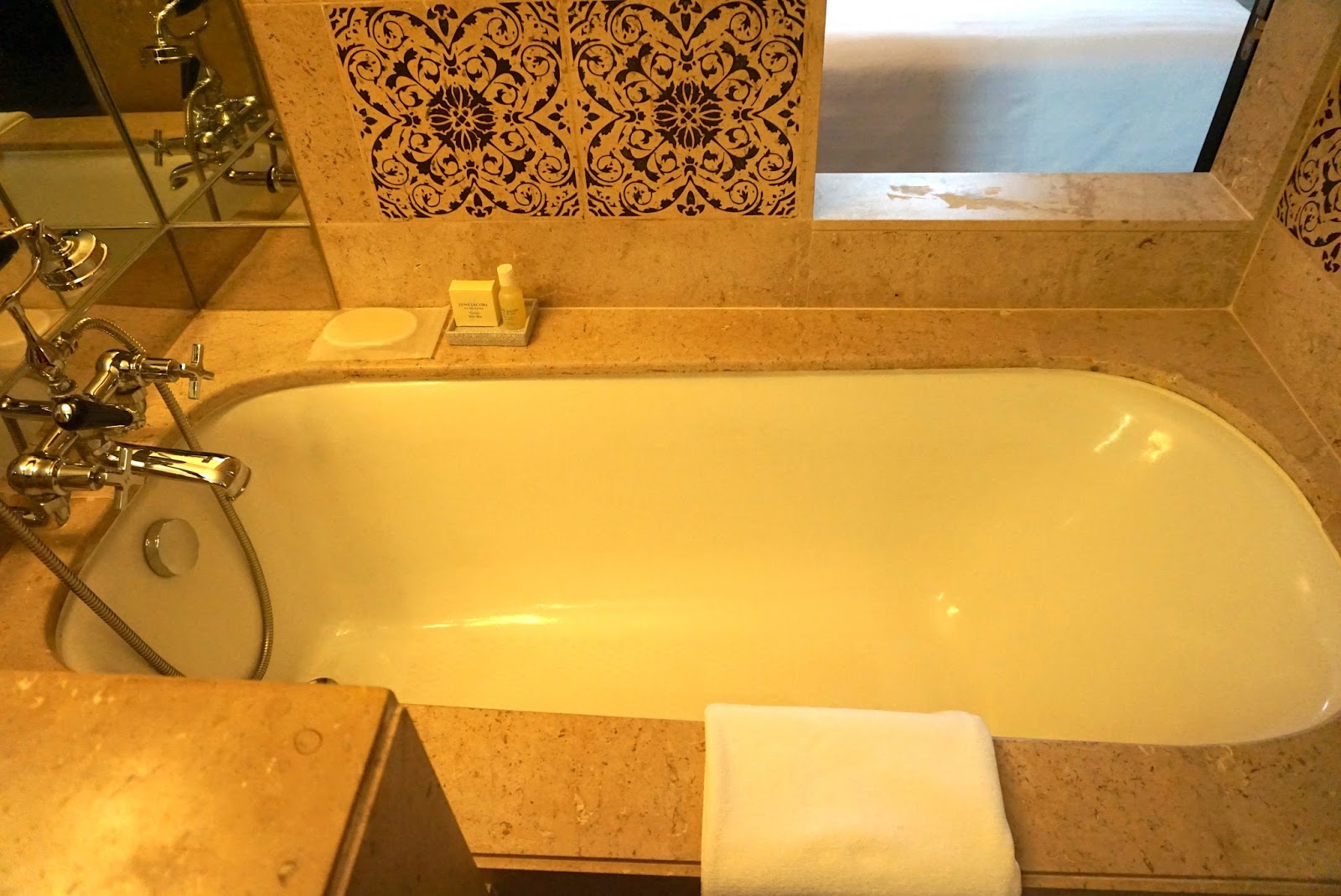 The room I checked in is the Grand King room. Upon checking in, I was upgraded to the Grand King View room. The difference between the two rooms is the view. While the Grand King room faces the back of the hotel, the Grand King View room faces the front of the hotel. Upon entering the rustic room, the entrance to the bathroom is immediate to the right side. The squarish designed bathroom feels compact and luxurious at the same time, extending the rustic feel from the entrance of the room. There are a couple of cubicles on the left of the entrance to the bathroom. The first cubicle is the walk-in shower with both rain shower and regular massage showerhead, and the cubicle next to it, next to the sink is the toilet. There is no additional door to the toilet cubicle. The sink feels rather small, but sufficient for one to place one’s additional toiletries. Opposite the cubicles, by a foldable door that opens to the room, in the bathtub. There are speakers piped into the bathroom so that one can watch the TV from the tub with the sound from the TV.