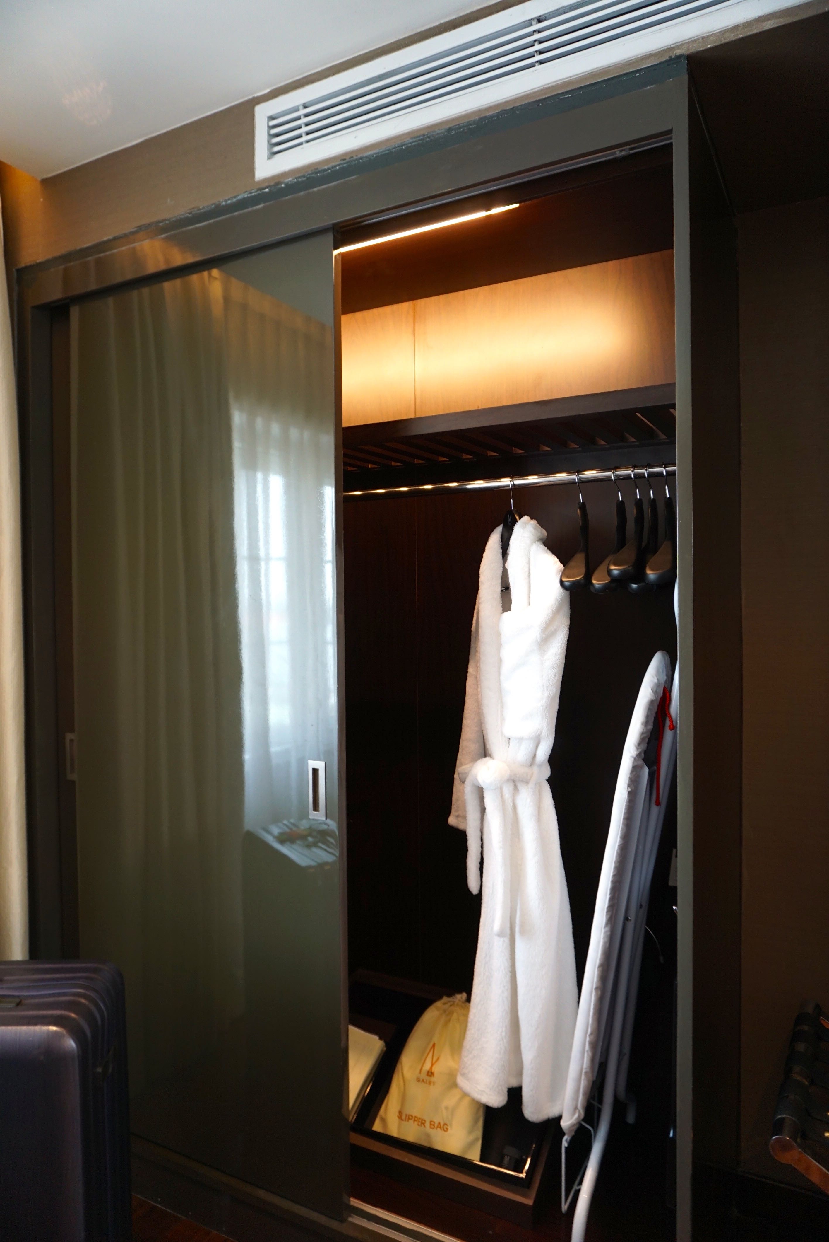 At the end of the suite, behind the minibar area is a double panel wardrobe. The size of the wardrobe is alright, sufficient for us to place our four days worth of clothing. Guests can find an in-room safe placed on top of the three-tiered drawer inside the wardrobe. Iron and ironing board are also well placed inside the wardrobe, which does not obstruct the use of the wardrobe space. On the right side of the wardrobe is where one can hang longer garments.
