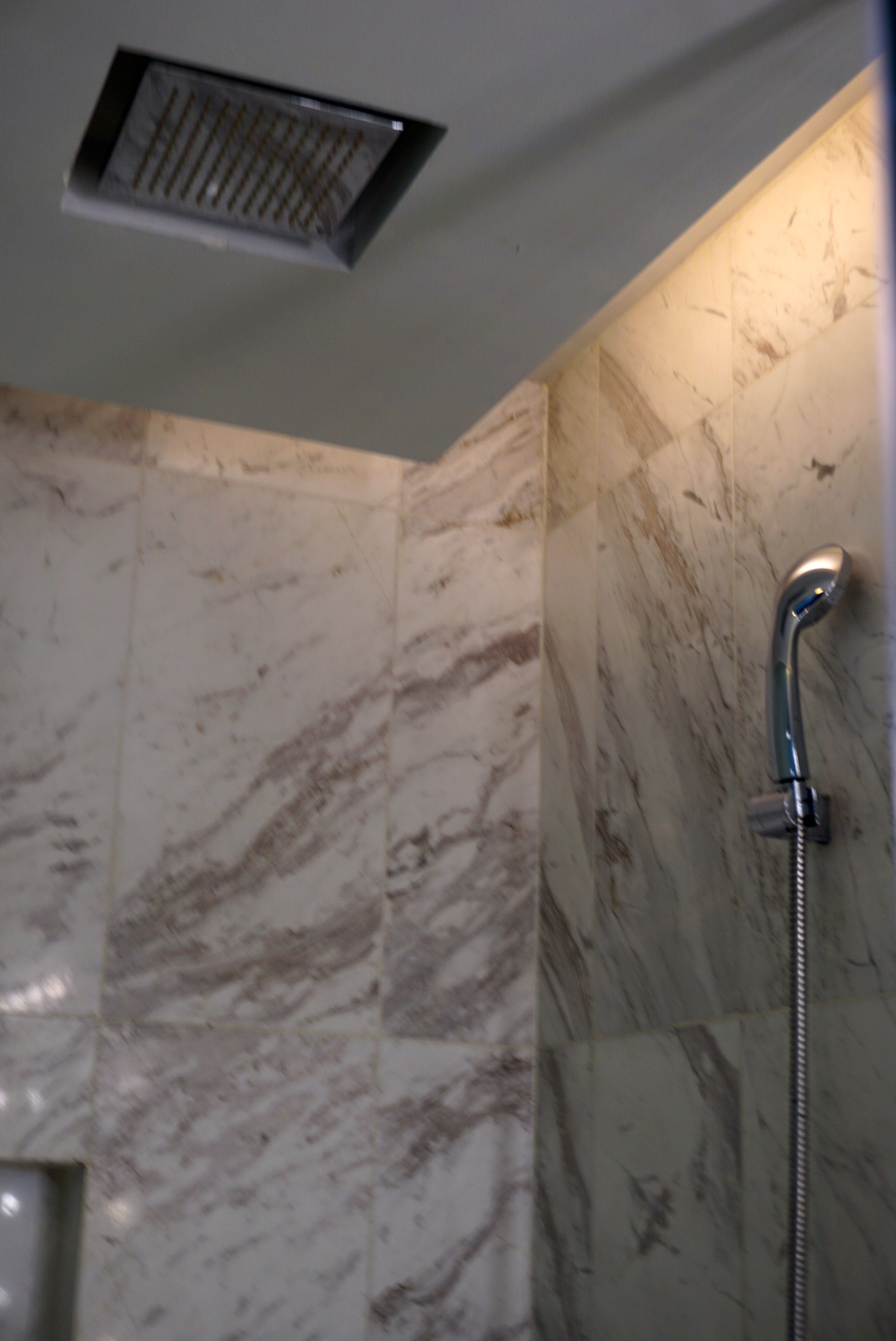 - The walk-in shower is equipped with a rain shower and regular shower head