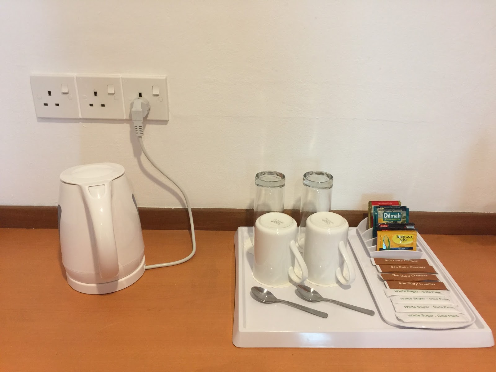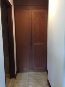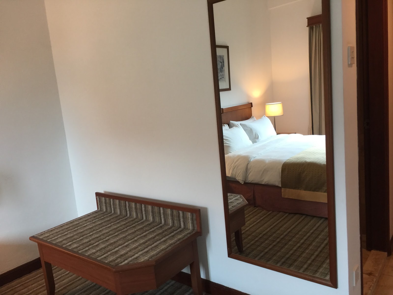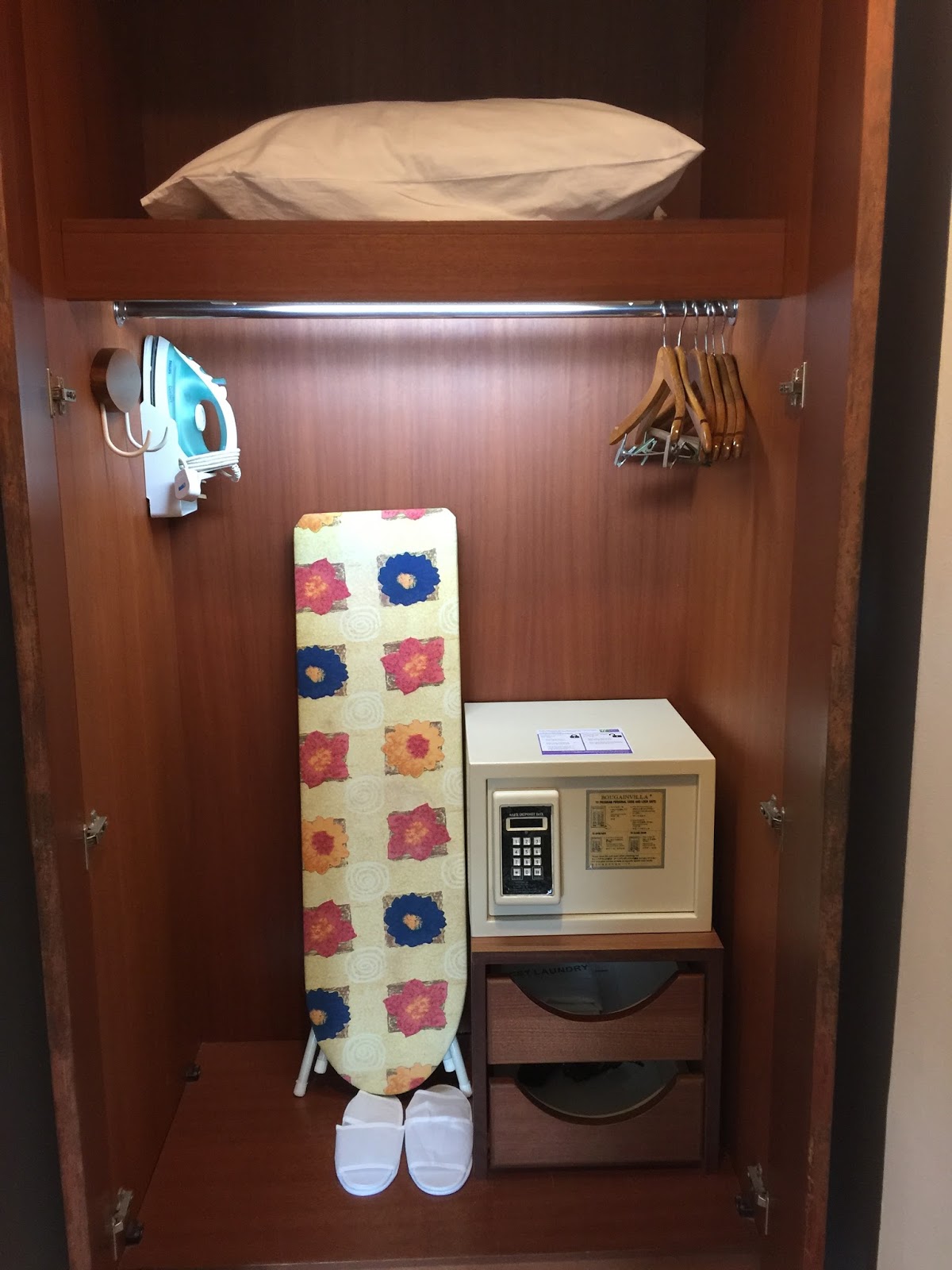 Inside the bedroom, one can find a small corridor that leads to the wardrobe. The wooden wardrobe looks worn, but still serves its intended function of allowing guests to hand their clothing onto. The suite that I stayed does not come with a bathrobe. Other than places to hand clothing, an in-room safe is also found inside the wardrobe.