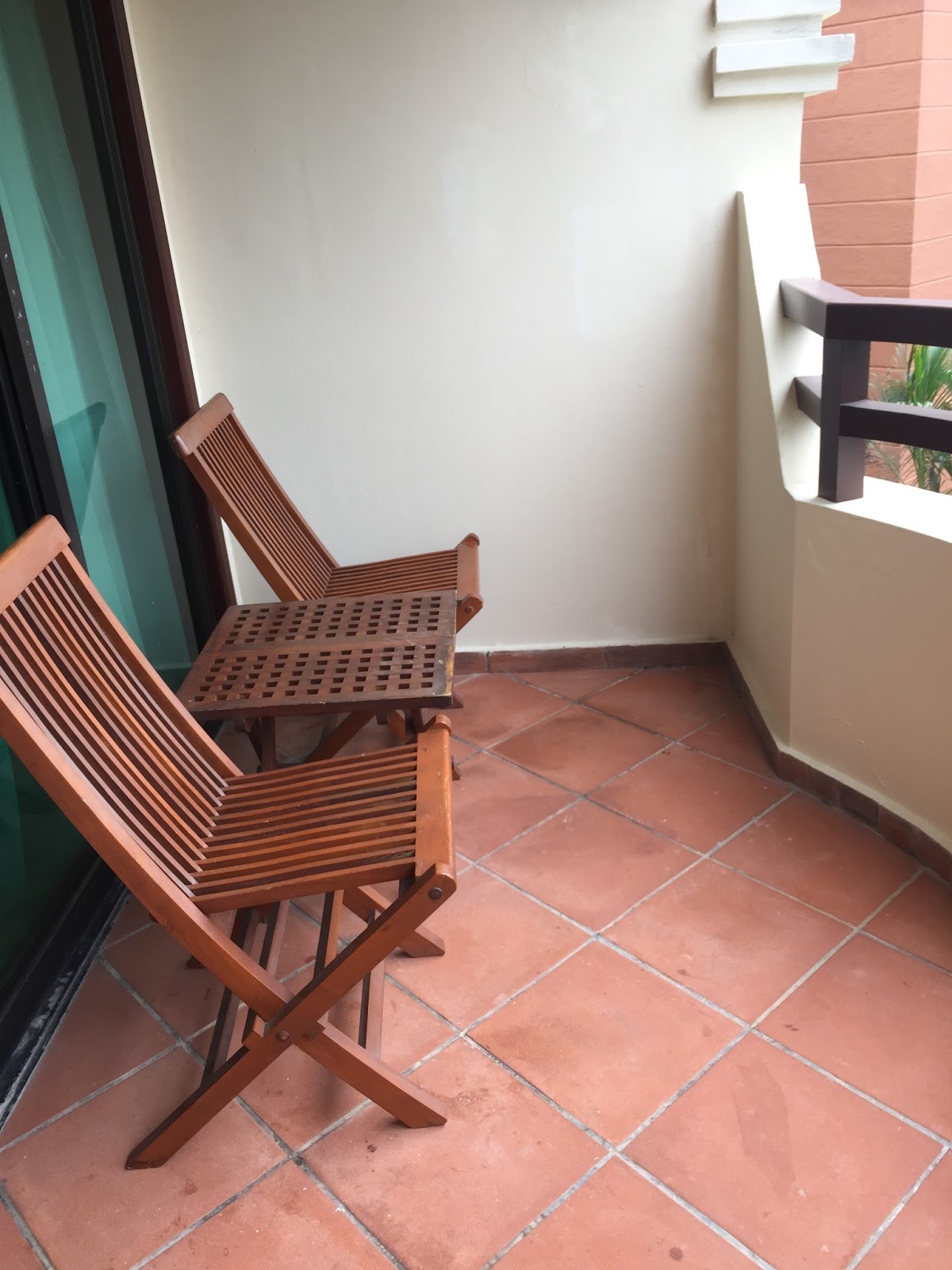 Beyond the living room is a small balcony that overlooks the main swimming pool in Holiday Inn Resort Batam. The balcony is furnished with 2 wooden chairs and a wooden table. The balcony is a great place to hang out and relax.