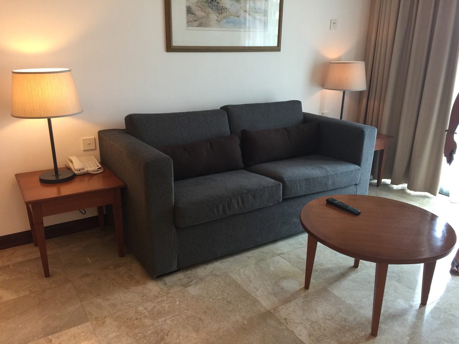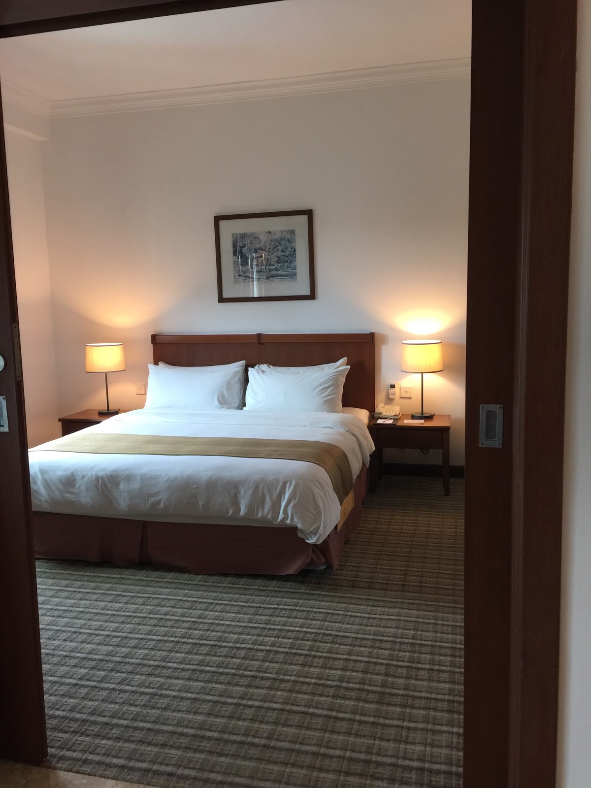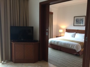 Connected to the dining area further into the suite, is where one will land into the living area. The living area is furnished with a 2 seater couch. A coffee table is placed in front of the couch. Tucked in one corner is where one can find a 32″ LCD TV placed on the TV console. There are no ceiling lightings in the living room, rather it is lighted with a couple of floor lamps, which gave me a warm and cosy feeling in the night with the lights turned on. Similar to the dining area, the living area is furnished with a very minimal number of furniture, making entertaining guests a tad difficult due to the lack of sitting area. The plus side of having only the essential furniture makes the living room look large.