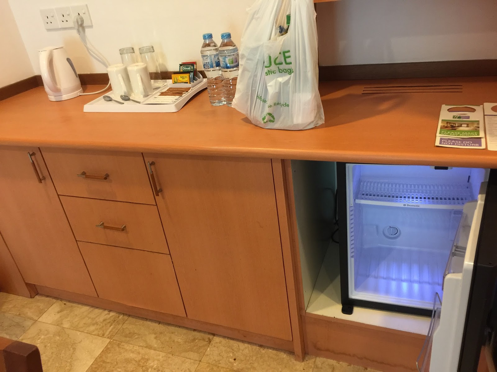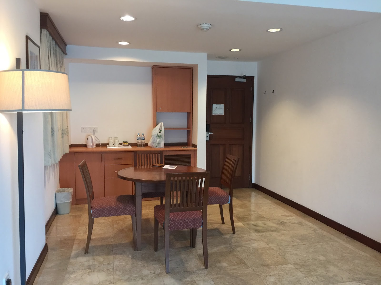 As I entered the 60㎡suite, I immediately entered into the dining area. The dining area of the suite is simply furnished with a round table with 4 chairs. A small kitchenette, built by the walls of the suite is found behind the table, next to the main entrance of the suite. Rather than calling it a kitchenette, this area serves more like a pantry where one can find an electric kettle and a container where complimentary drinks such as coffee, tea and a couple of drinking water welcomed guests. The mini-fridge is well hidden inside one of the cabinets here. There are several cabinets in the pantry area, however, these cabinets are empty, which makes this area seem poorly furnished.