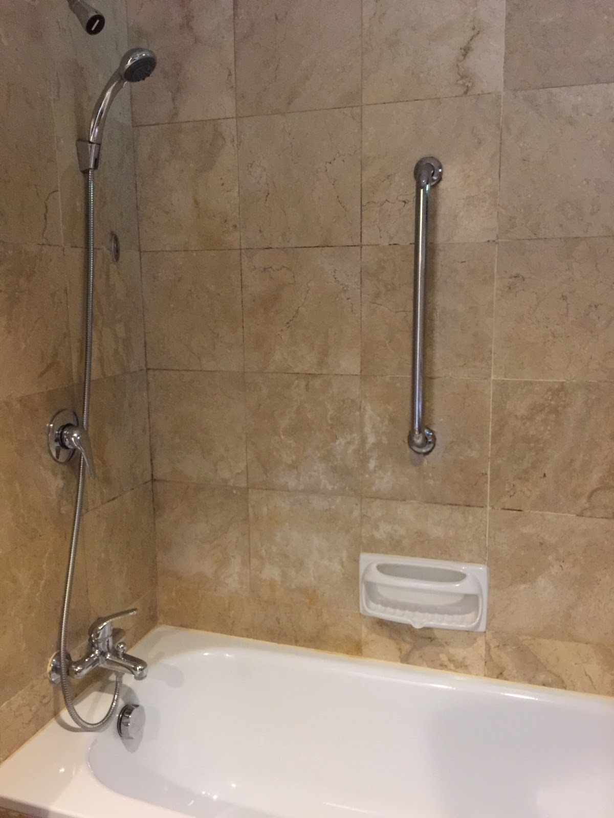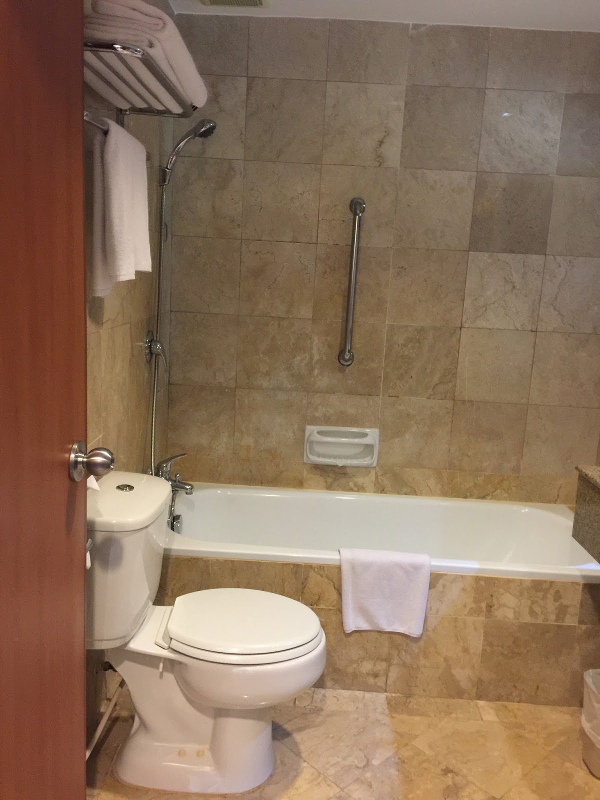 The entrance to the bathroom is located next to the wardrobe. The bathroom is rather small for a suite. The toilet bowl seems to cramp beside the bathtub, which is also where guests would take their shower in. There are no separate walk-in shower stalls. Opposite the toilet bowl is where one would find the sink. The sink area provides sufficient space for guests to stow their toiletries. There are no power sockets in the bathroom for guests to charge their shaver. The hotel seems to undergo some form of cost-cutting measures. Holiday Inn uses standard house brand toiletries throughout the world. However during my stay, only a single bottle of shampoo is their house brand, the other bath amenities are not that of the Holiday Inn brand amenities.